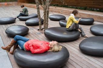 設(shè)計(jì)師對(duì)直徑2-3厘米的小河石進(jìn)行了掃描建模,然后將其放大并按照人體工學(xué)進(jìn)行輕微調(diào)整,最終得到了這些形狀天然有機(jī)的“石塊”。它們由玻璃纖維混凝土制成,外層僅1英寸厚,內(nèi)部中空,因此自重較輕。
