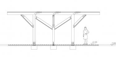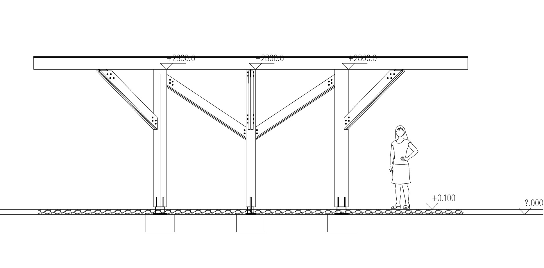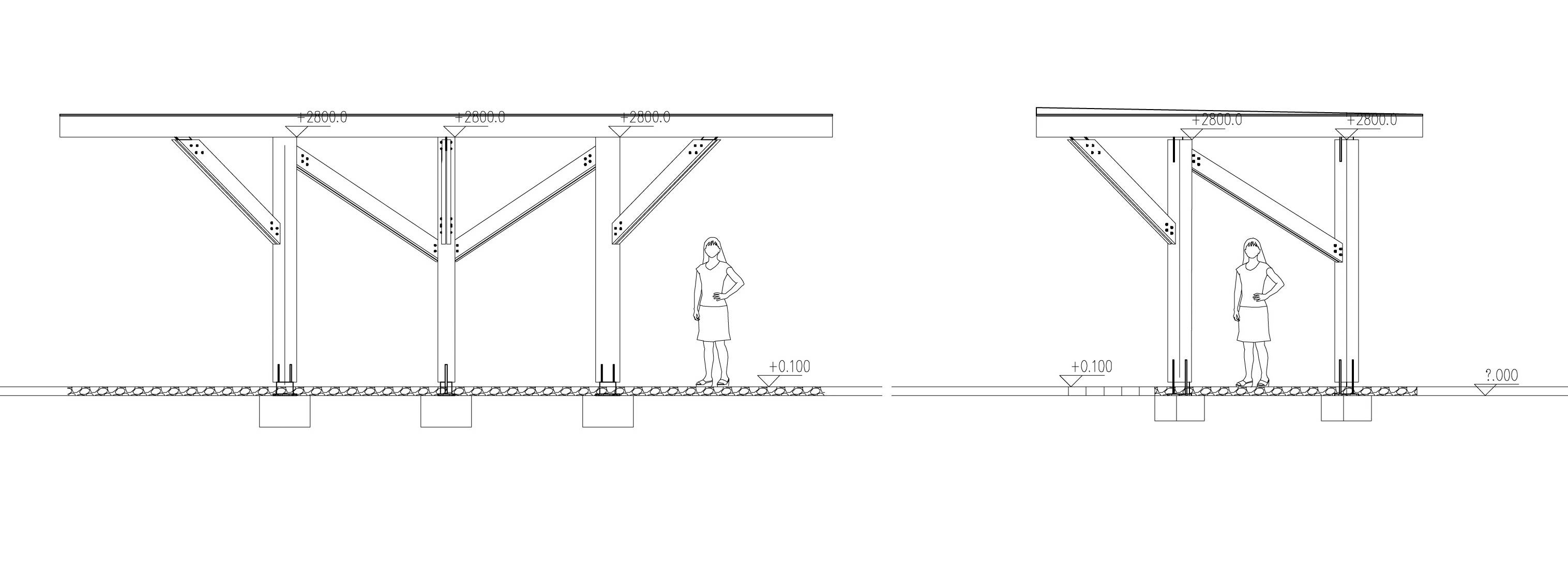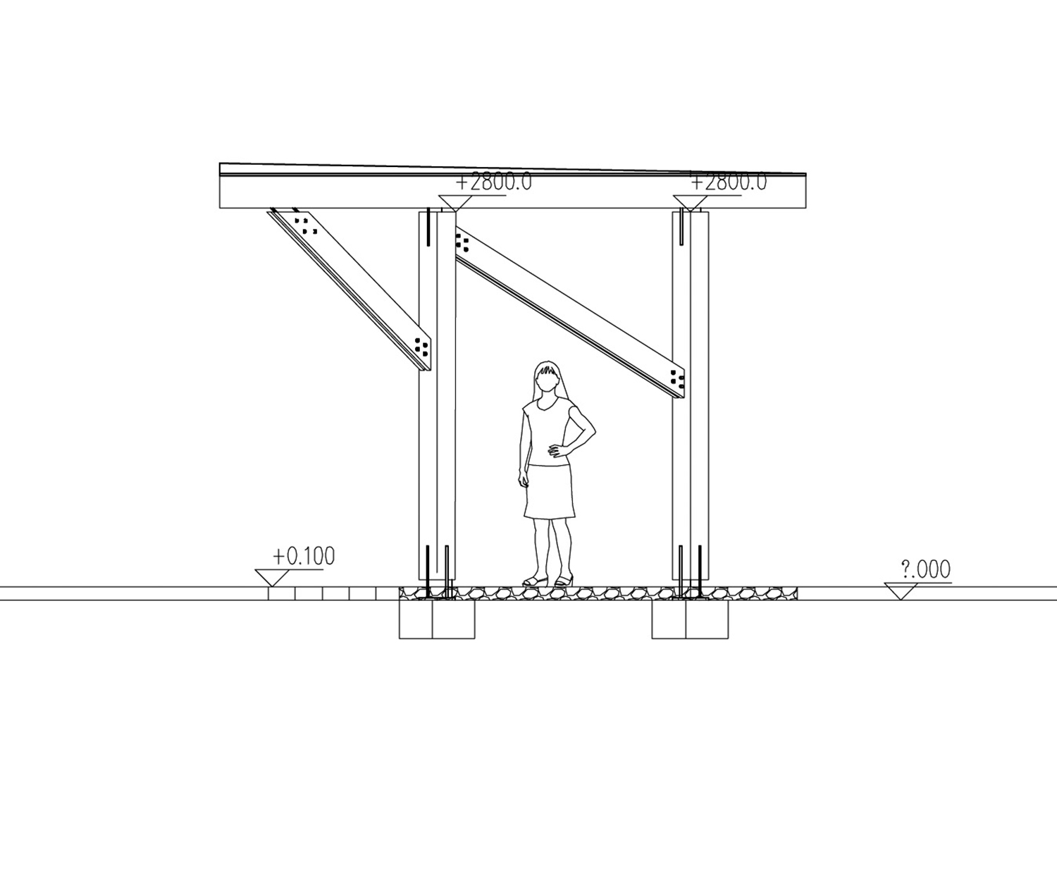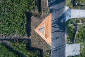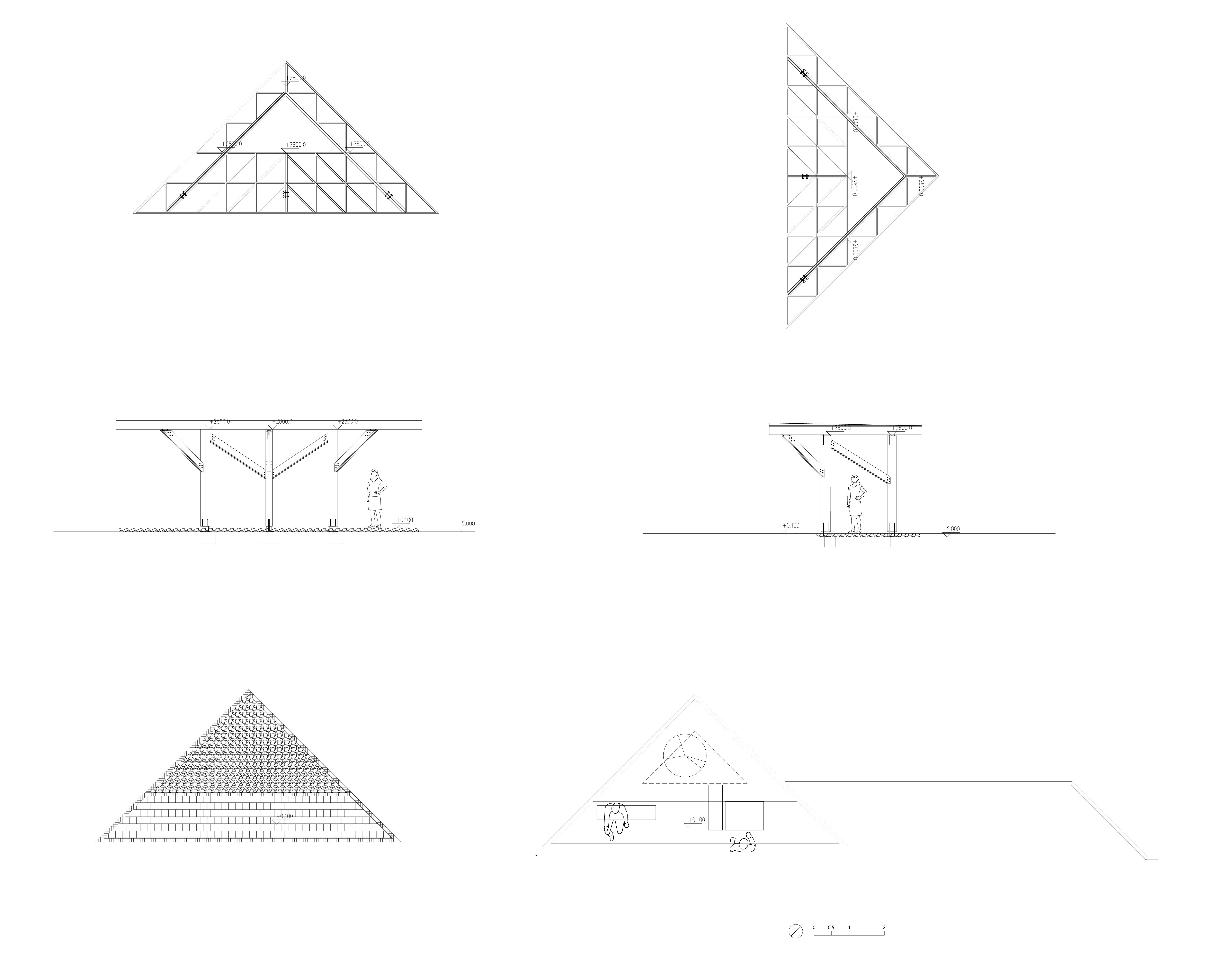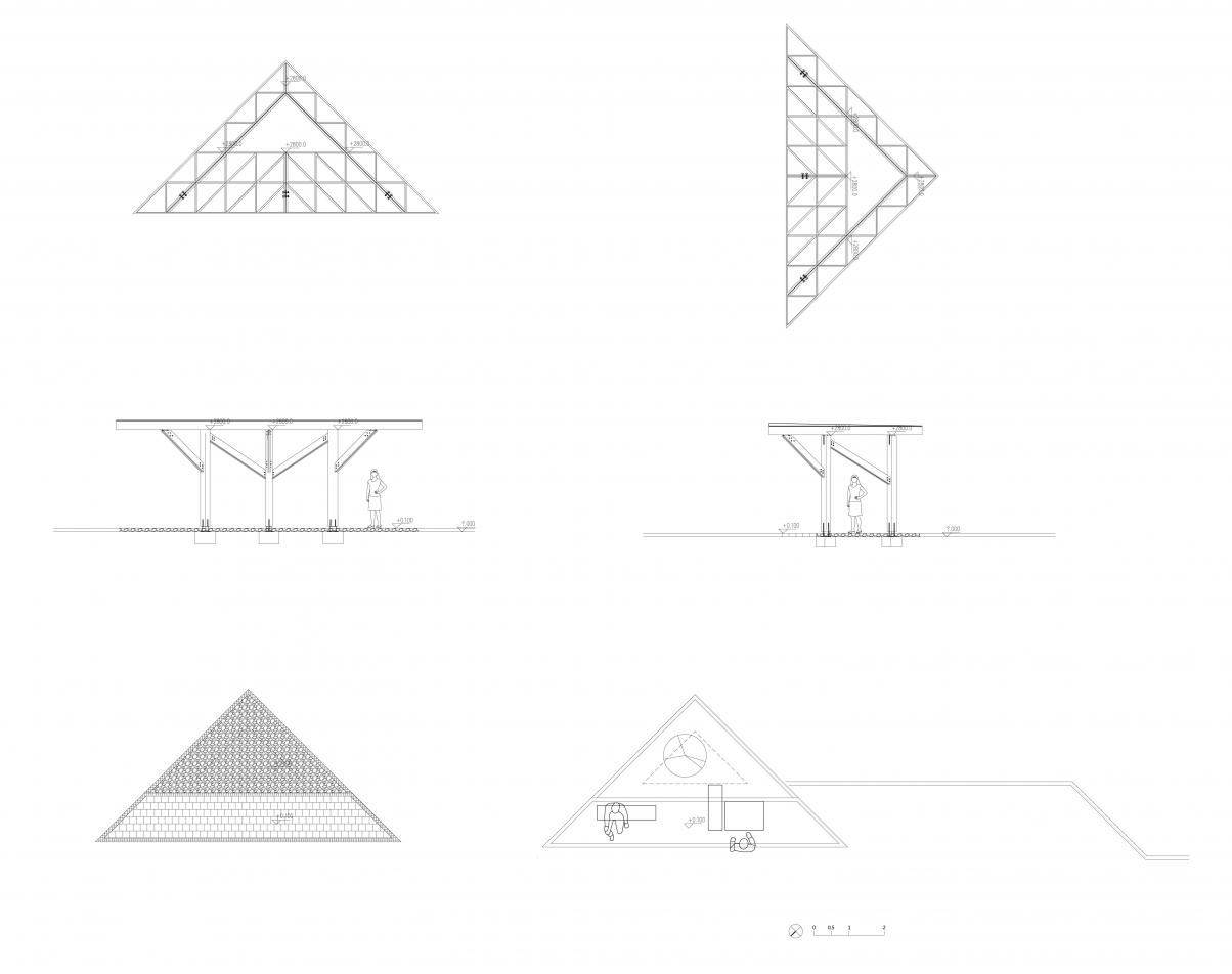 半方亭平面上三角形的長邊與騎行道路垂直,正立面上長邊與車行道路平行,提供一個最大長度和水平的邊緣朝向騎行與步行的人們。亭子中間有一個三角形的孔洞,下方種植一棵小型喬木,將陽光雨水引入驛站內(nèi)部。坐凳的設(shè)計也采用了三角形作為設(shè)計元素,可供五到七人同時休息。地面材料為深灰色瓜子片,使候車的人們能夠體驗到柔軟放松的感覺。