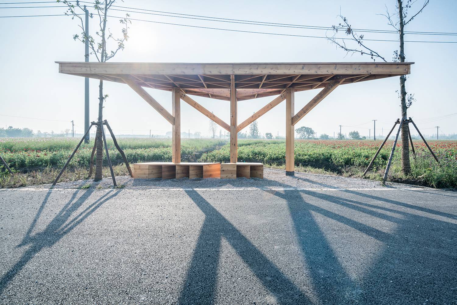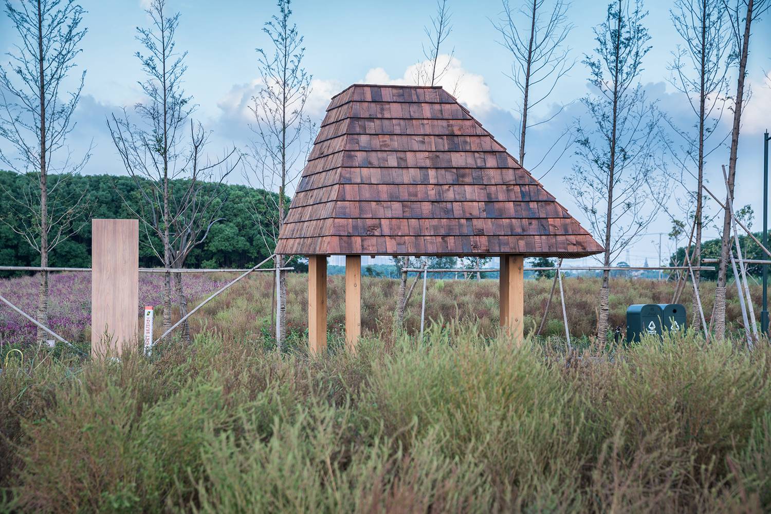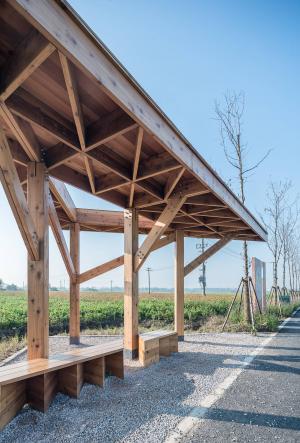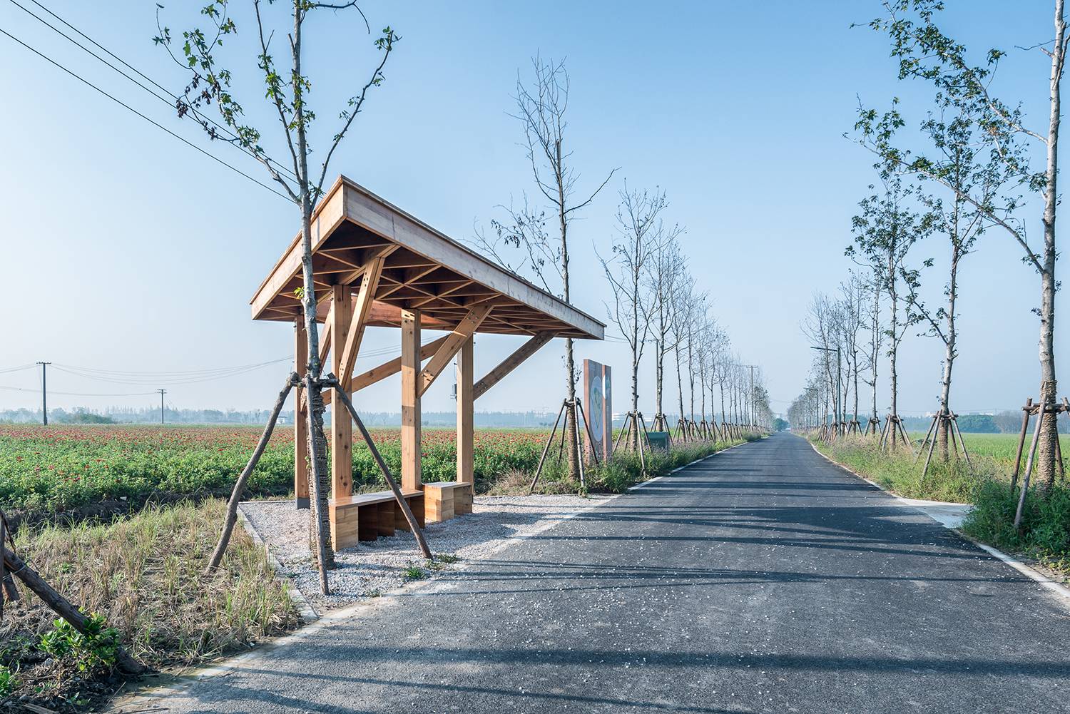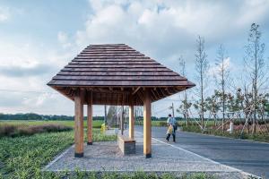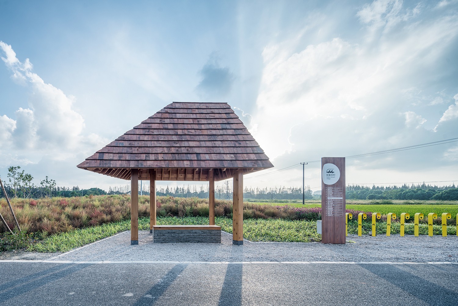 為補(bǔ)充郊野公園內(nèi)公交等候設(shè)施和風(fēng)貌景觀需求,張斌、莊慎和馮路等建筑師作為顧問,邀請了上海和蘇州的多家年輕建筑師團(tuán)隊——旭可建筑、一棟建筑、未相景觀、本構(gòu)建筑和冶是建筑等參與設(shè)計了公園內(nèi)的多個驛亭景觀構(gòu)筑物,并于2017年中旬,配合嘉北郊野公園正式開園活動建成。