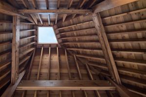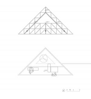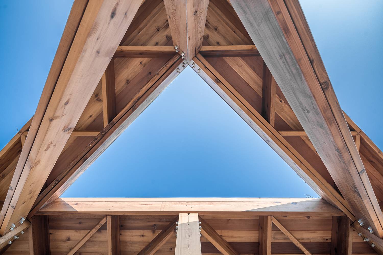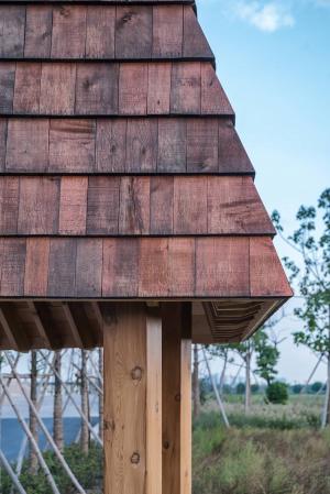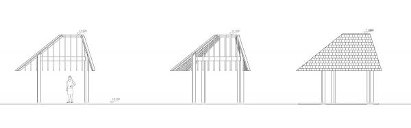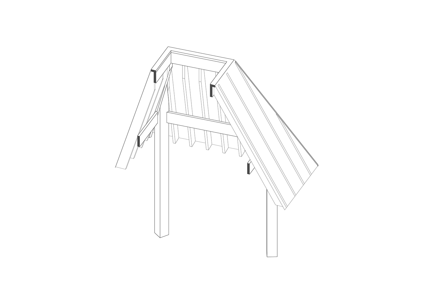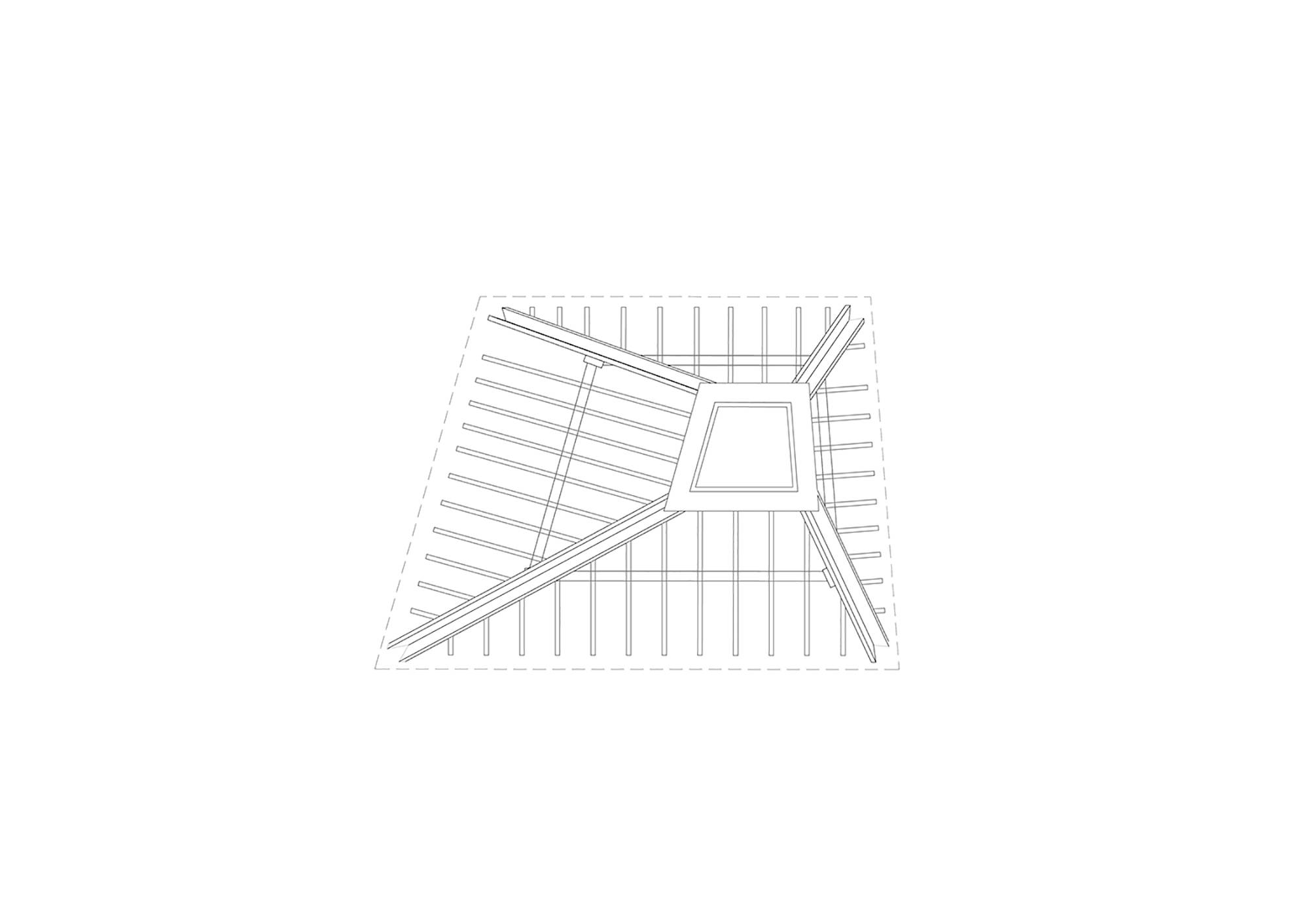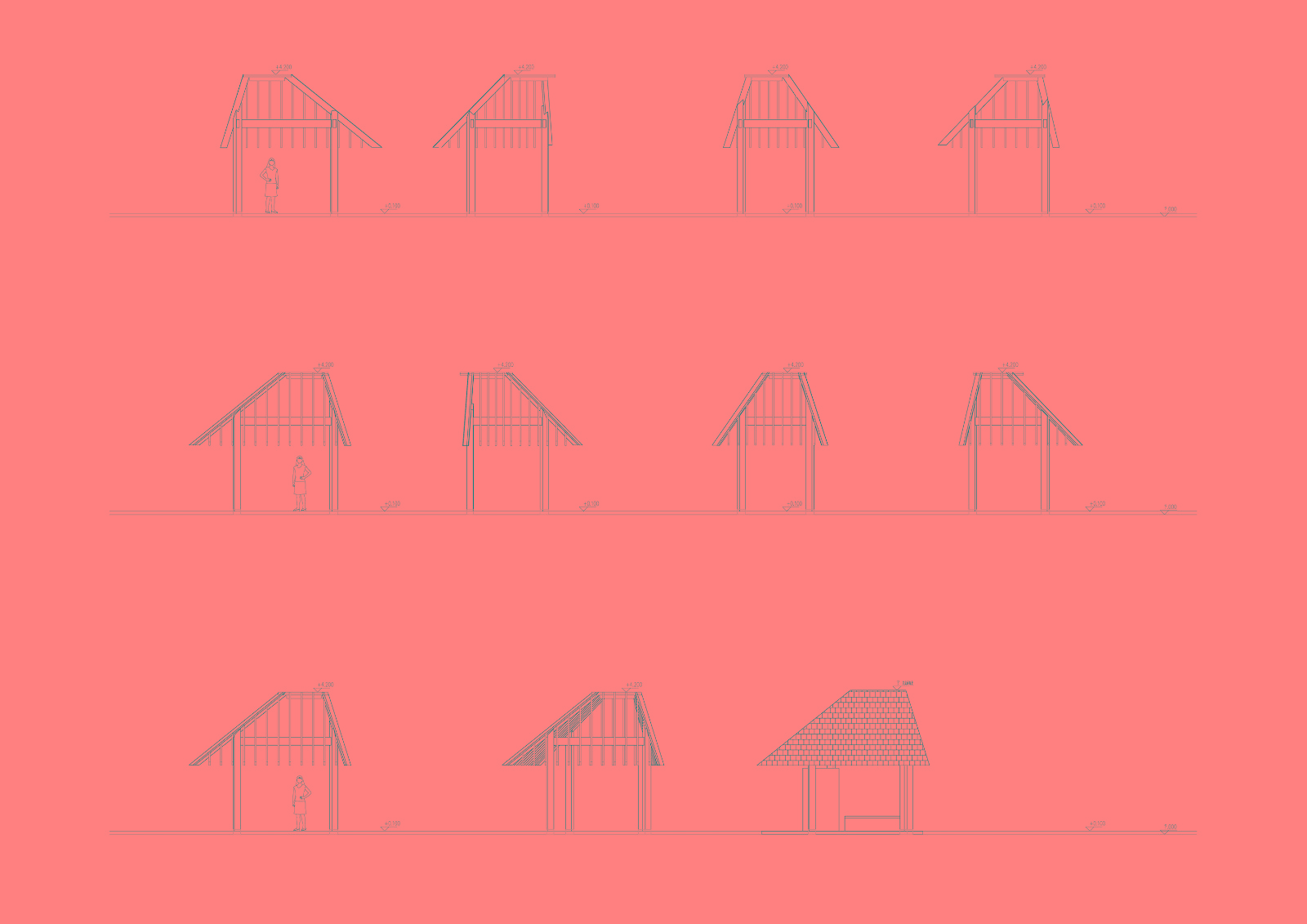 之所以叫半方亭是因其以直角三角形中軸對稱的作為平面,正好是一正方形的對半。我們以四根立柱加斜撐支起屋面,屋面為平屋頂,材料為復(fù)合木梁組成的平面網(wǎng)架,表面鋪防水木片瓦。