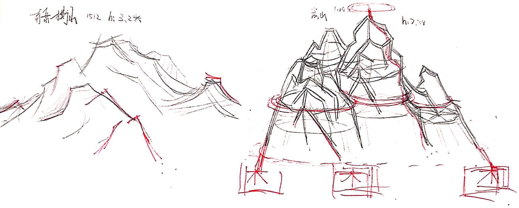 古蜀國在山海經中,有最早先王魚鳧的記錄。草山海,是依據山海經圖布局。中原是圓形水池。東泰、西華、北岳是三大山。我們把地圖壓縮成東方審美的新園林,說的是,天下。