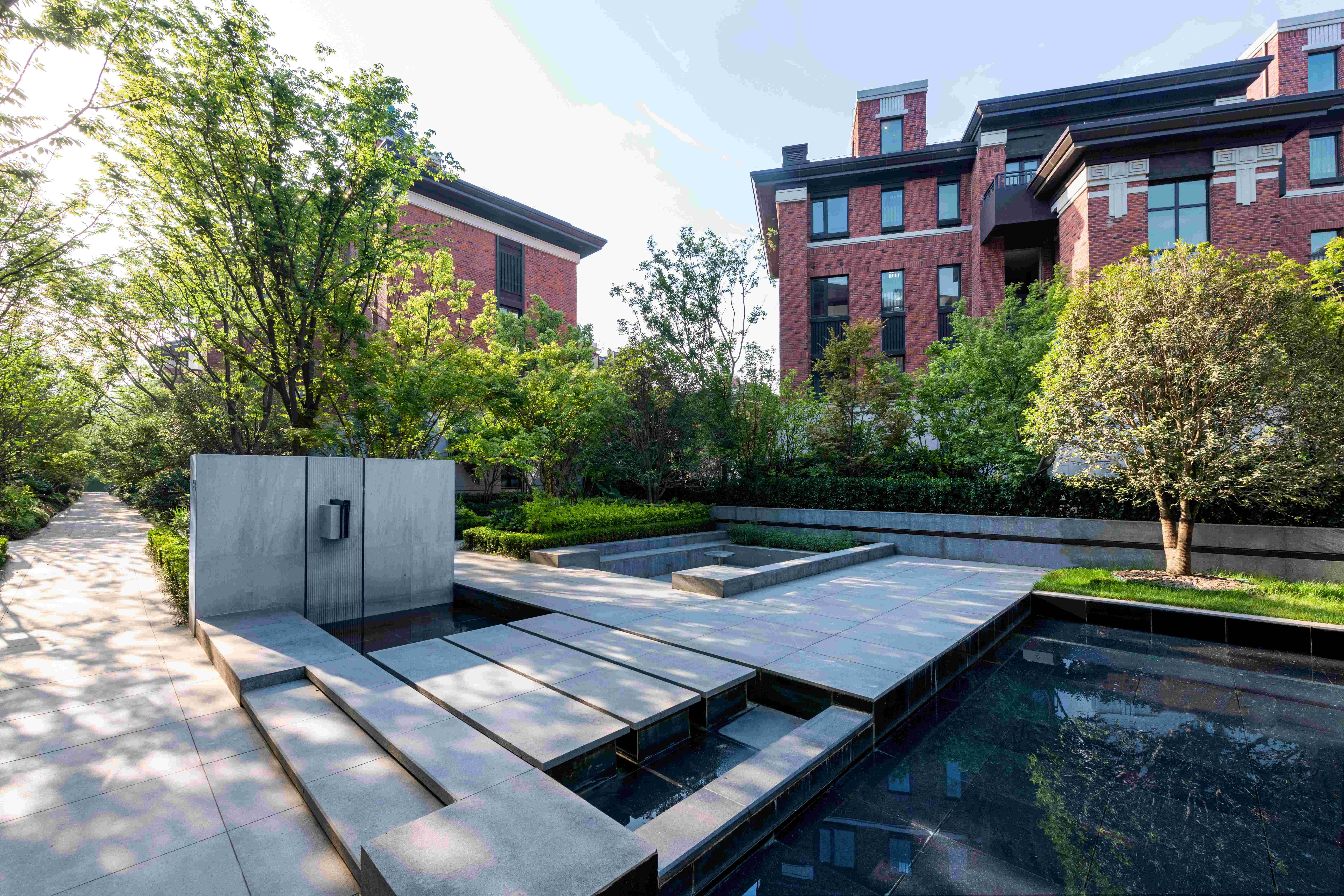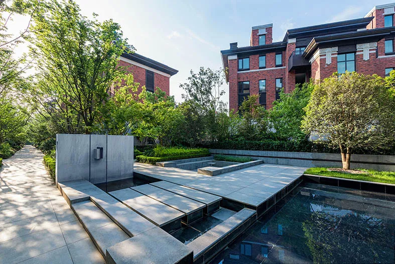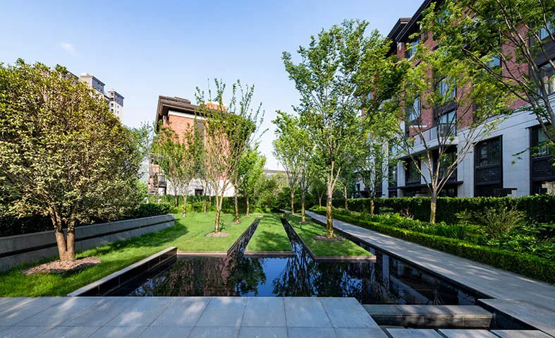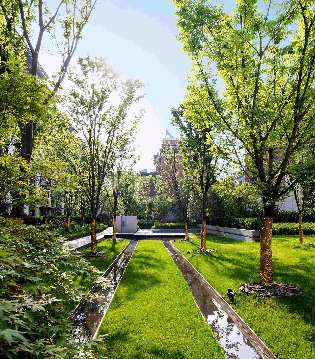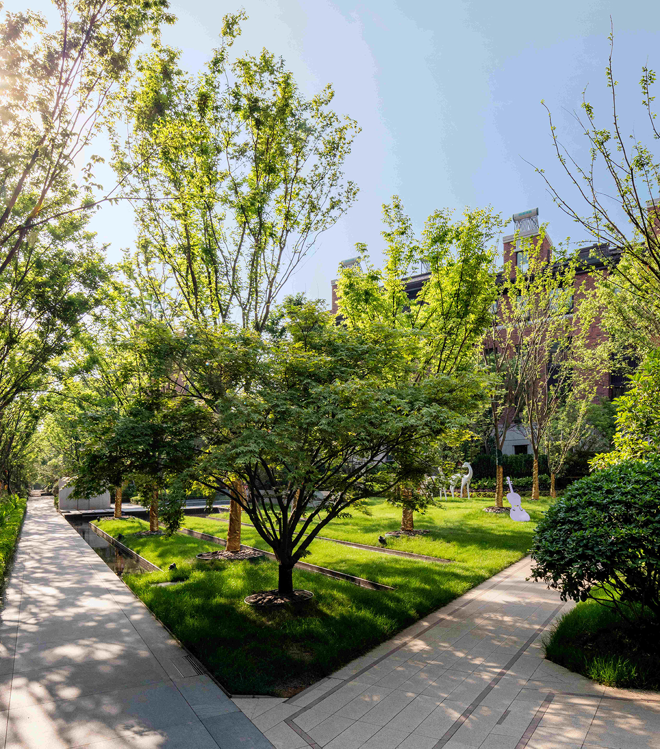 線條感流暢的樹池水池排列分布,簡約大氣的空間分割,營造出綠意簡潔的花園空間。細(xì)碎的陽光透過婆娑的樹枝,水面上光影斑駁,溫暖的風(fēng)吹過,漫步在林蔭道下,我們感受到寧靜自然的雅致空間。以安靜取代喧嘩,以精致取代粗鄙,以回歸本真的生活美學(xué)取代浮光掠影的人生秀場。