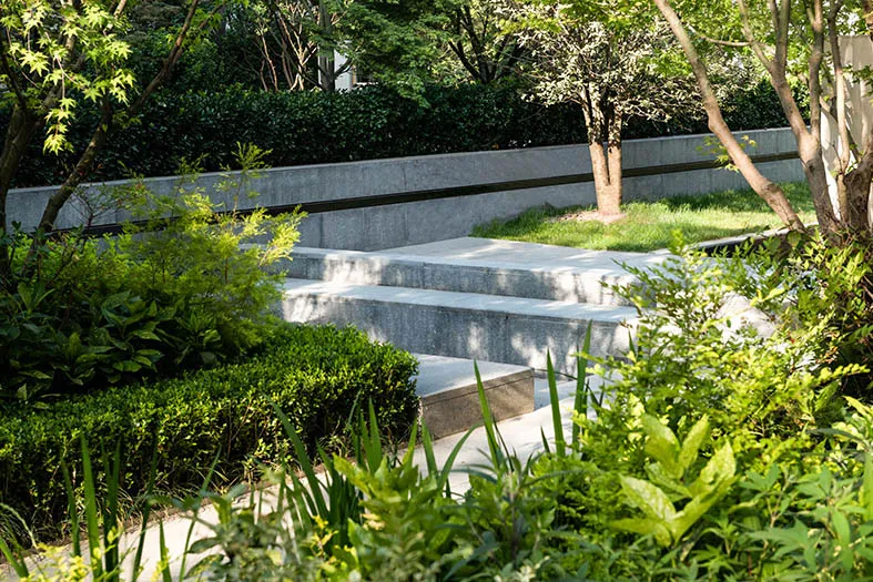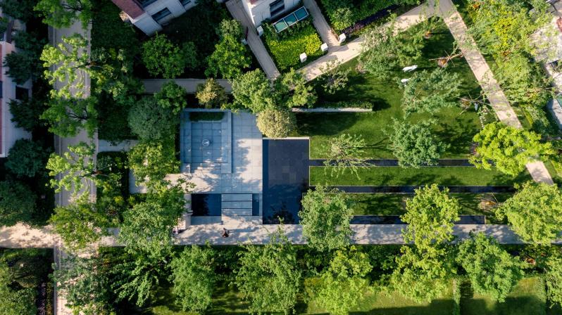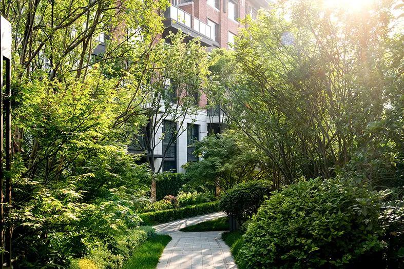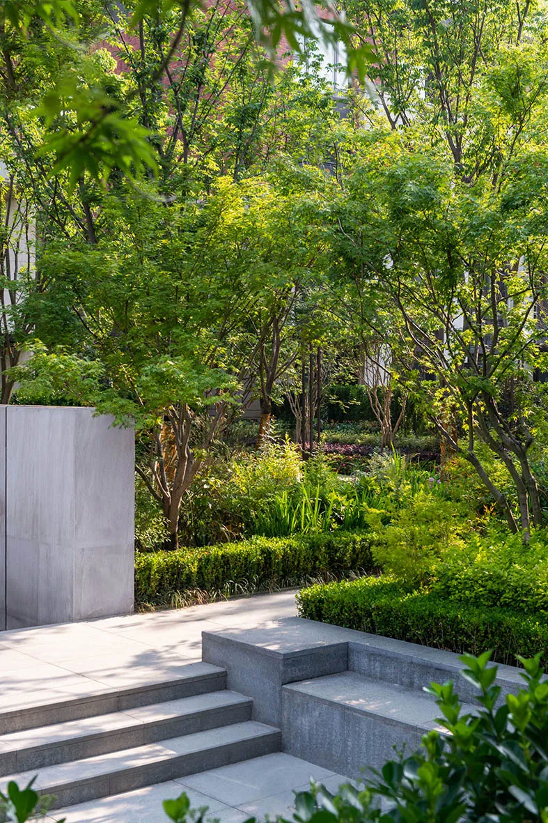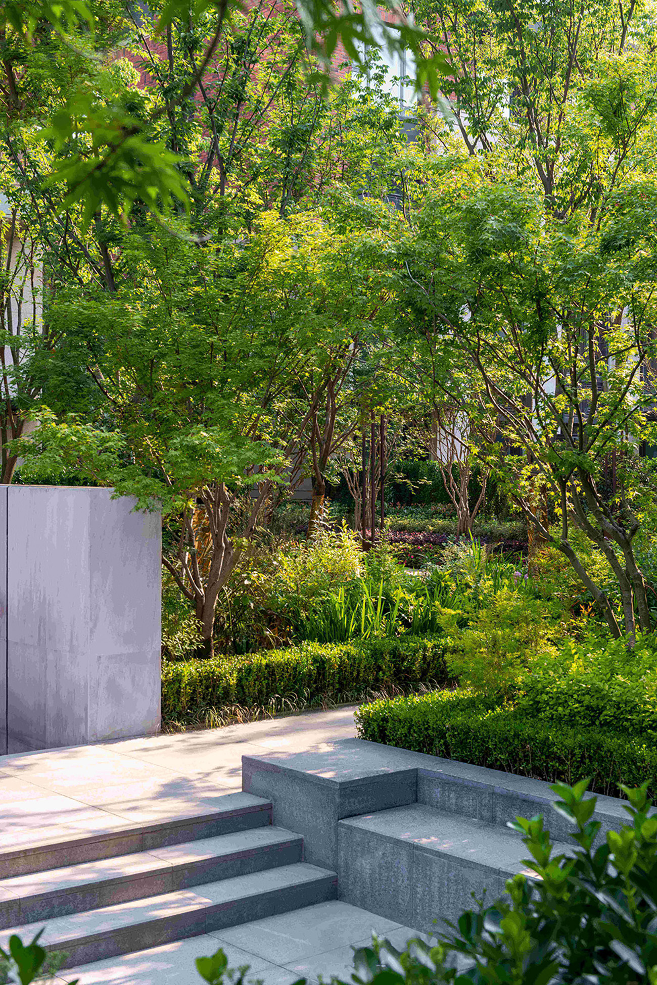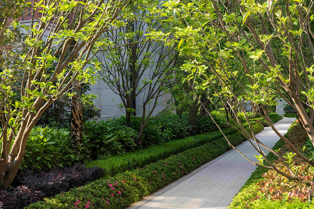 線條感流暢的樹池水池排列分布,簡約大氣的空間分割,營造出綠意簡潔的花園空間。細(xì)碎的陽光透過婆娑的樹枝,水面上光影斑駁,溫暖的風(fēng)吹過,漫步在林蔭道下,我們感受到寧靜自然的雅致空間。以安靜取代喧嘩,以精致取代粗鄙,以回歸本真的生活美學(xué)取代浮光掠影的人生秀場。