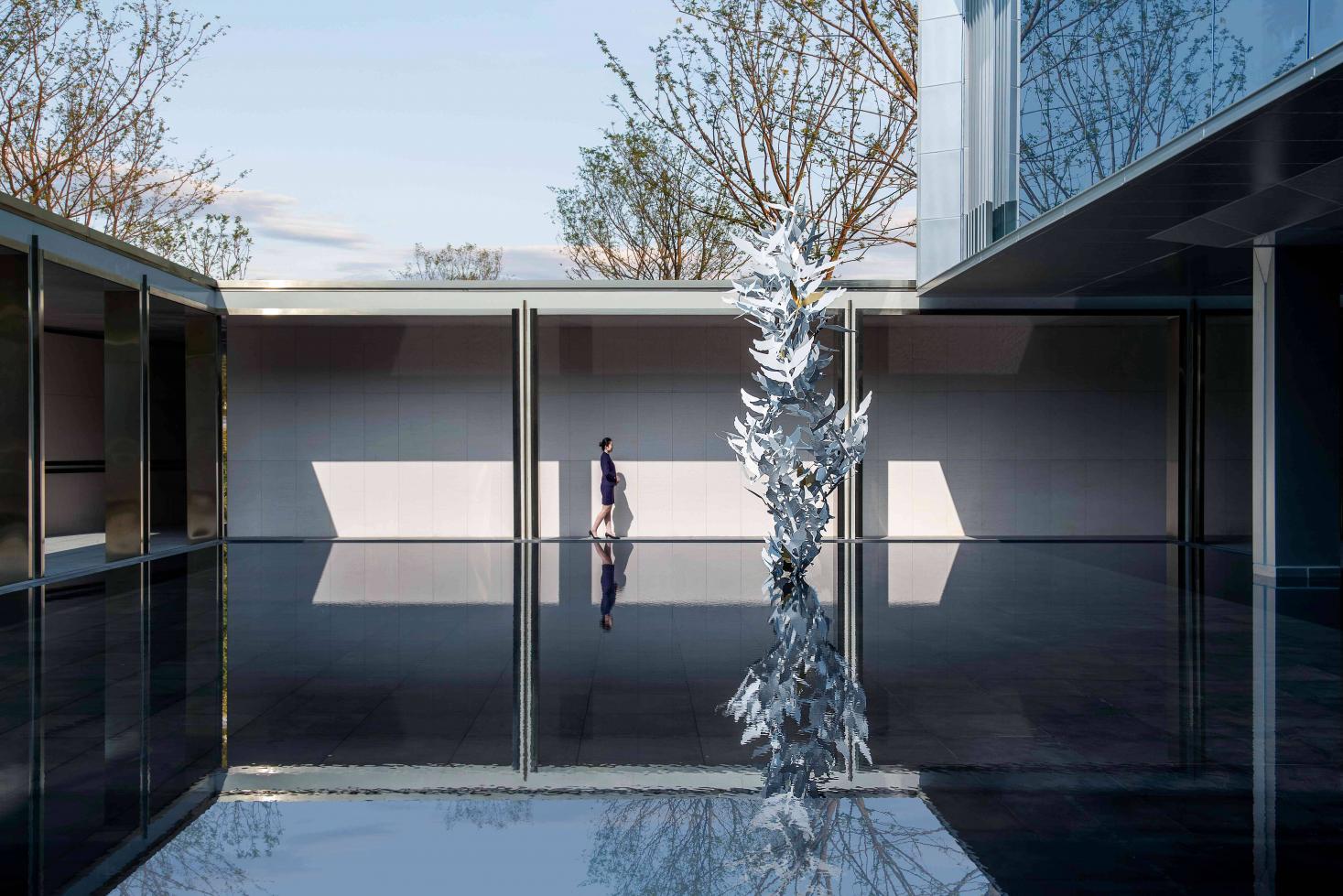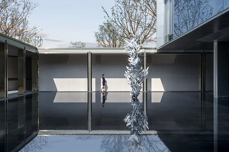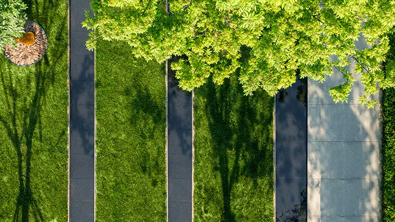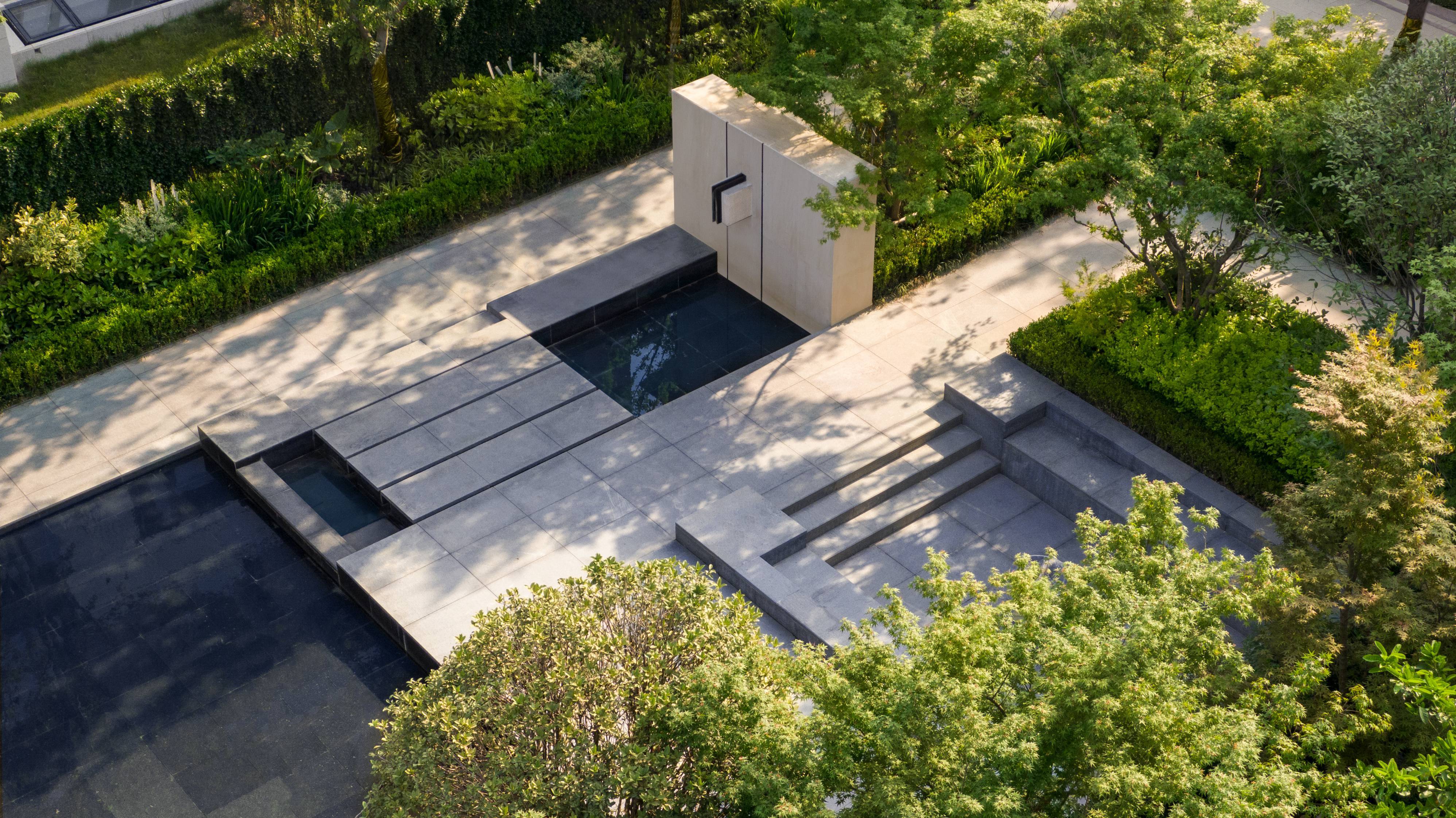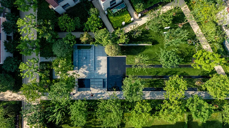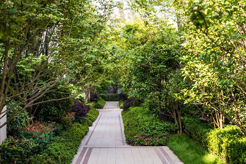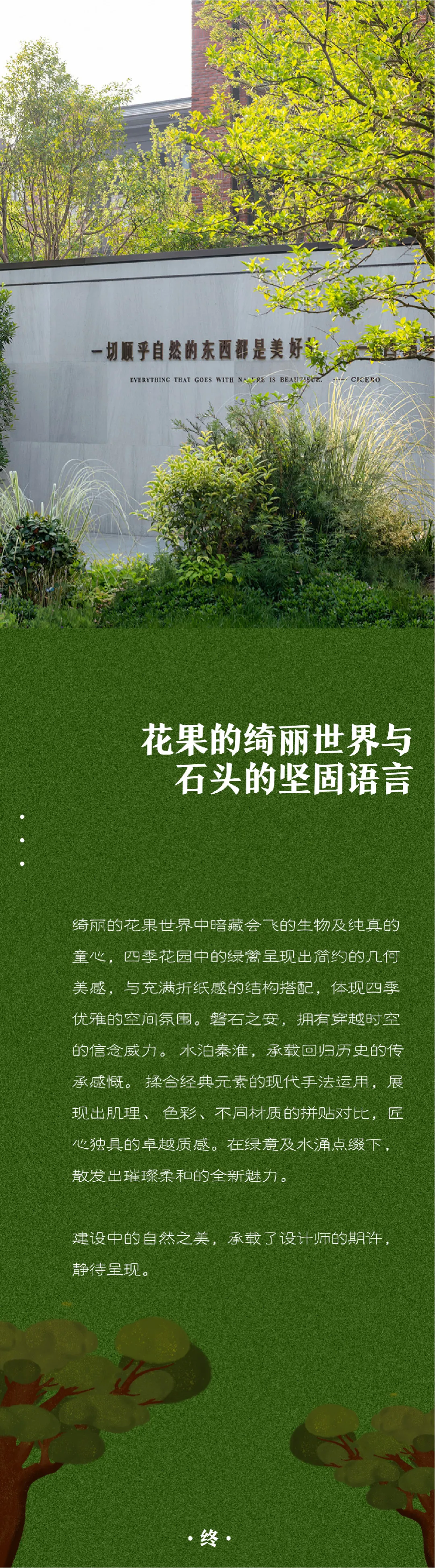 線條感流暢的樹池水池排列分布,簡約大氣的空間分割,營造出綠意簡潔的花園空間。細(xì)碎的陽光透過婆娑的樹枝,水面上光影斑駁,溫暖的風(fēng)吹過,漫步在林蔭道下,我們感受到寧靜自然的雅致空間。以安靜取代喧嘩,以精致取代粗鄙,以回歸本真的生活美學(xué)取代浮光掠影的人生秀場。
