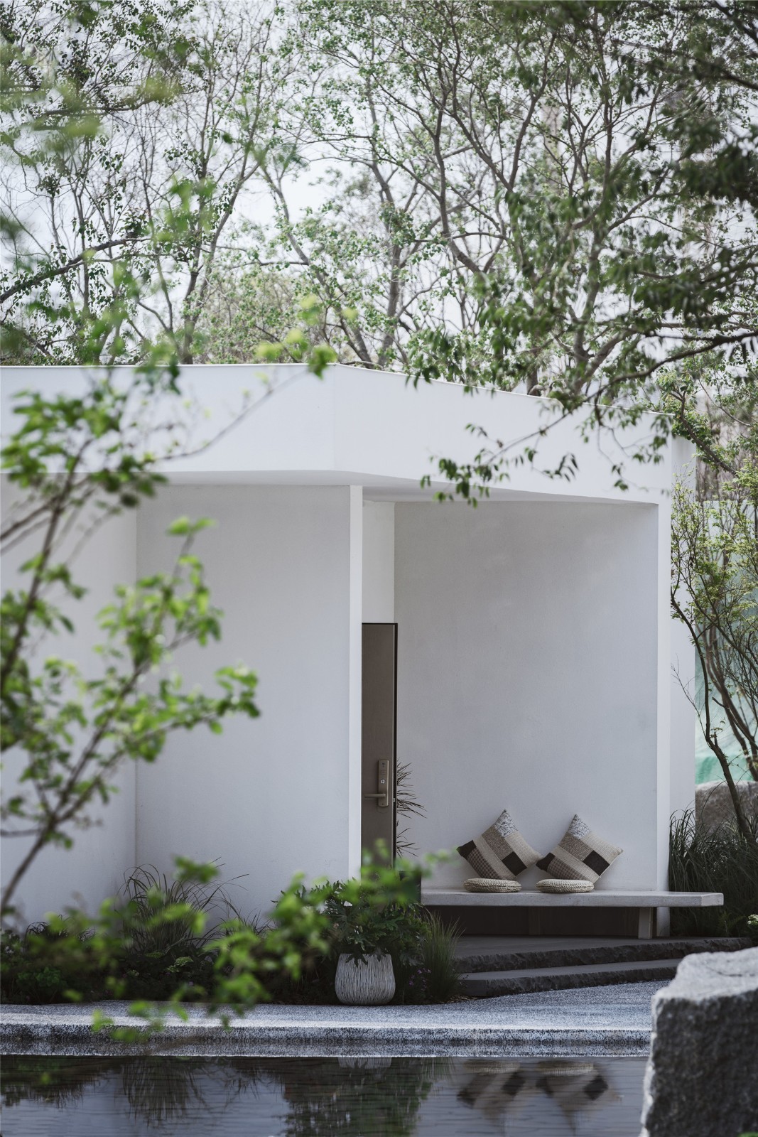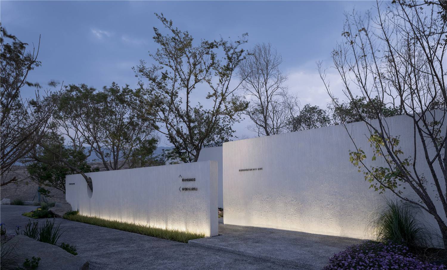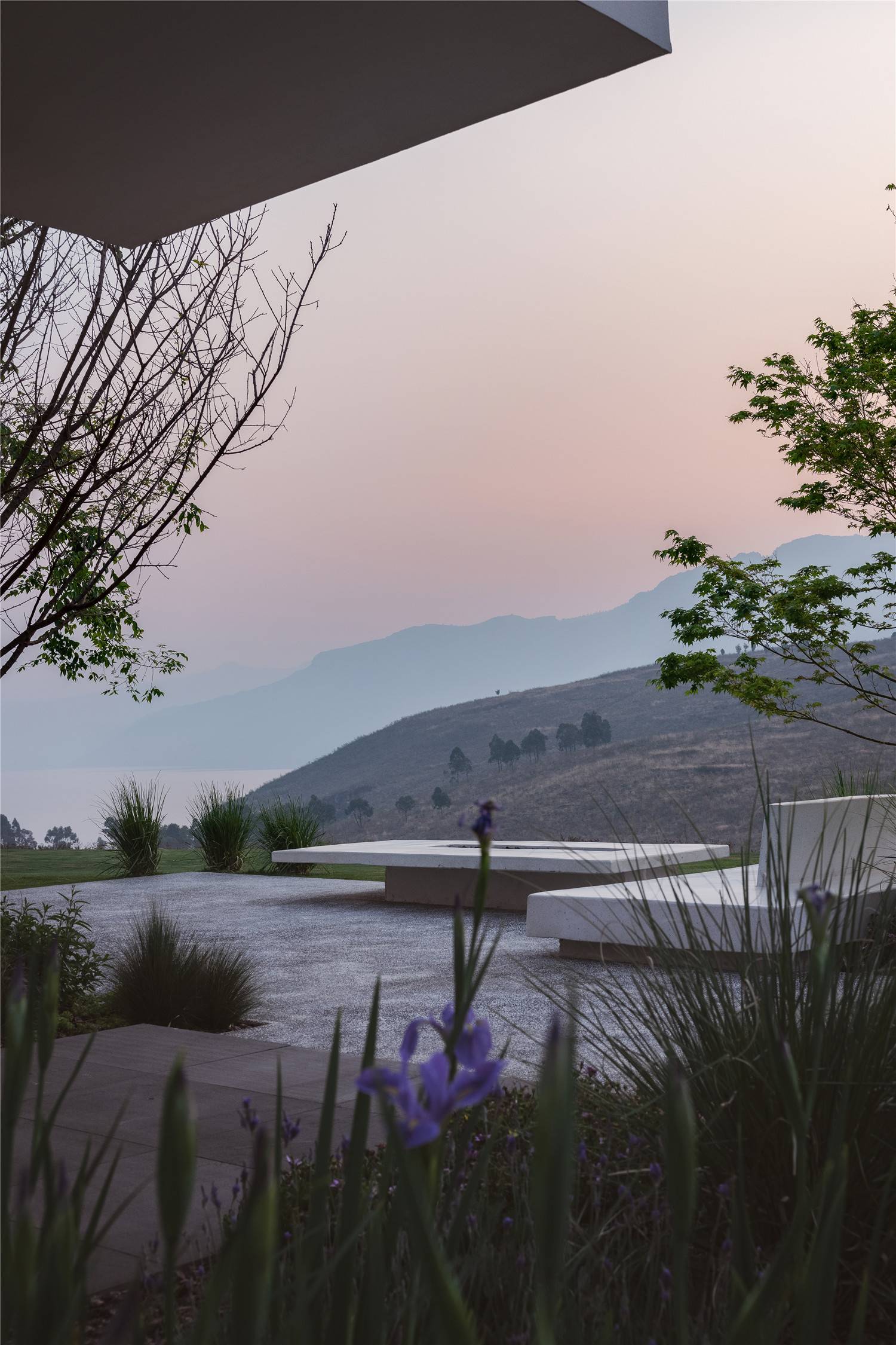 For the outdoor site of only more than 2,000 square meters, the landscape construction, the design of life scenes, the extraction of elements, the volume, material, color of the space, etc. all come from this lake and mountain, and return to this lake and mountain. The entrance design uses a series of walls to form a serpentine courtyard to limit the space. The wall conforms to the natural flow, so that the sight can be guided, and the behavior experience of the space can be specific and subtle, living in the present.