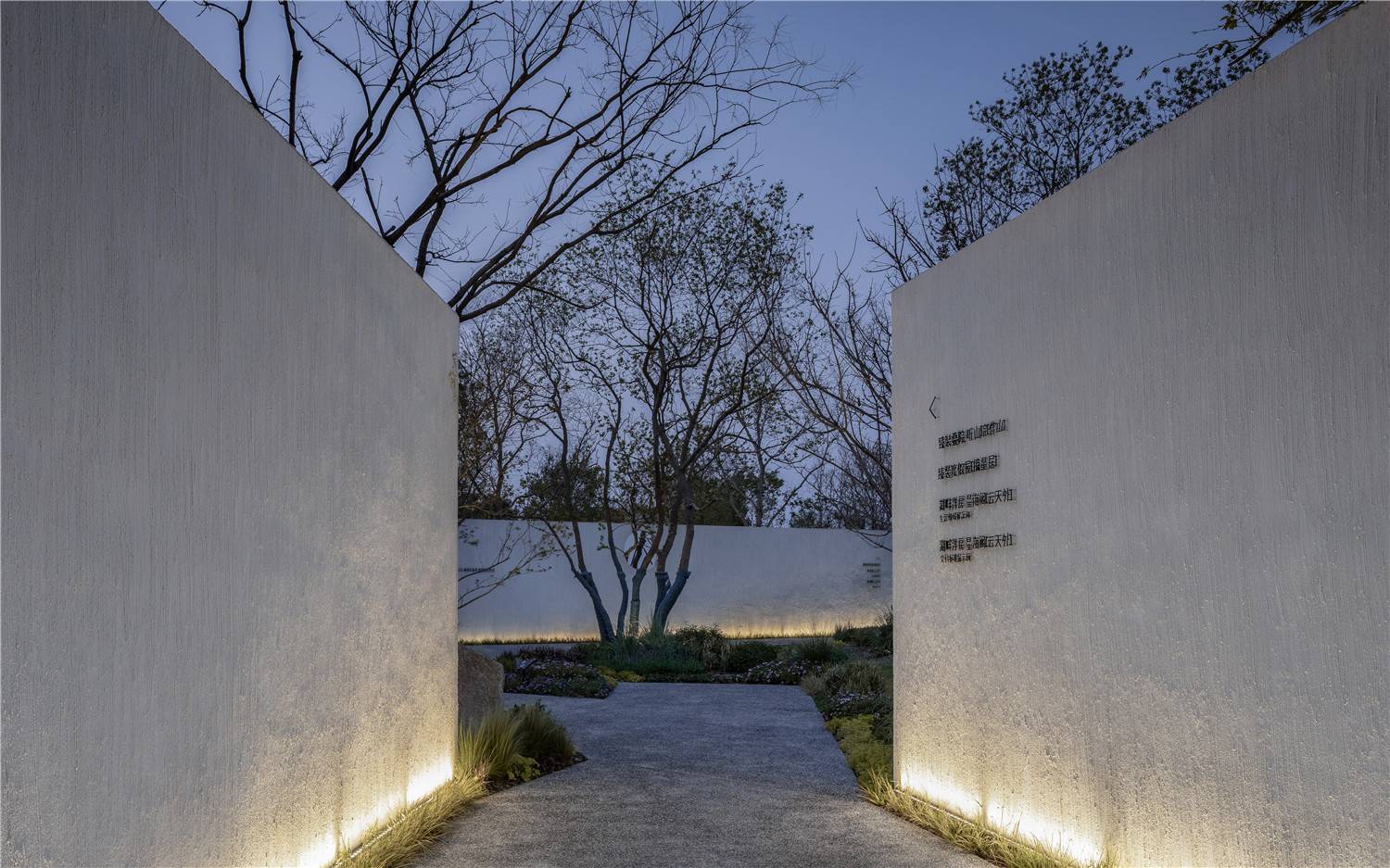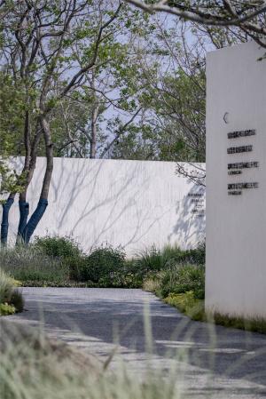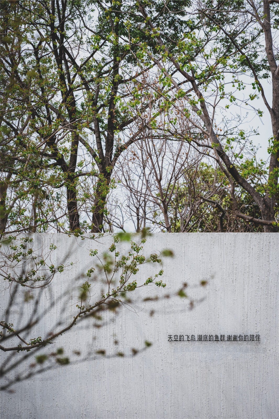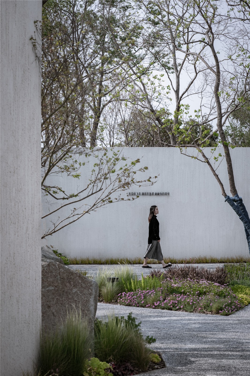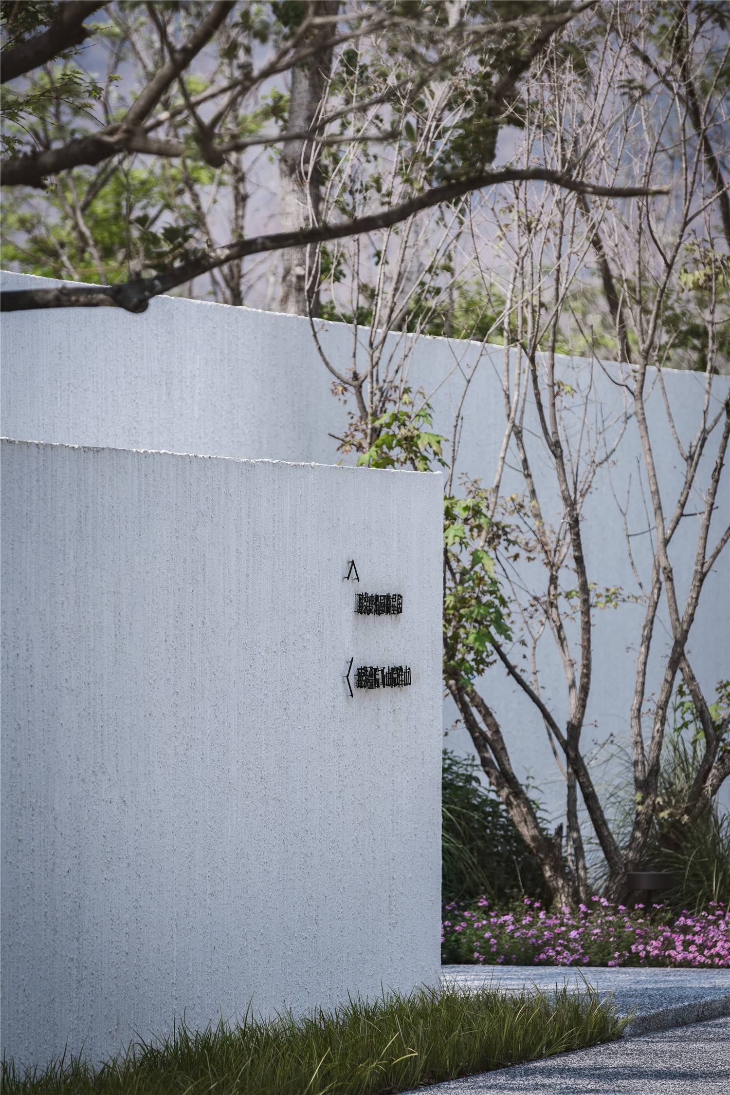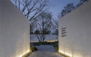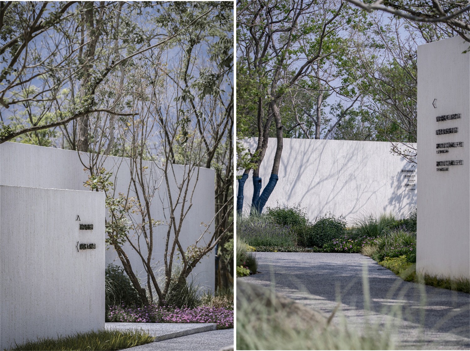 對于僅2000多平米的戶外場地進行景觀營造,生活場景的設計,元素的提取,空間的體量、材質、色彩等無一不是從這片湖山中來,又回到這湖山中去。入口設計通過一系列的墻體形成蜿蜒的庭院,以此限定空間,墻體順應自然流動的結果,讓視線可以被引導,空間的行為體驗也可以具體而微,安住在當下。