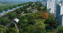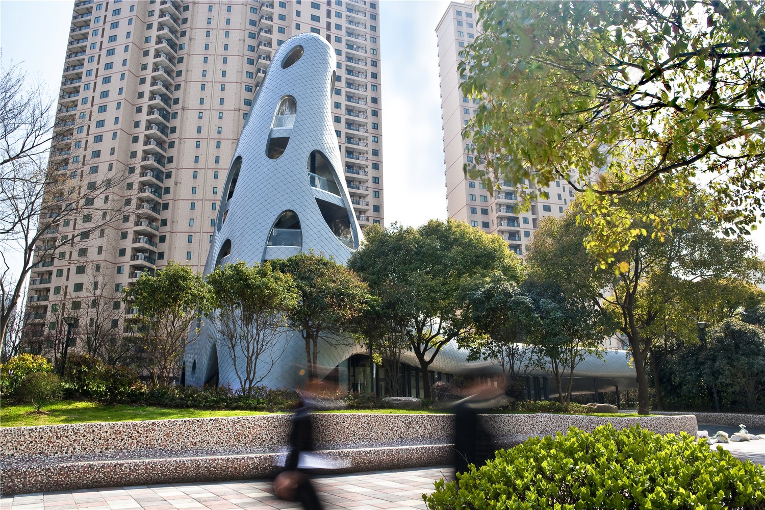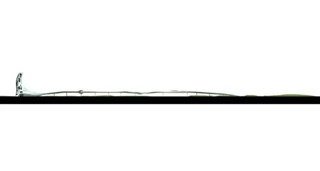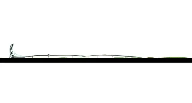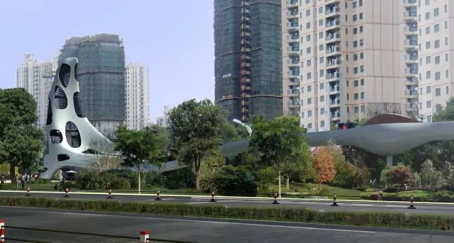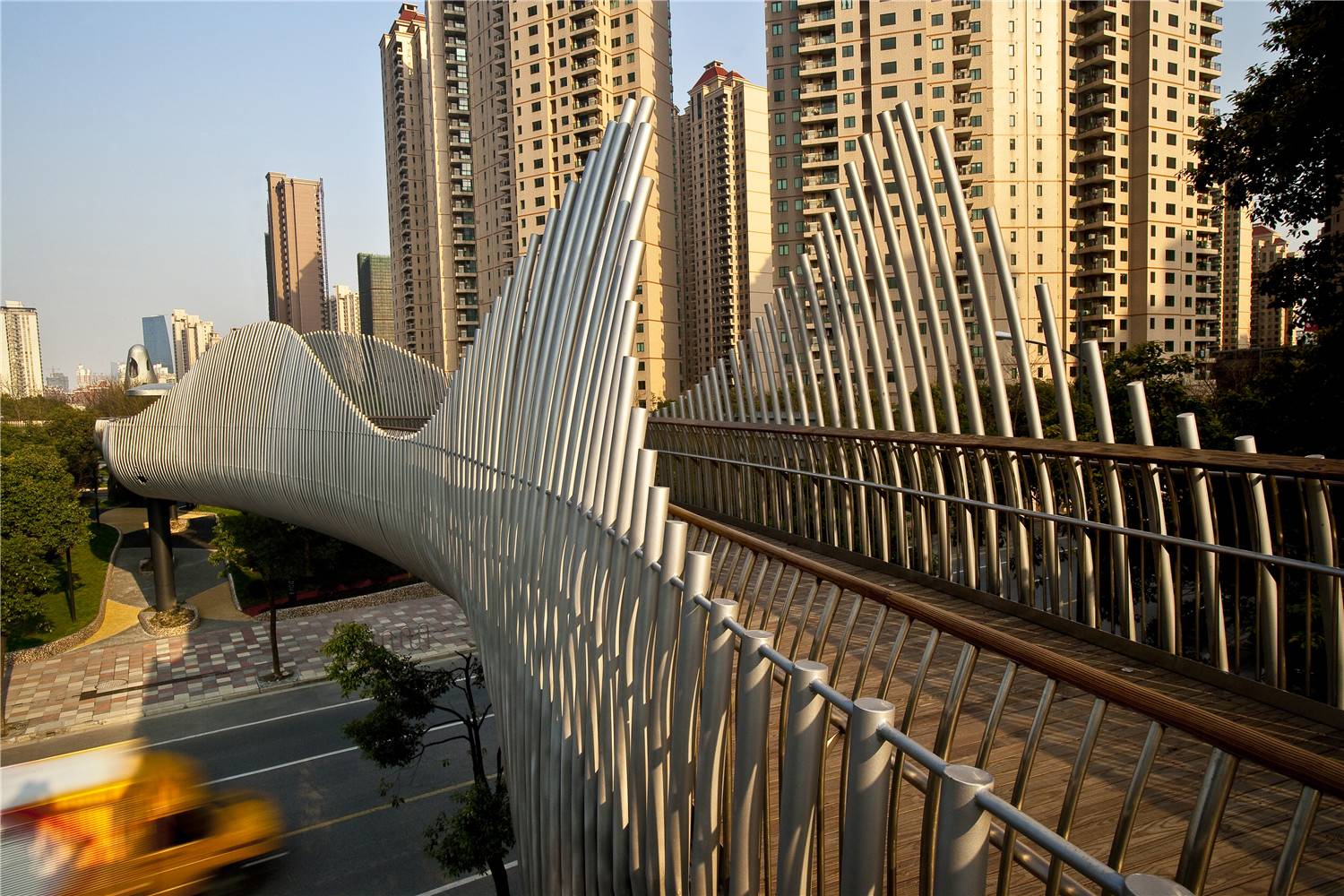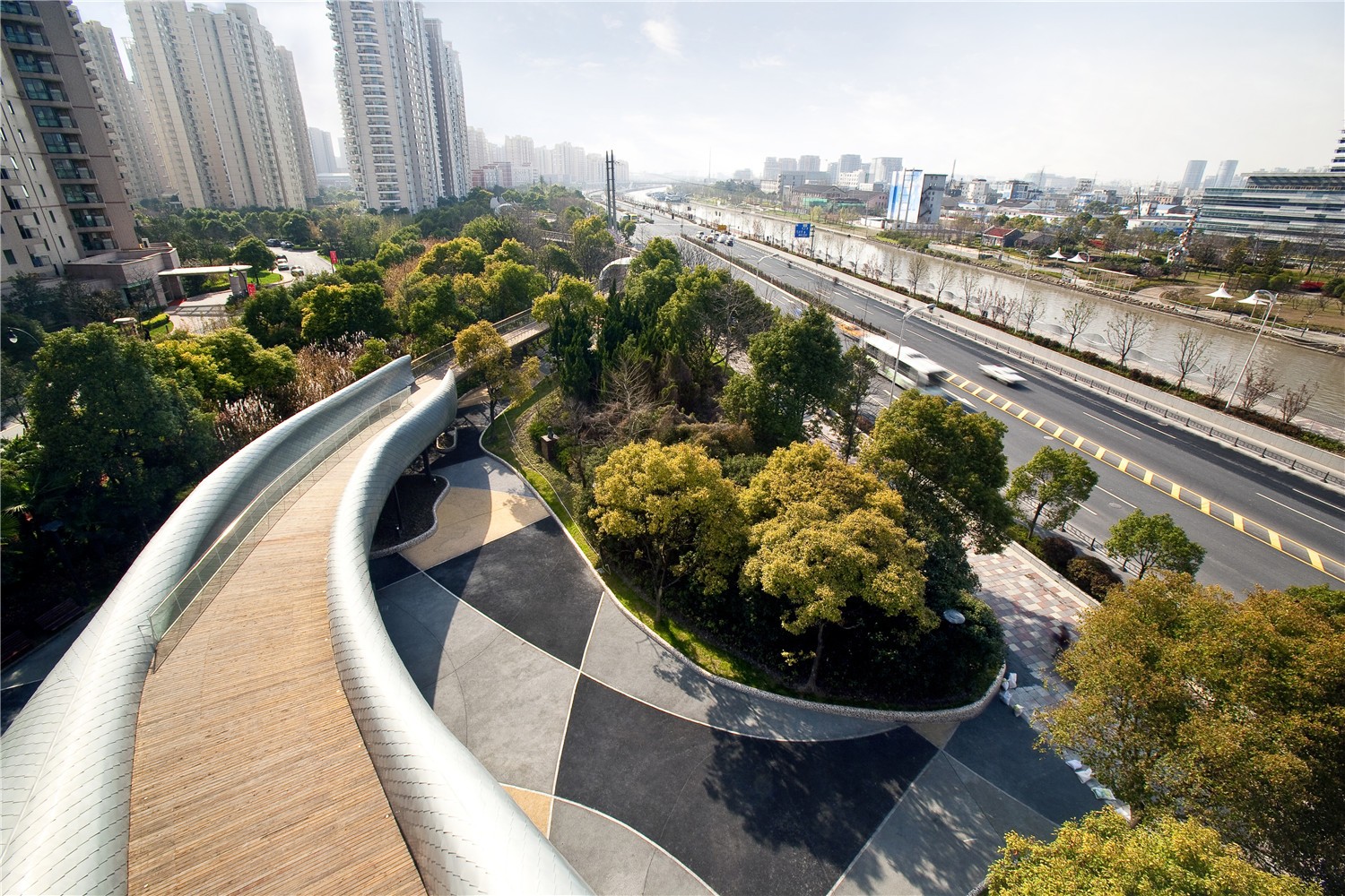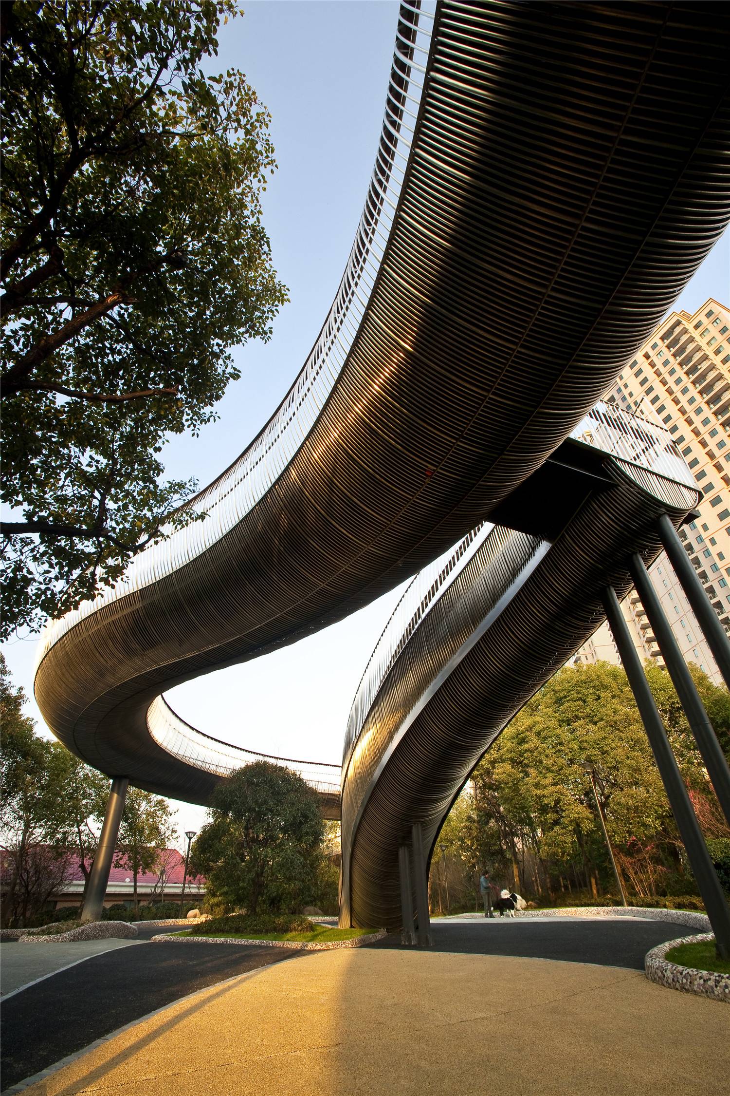 這條多功能綠化帶雖東臨蘇州河,但由于防汛墻和長寧路的阻隔,漫步景觀綠化帶時蘇州河不在視線范圍確實是一大遺憾。BAU在跨水城路處架起一座總長400米的天橋,形態(tài)蜿蜒,緩緩穿行起落于水城路兩邊的樹冠之間,既保持了景觀帶的延續(xù)性,也將河景、園景和周邊各種城市風景盡收眼底。天橋設(shè)計靈感源于蘇州河內(nèi)硅藻的形態(tài),意喻健康良好的生態(tài)系統(tǒng)。其獨特的建筑形態(tài)成為該區(qū)之地標,同時整合了20米高的觀景塔、報刊亭、風雨亭和茶室。