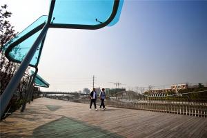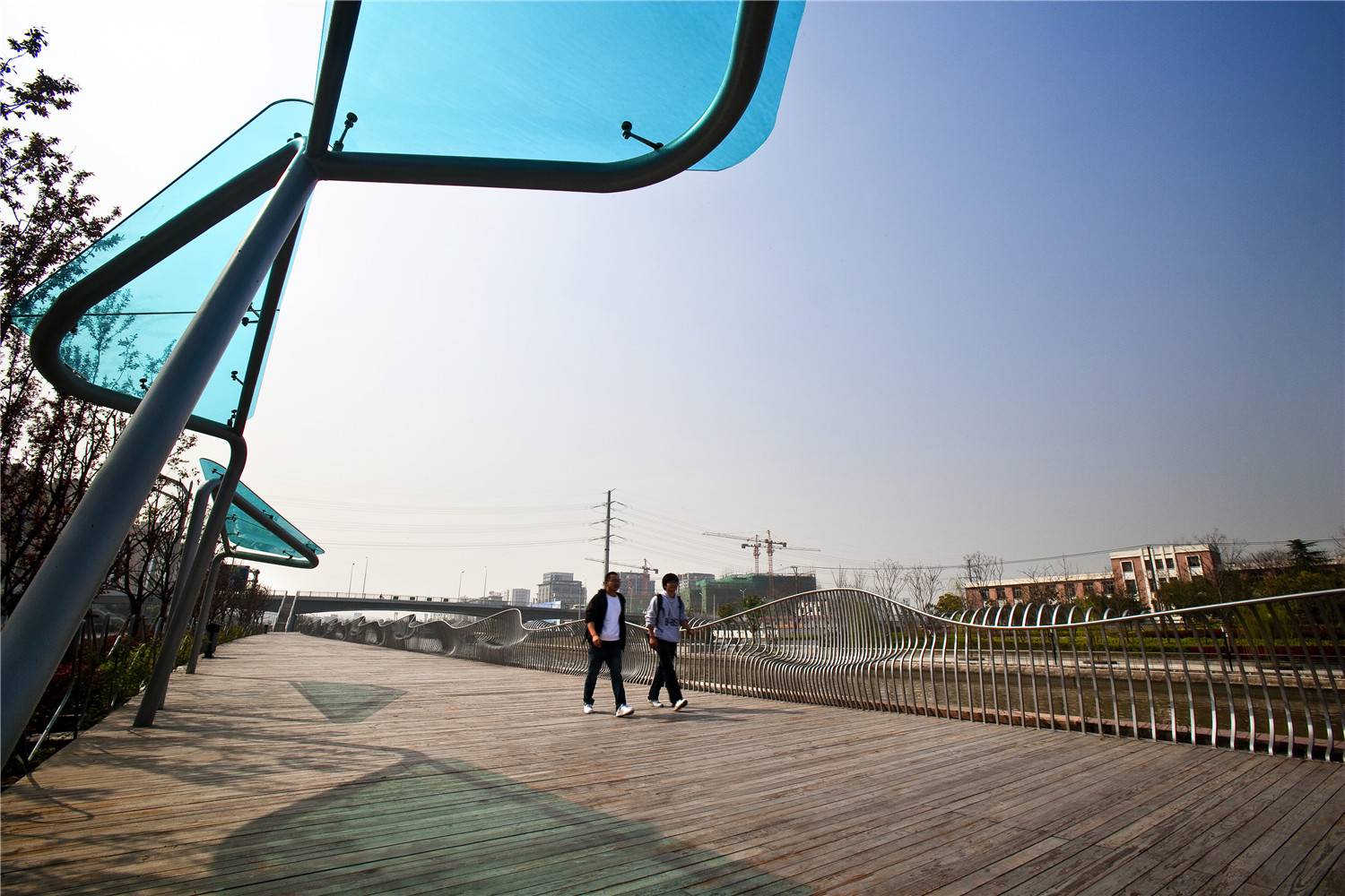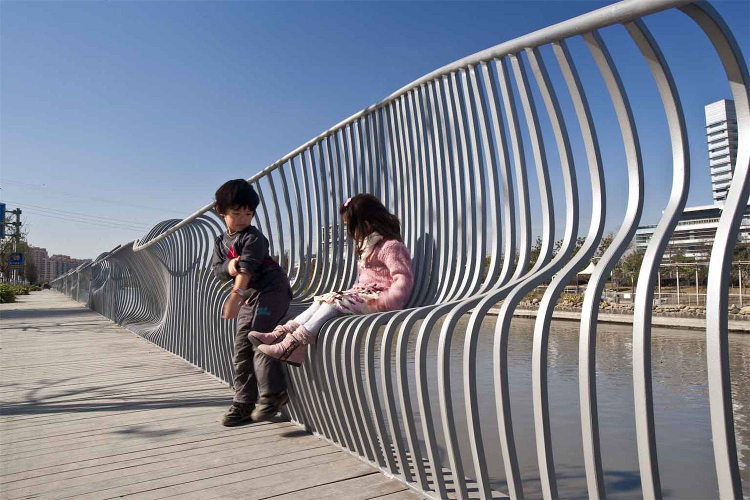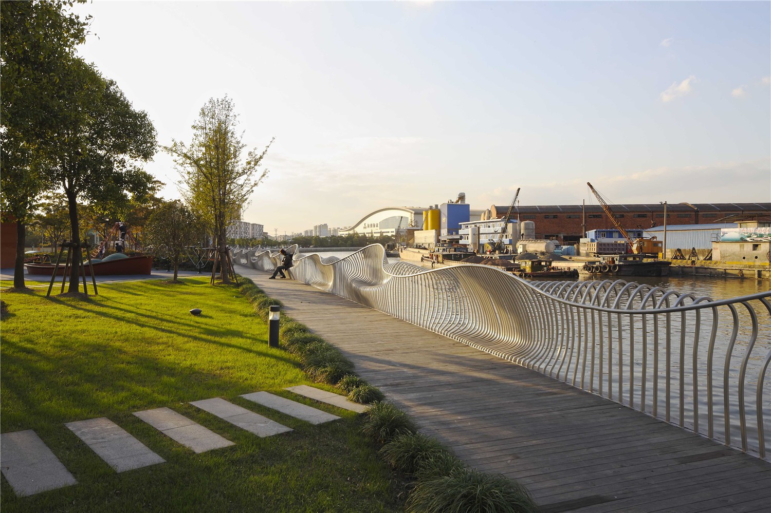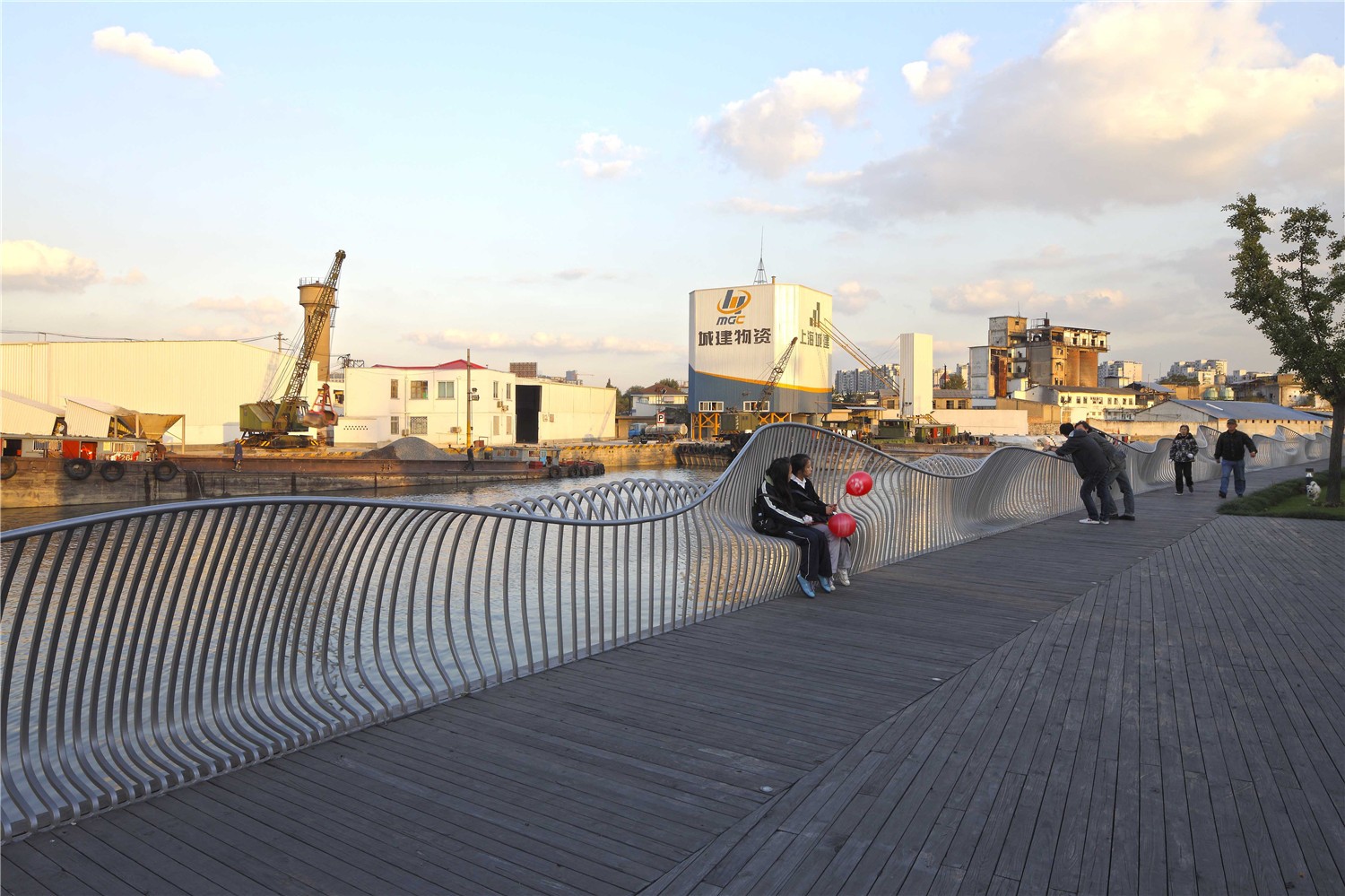 步道雖狹窄,總長卻有3.5公里,河邊安全欄桿采用了波浪形設(shè)計,其流暢的波浪外形完美地融入了坐憩、倚靠、觀賞等功能,行人可以在此小憩,倚欄觀賞蘇州河及兩岸美景。欄桿本身猶如蜿蜒的動態(tài)雕塑,為城市增添了一道靚麗的風景線。