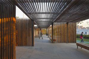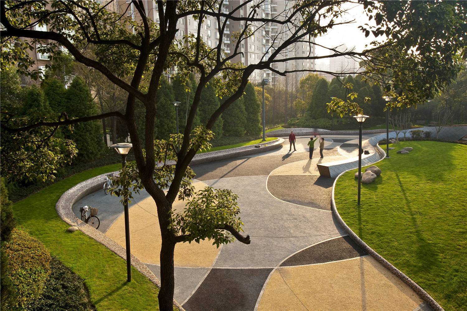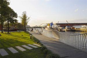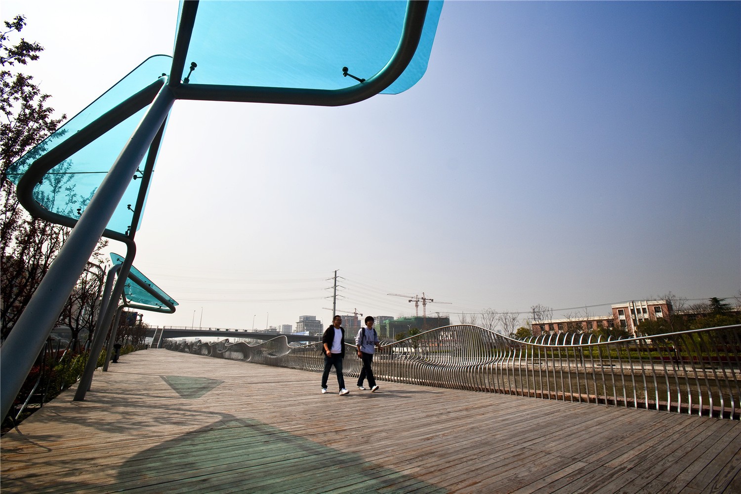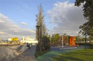 在長寧區(qū)蘇州河沿岸從工業(yè)廠區(qū)到時尚住宅辦公區(qū)的轉(zhuǎn)變過程中,BAU對該區(qū)域的景觀設(shè)計成為“蘇河印象”的重要組成部分。在高密度住宅和蘇州河之間,BAU將原來三塊狹長斷裂的200米綠地改造,形成一條總長延續(xù)600米的線性公園,成為整個蘇州河沿岸景觀中最為人稱道的一段,為附近居民提供了一條美麗幽靜的景觀步道和活躍的運動休閑空間,動靜皆宜。