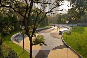 Three programmatic threads – sports, promenade and retreat, ensure a broad range of users. These three programs are linked to three legible paths, which help the ten 200m long parks be understood as one 2km park. The sports thread is a rubber jogging track, with periodic exercise circuit apparatus, basketball courts, badminton and other sports plazas. The promenade is a lineal plaza connecting tea-houses, pavilions, plazas and gathering areas. The retreat is a quiet green path made up of a number of narrow, intimate and isolated routes and places. Where these threads cross, or intertwine, areas of greater complexity and density emerge.