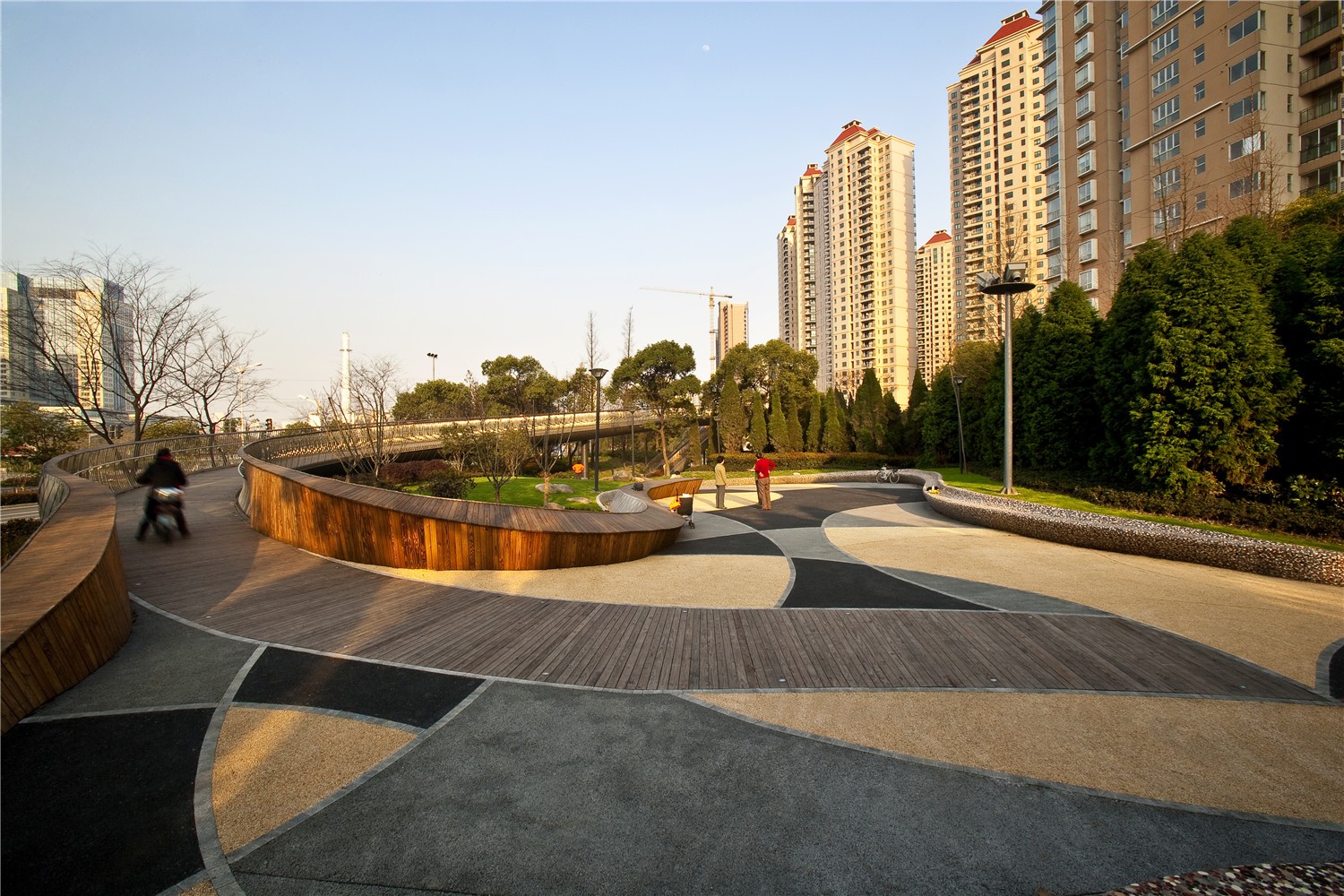 Changning District is replacing its riverside industrial zone with residential and office districts. This project is the development of three narrow parks between the new high-density housing edge and the riverside arterial road. These three, 200m long parks are the first of ten along this stretch of Changning Road. Rather than passive isolated buffers, these green spaces are designed as one active linear park encouraging residents to leave their enclaves to explore and partake in their new wider community and environment.