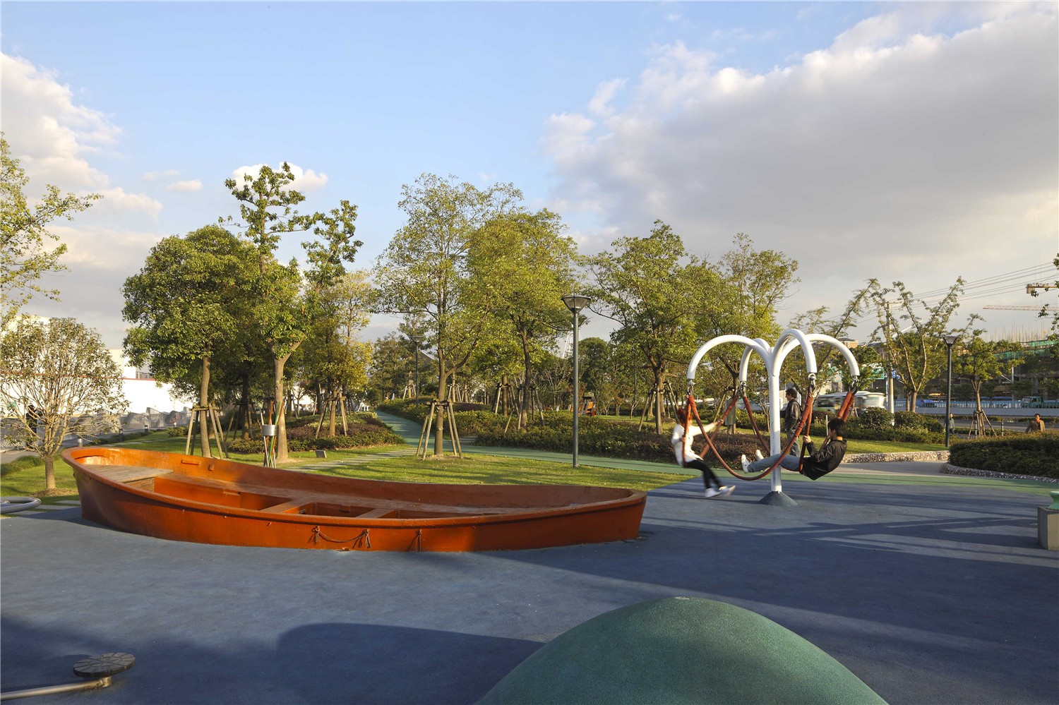 本項目另一項設(shè)計任務(wù)是對蘇州河畔的風鈴公園及景觀亭進行修復(fù)重建,同時也為孩童開辟一片嶄新的游樂天地。蘇州河曾是列強建立工廠、運送資本和廉價勞動力的黃金水道,為了紀念蘇州河的這段歷史,BAU在兒童游樂場的設(shè)計選材中,將廢棄貨船上的救生艇、系船柱以及部分船殼加工定制成游樂設(shè)施,打造出一個集歷史教育、環(huán)保再循環(huán)、藝術(shù)和娛樂于一體的兒童游樂場。