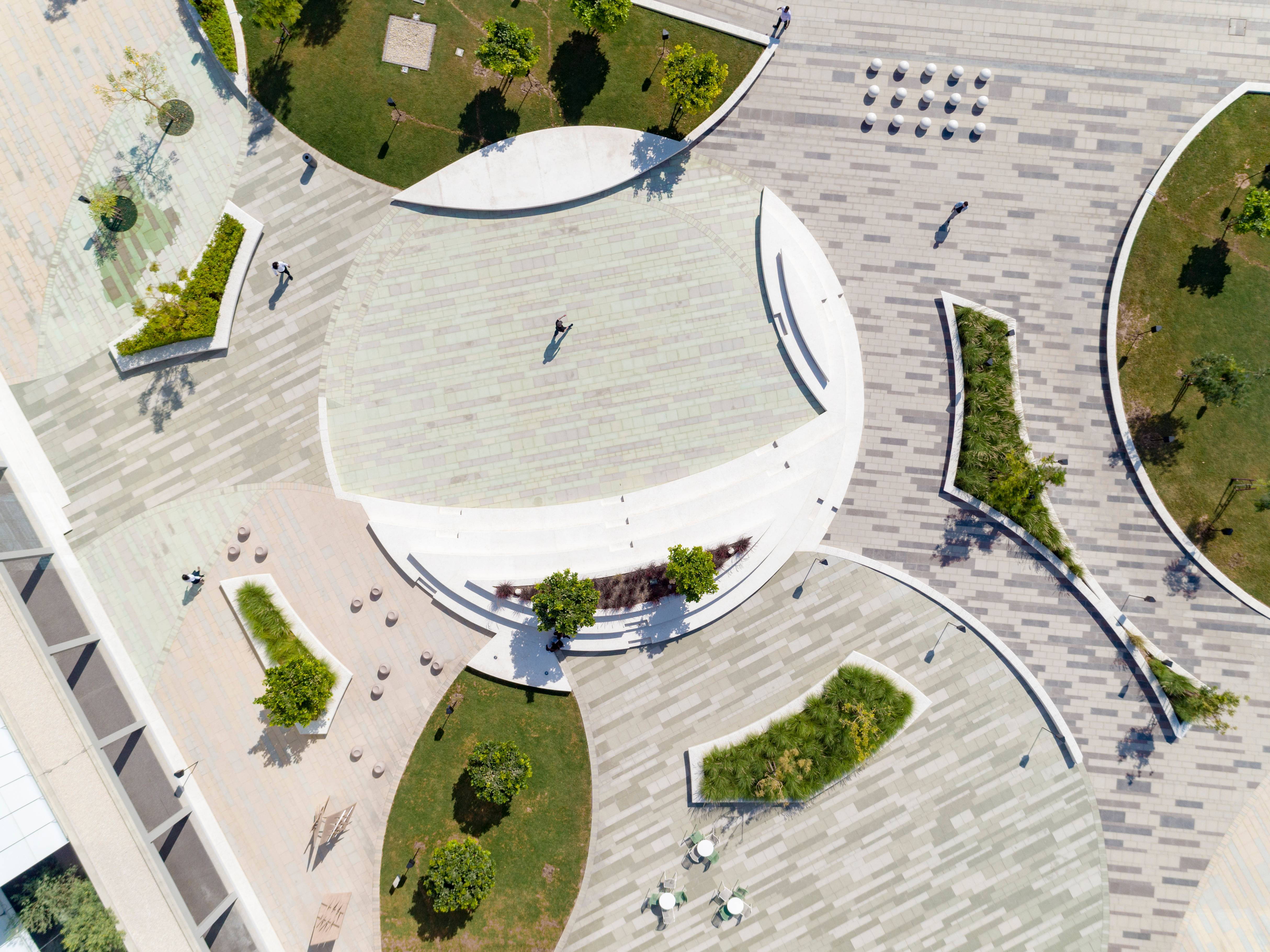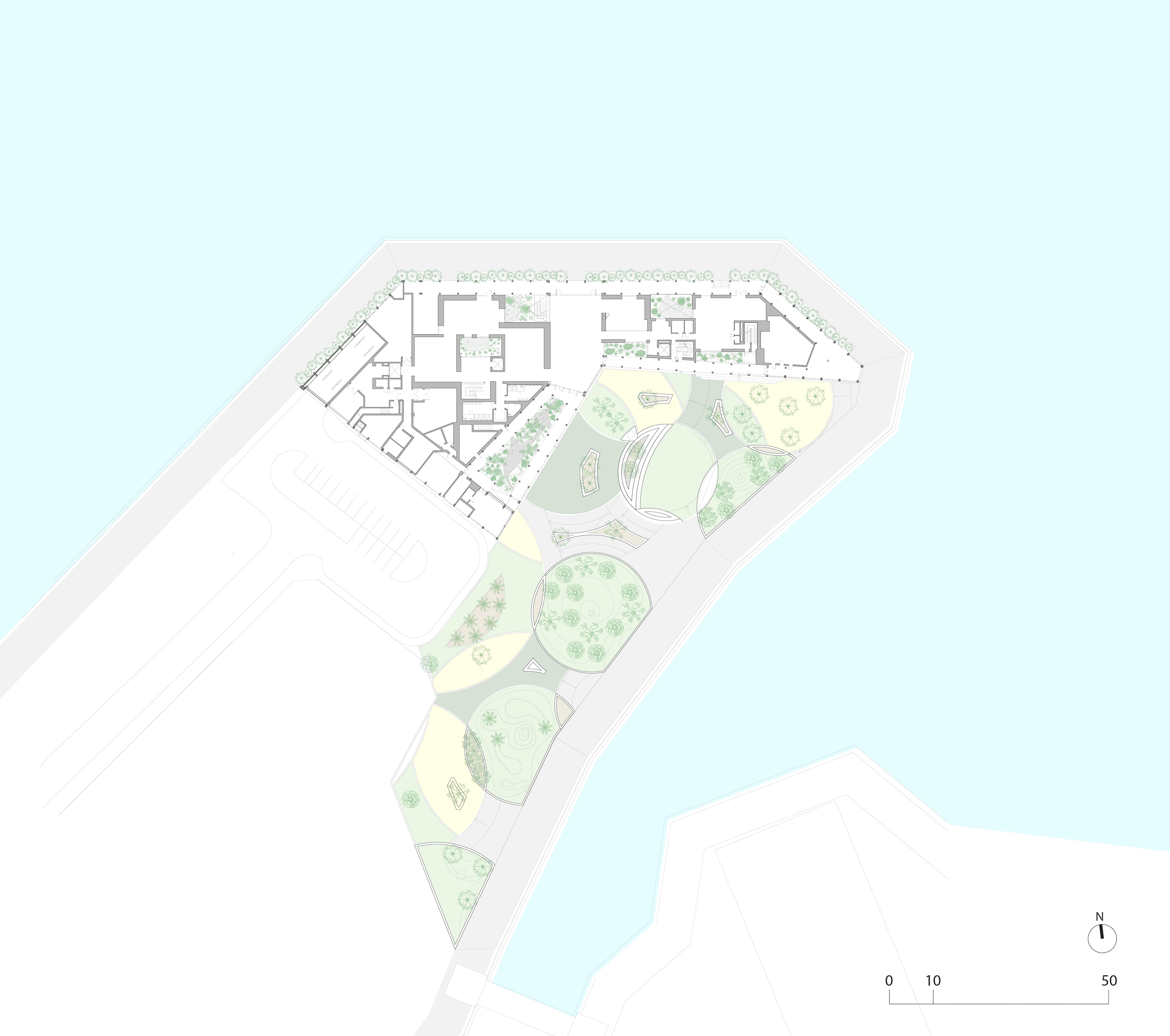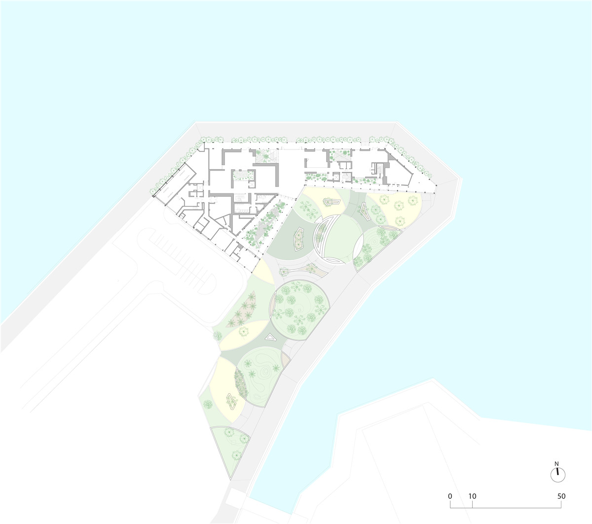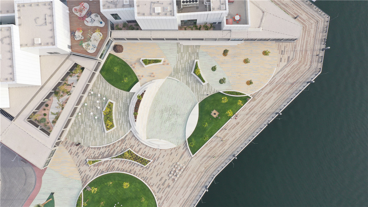 藝術(shù)作品和設(shè)施被排列成水波紋狀,弱化了廣場的圓形幾何線條。使得步行流線更加流暢,將藝術(shù)中心柱廊和海灣濱水區(qū)大道無縫連接在一起。綠色和黃色的預(yù)制鋪磚與藝術(shù)中心建筑珠光面板的設(shè)計相呼應(yīng)。