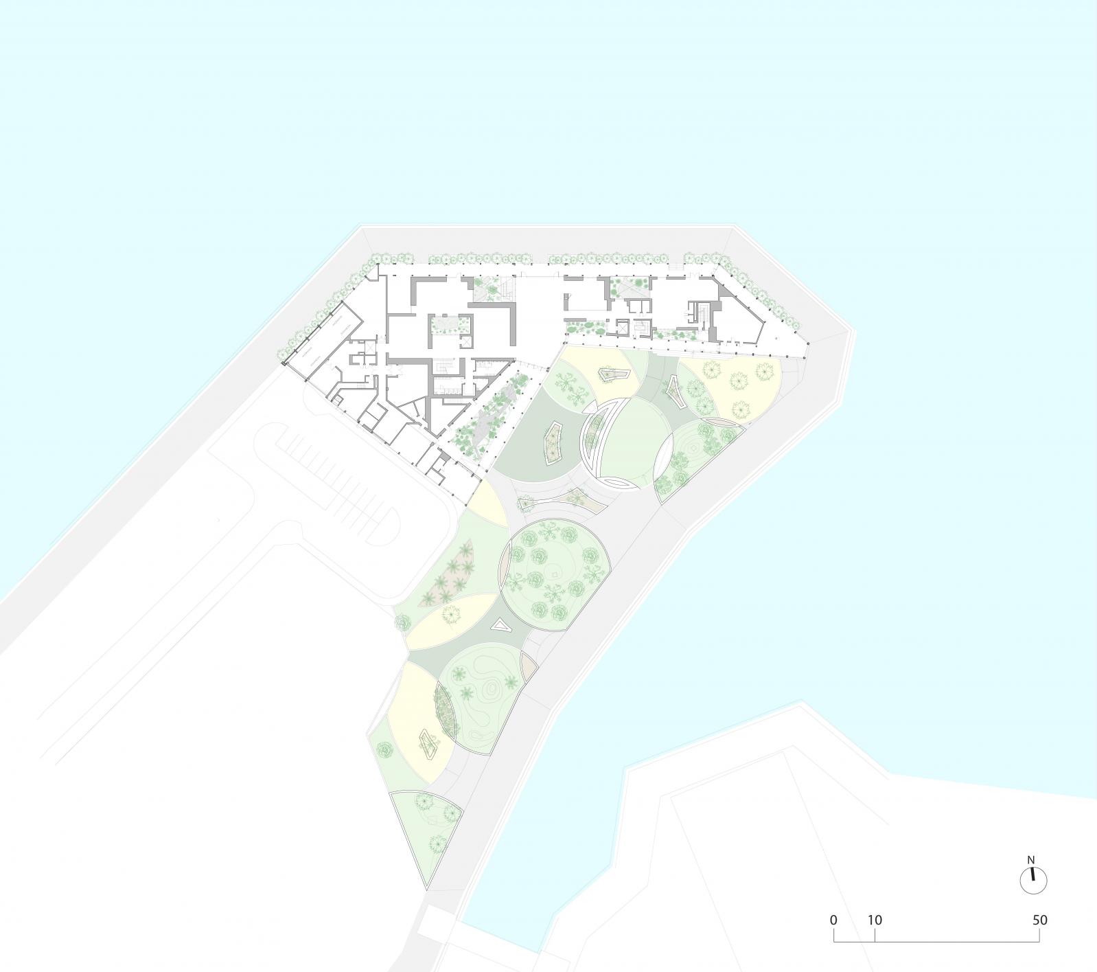 The art works and facilities are arranged to follow a water ripple like, hidden circular geometry. That allows for an organic pedestrian flow, seamlessly connecting to the colonnade around the arts centre and the corniche along the creek. Our selection of the green and yellow pre-cast tiles correlates with our design selection of the pearlescent fa?ade panels of the art centre.