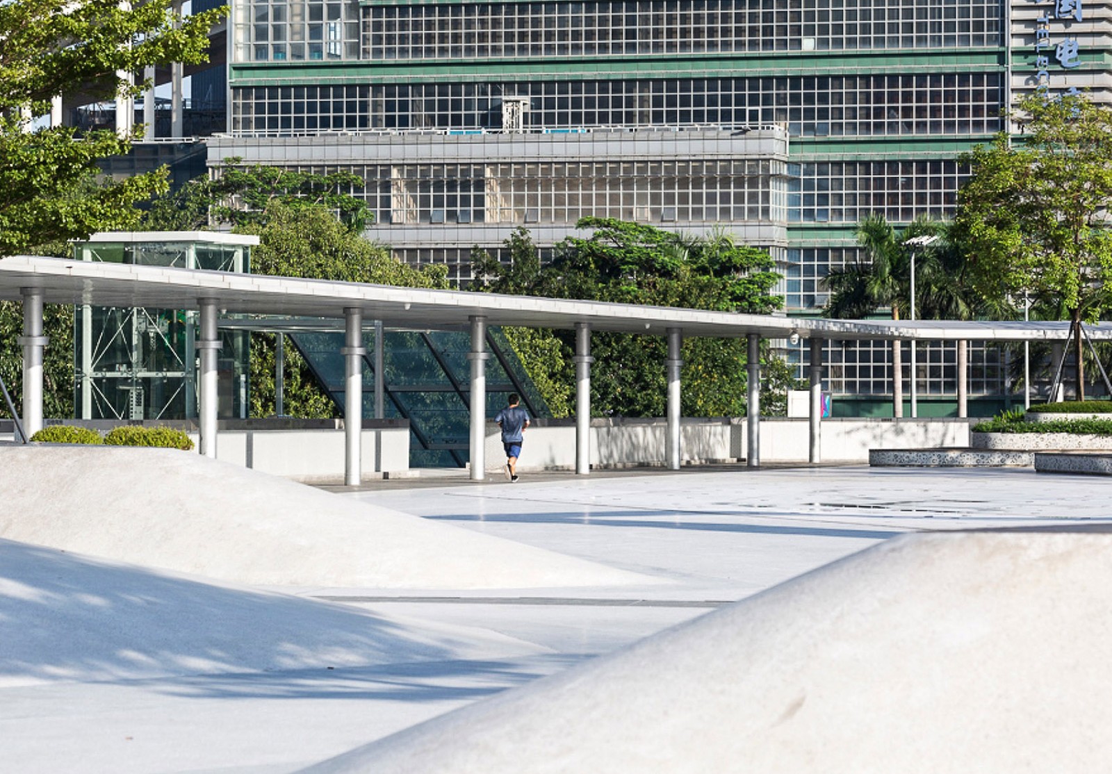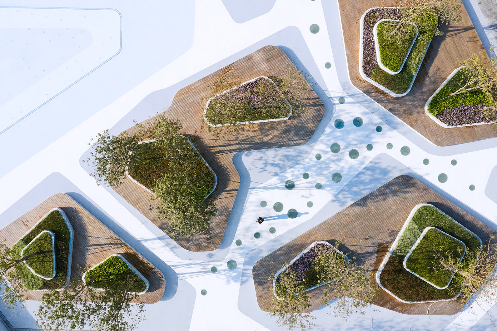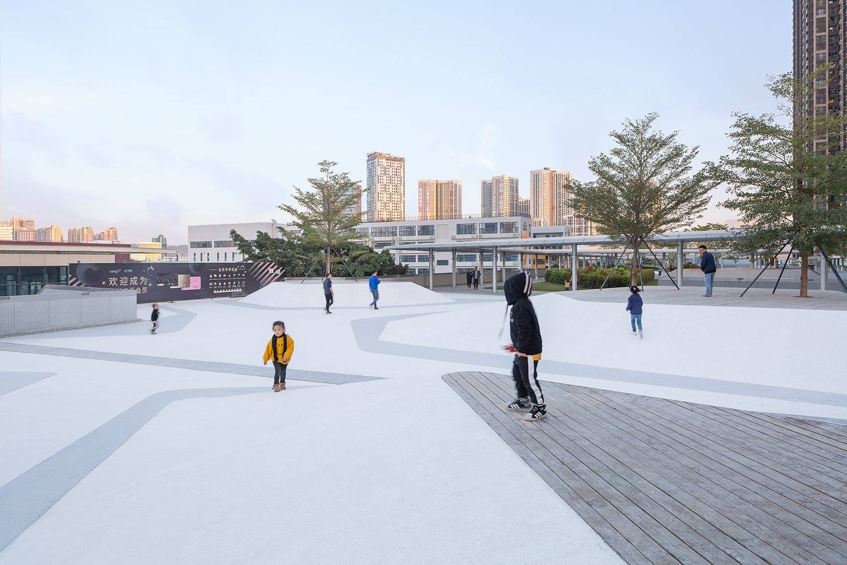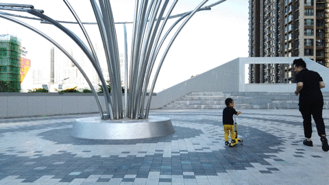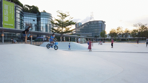 我們結(jié)合樹池設(shè)計了一些起伏變化的小島,營造出一種純凈的景觀雕塑感。以水磨石與塑木打造一個讓人們自由奔跑嬉戲的坡地場所。這里很適合小孩和年輕人活動,經(jīng)??梢钥吹接休喕?,踩單車等活動。