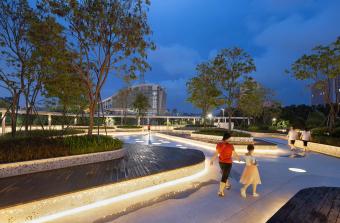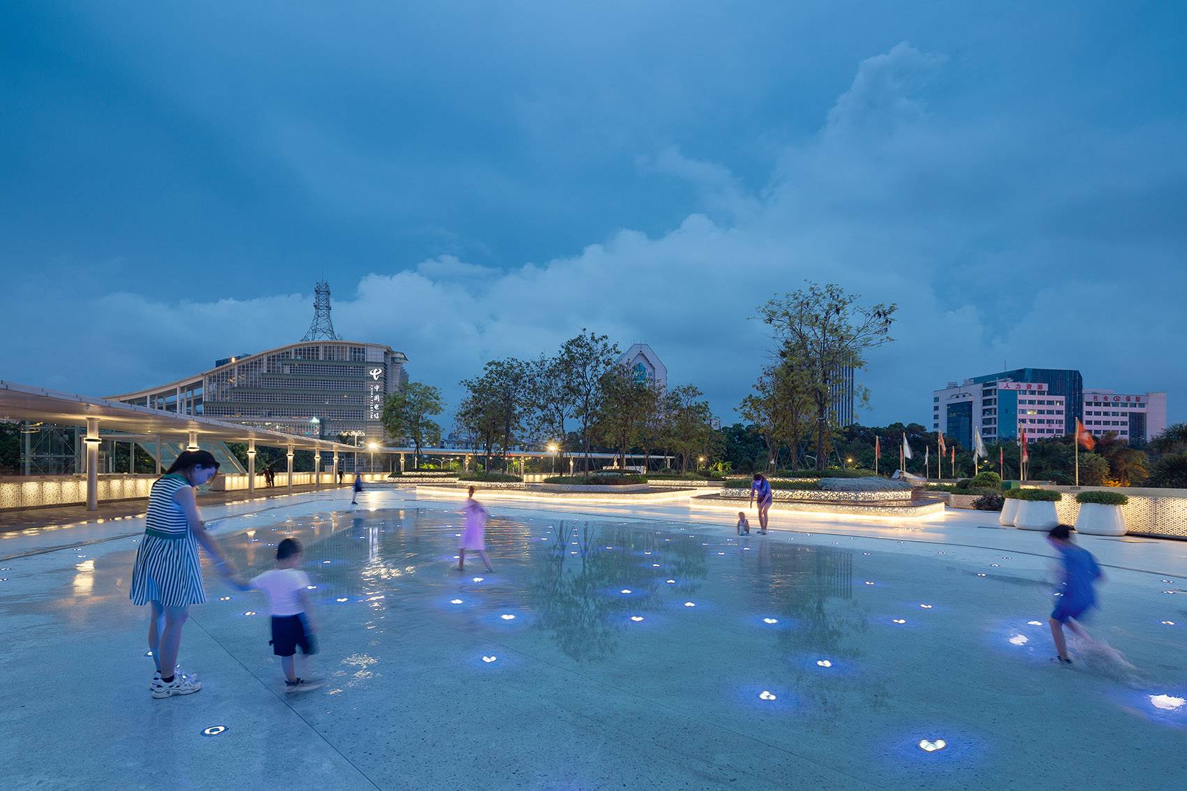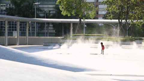 在人群最為集中的區(qū)域我們設(shè)計了噴霧廣場,同時也是一個多功能使用空間。這里場地微微下凹,下雨天會自然形成淺水灘,人們可以在上面戲水;地面上設(shè)計有噴霧裝置,調(diào)節(jié)微氣候的同時也增加了趣味性;這里就是一個屬于市民的廣場,可以在特殊節(jié)假活動日變?yōu)榛顒油鈹[區(qū)。人們在這里可以安全,自由的奔跑。