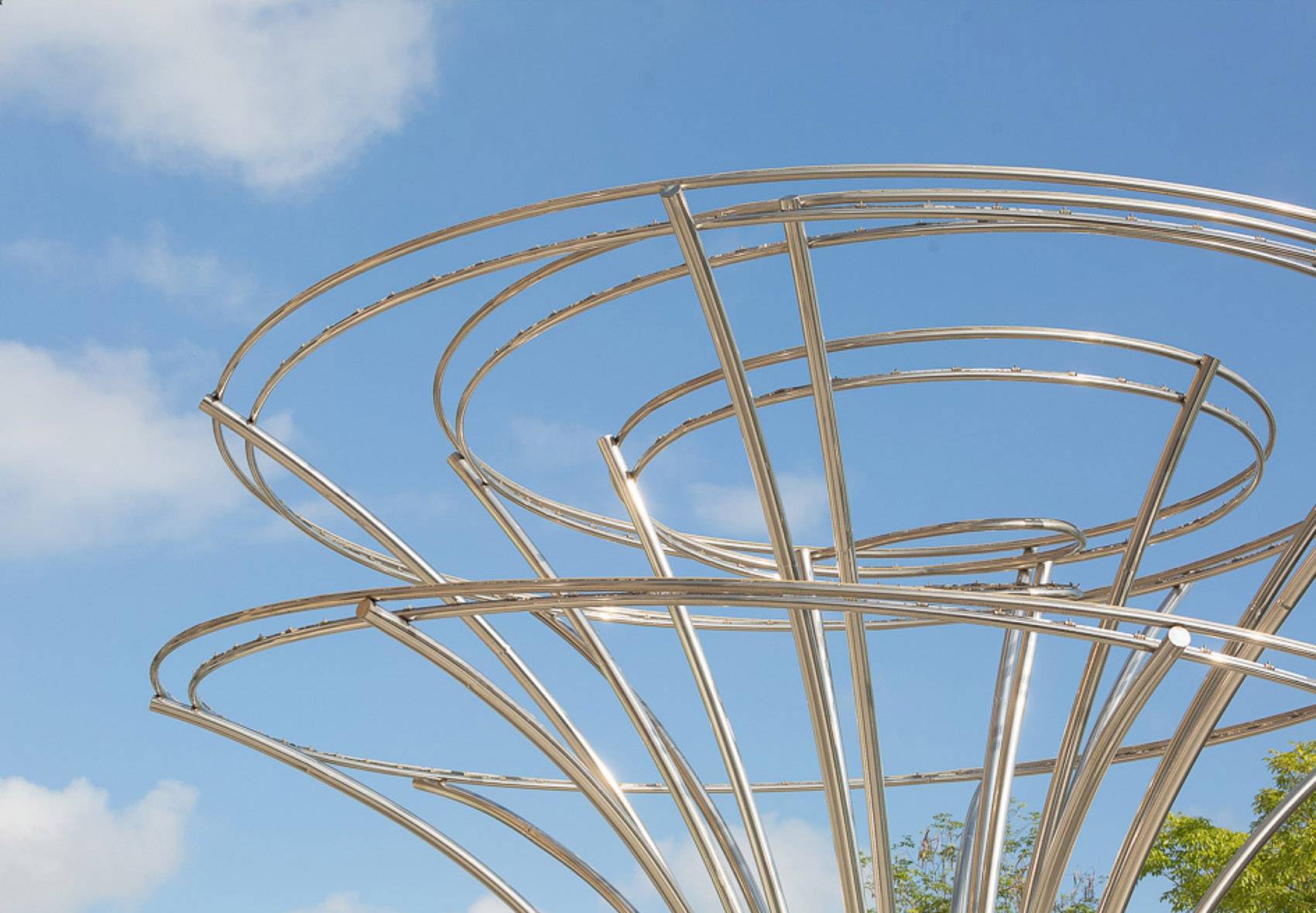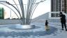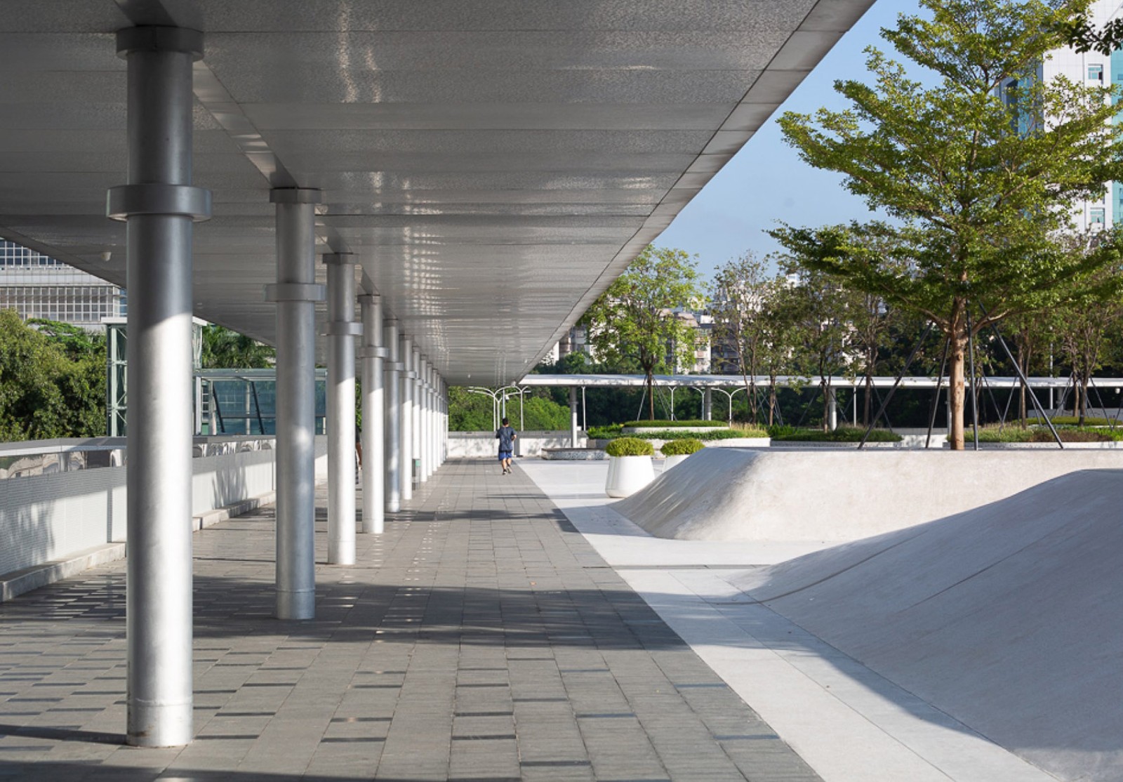 整個橋面有一個連續(xù)的雨棚將主要動線進行串聯(lián),連接樓梯間與電梯間,提供遮陽擋雨的功能。我們希望在南端能夠有一個讓城市看到的橋上的標志物,因此在廣場設(shè)計了一個帶噴霧燈光效果的蜿蜒向上的金屬雕塑樹。希望這些構(gòu)筑物增加空間的識別性與趣味性。