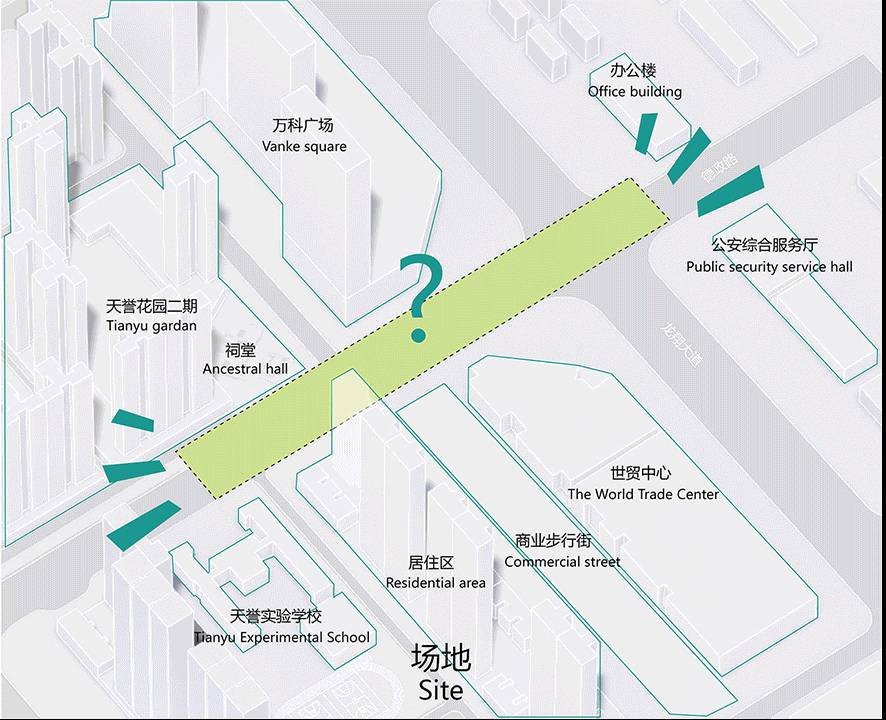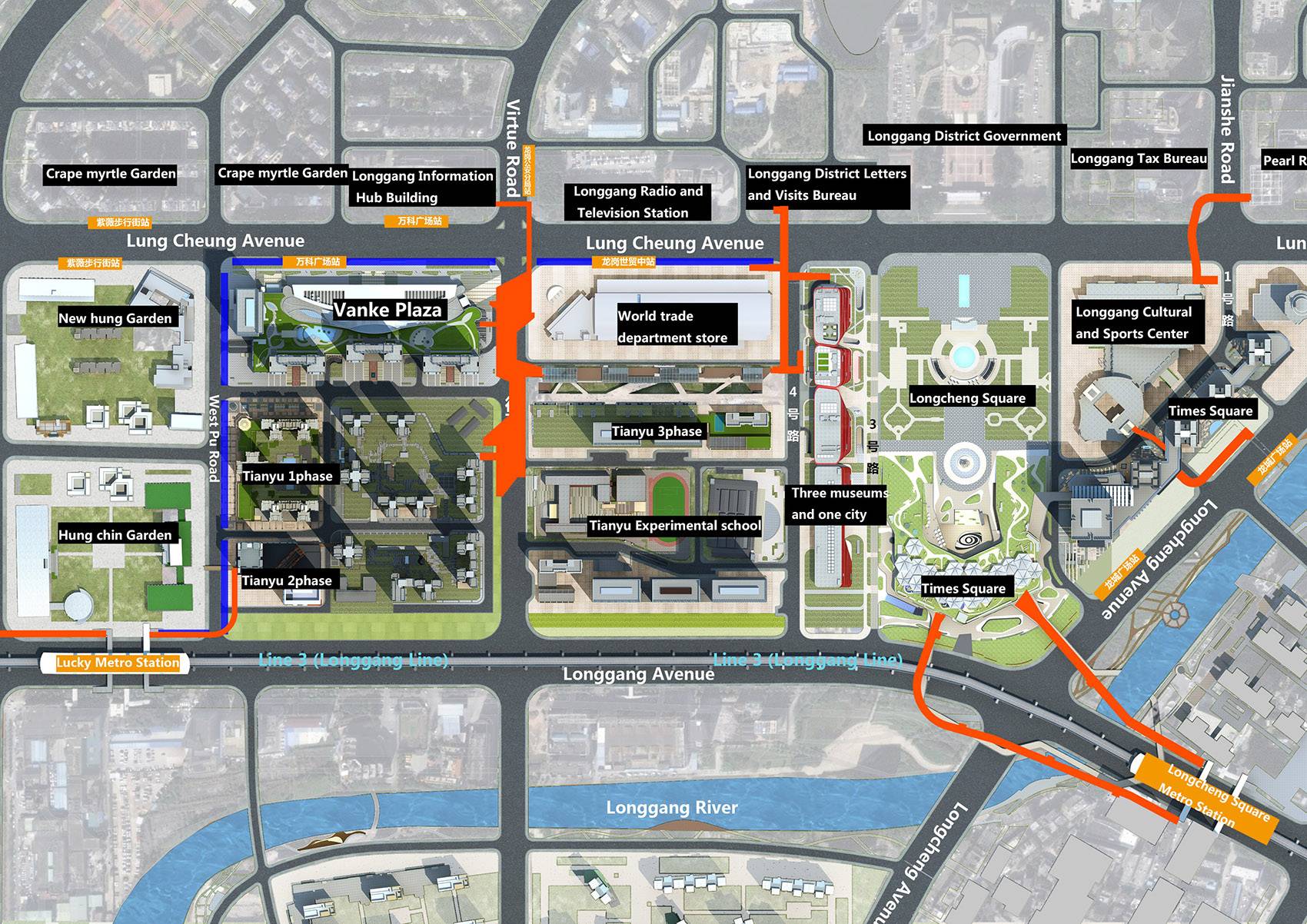 二號連廊位于龍崗中心區(qū)政府旁,連接萬科廣場商業(yè)綜合體與世貿(mào)百貨廣場,天譽二期住宅區(qū),商業(yè)步行街等。橋體位于德政路上方,橫跨龍翔大道,是一個連接多方平臺的二層景觀廊道。基地內(nèi)人流密度大,流線復(fù)雜,現(xiàn)狀人車混行。同時,基地周邊缺少市民活動場所,周邊的公園空間大都以自然景觀為主,活動內(nèi)容較為單一。因此,可以利用二層通廊空間建立一個都市性休閑場所來解決交通問題以及提升片區(qū)的品質(zhì)。