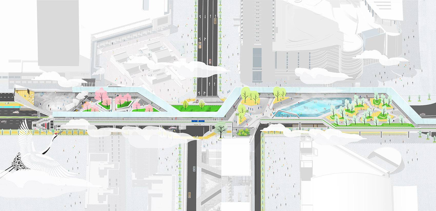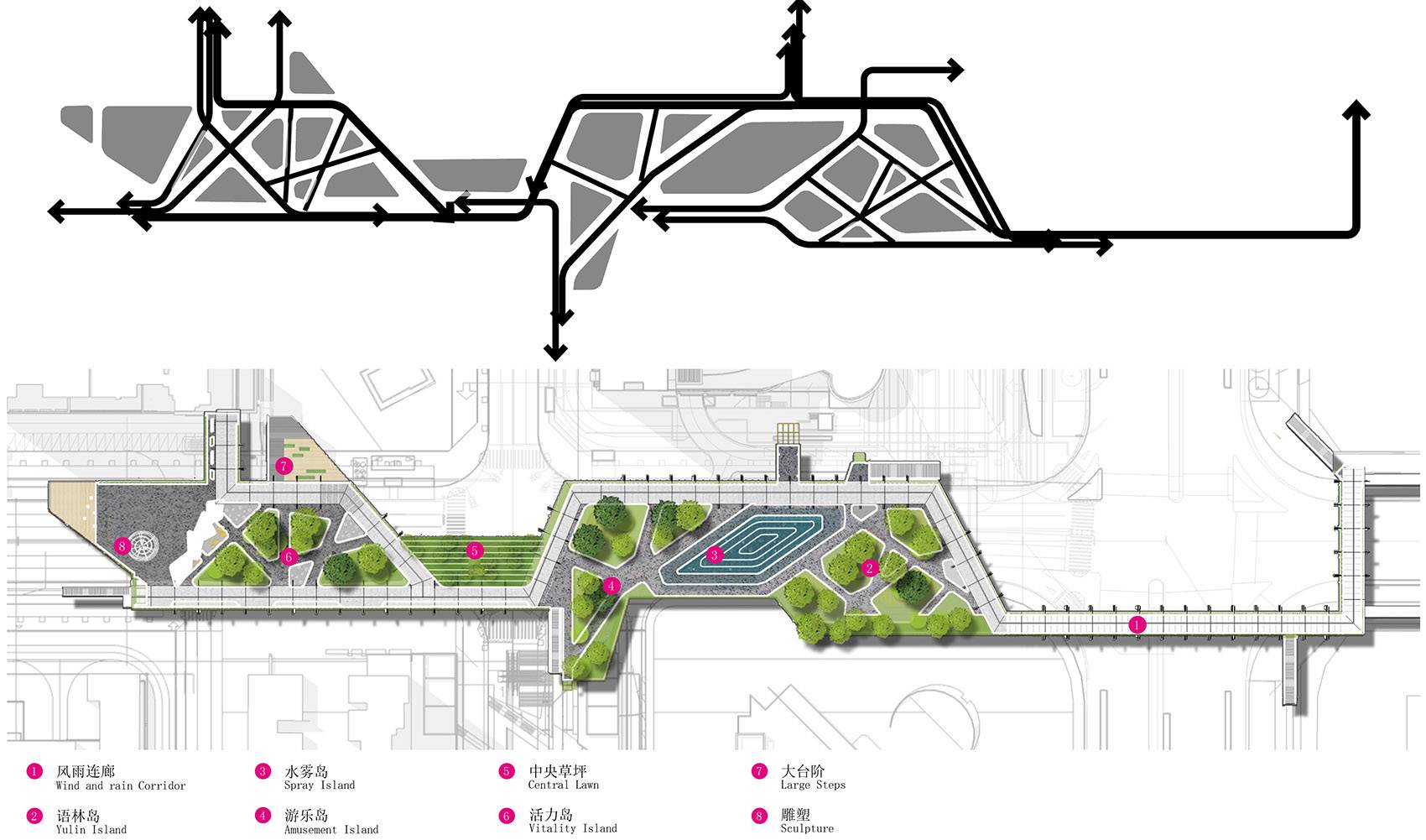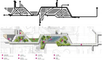 設(shè)計通過人流、視線、風光、使用功能需求等一系列分析得出二號連廊的規(guī)劃結(jié)構(gòu)與布局,以“漂浮群島”的概念進行景觀深化-“人流似水,分行成島”?;陬A(yù)測的人流的最短常用路徑將橋面空間進行分隔,從而形成的不同大小形狀的島狀空間,置入各種復(fù)合不同人群需求的活動內(nèi)容。設(shè)計在滿足天橋作為通行基本需求的同時,擴展了橋面空間的可能性,盡量讓傳統(tǒng)意義上城市中的天橋變?yōu)槿の栋蝗坏墓珗@。