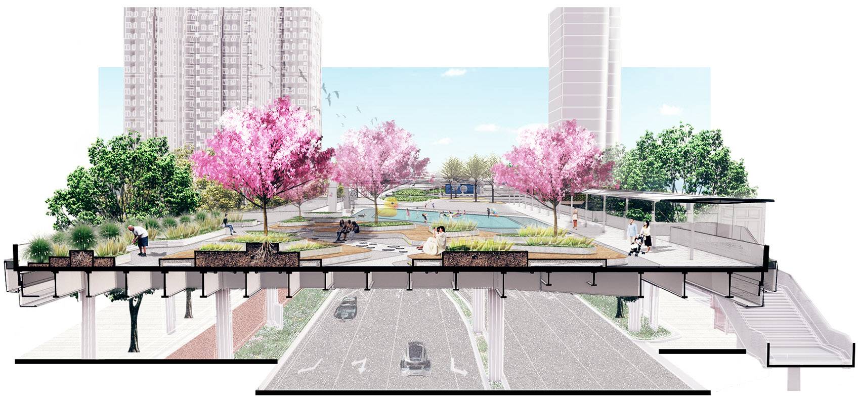在這個區(qū)域我們設(shè)計了以座椅圍繞的樹池,并且種植了紫花風鈴木帶有明顯花期的植物。這個區(qū)域靠近學校,可以提供給家長更多的等候長場所以及學生課后活動場所。在橋體的最南端我們設(shè)計了一個硬質(zhì)的活動廣場與臺階空間,可以提供周邊居民在此休閑活動。