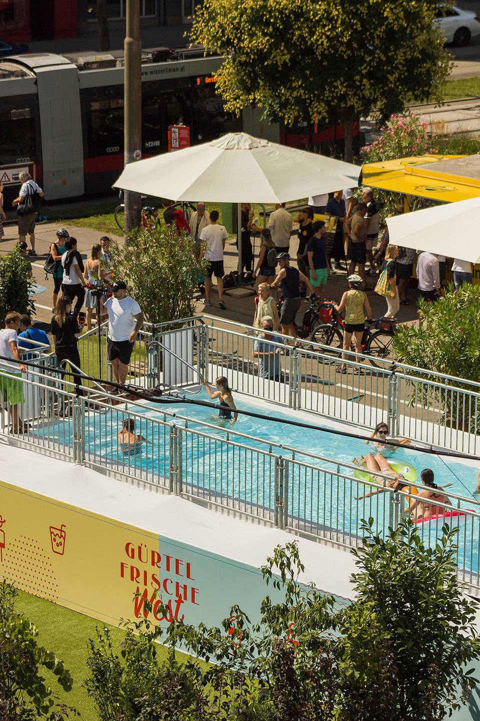 該項(xiàng)目被命名為Gürtelfrische WEST,意為西站前的新鮮地帶,它貫穿了維也納火車西站前方的一處繁忙場(chǎng)地,在城市的中央位置形成了一個(gè)結(jié)合綠植、泳池、日光浴草坪、舞蹈和運(yùn)動(dòng)區(qū)、餐飲區(qū)、可移動(dòng)座位等一系列休閑功能的公用場(chǎng)地,同時(shí)為音樂(lè)會(huì)、合唱和舞蹈等各類文化活動(dòng)提供了舞臺(tái)。