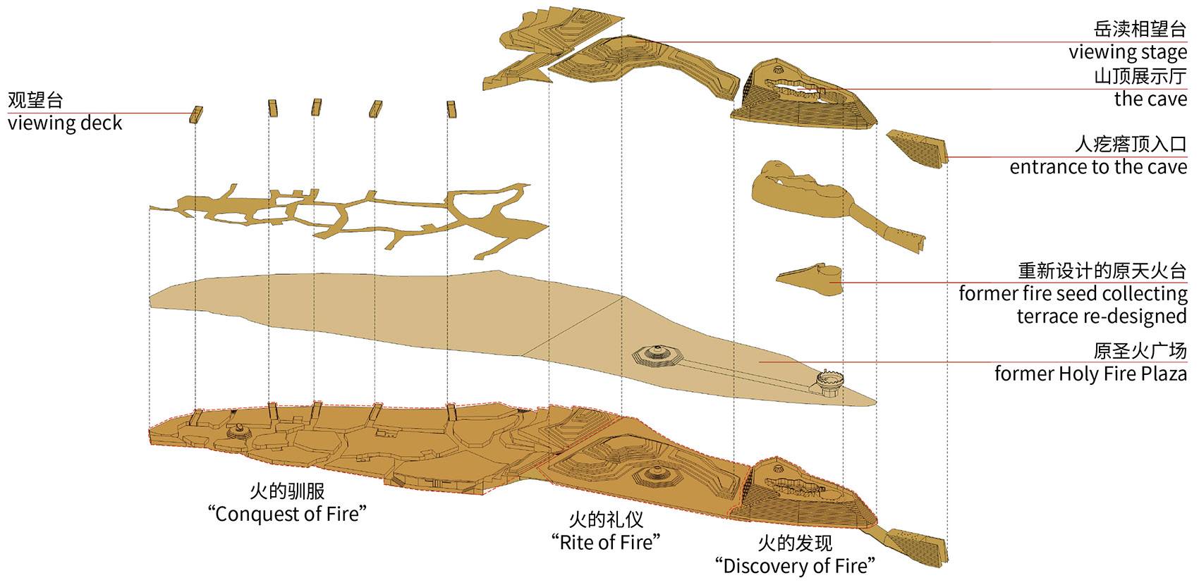 新規(guī)劃的圣火公園用“火的發(fā)現(xiàn)”,“火的禮儀”和“火的馴服”三個(gè)連貫敘事,賦予人疙瘩嶺新的人文與自然體驗(yàn)。