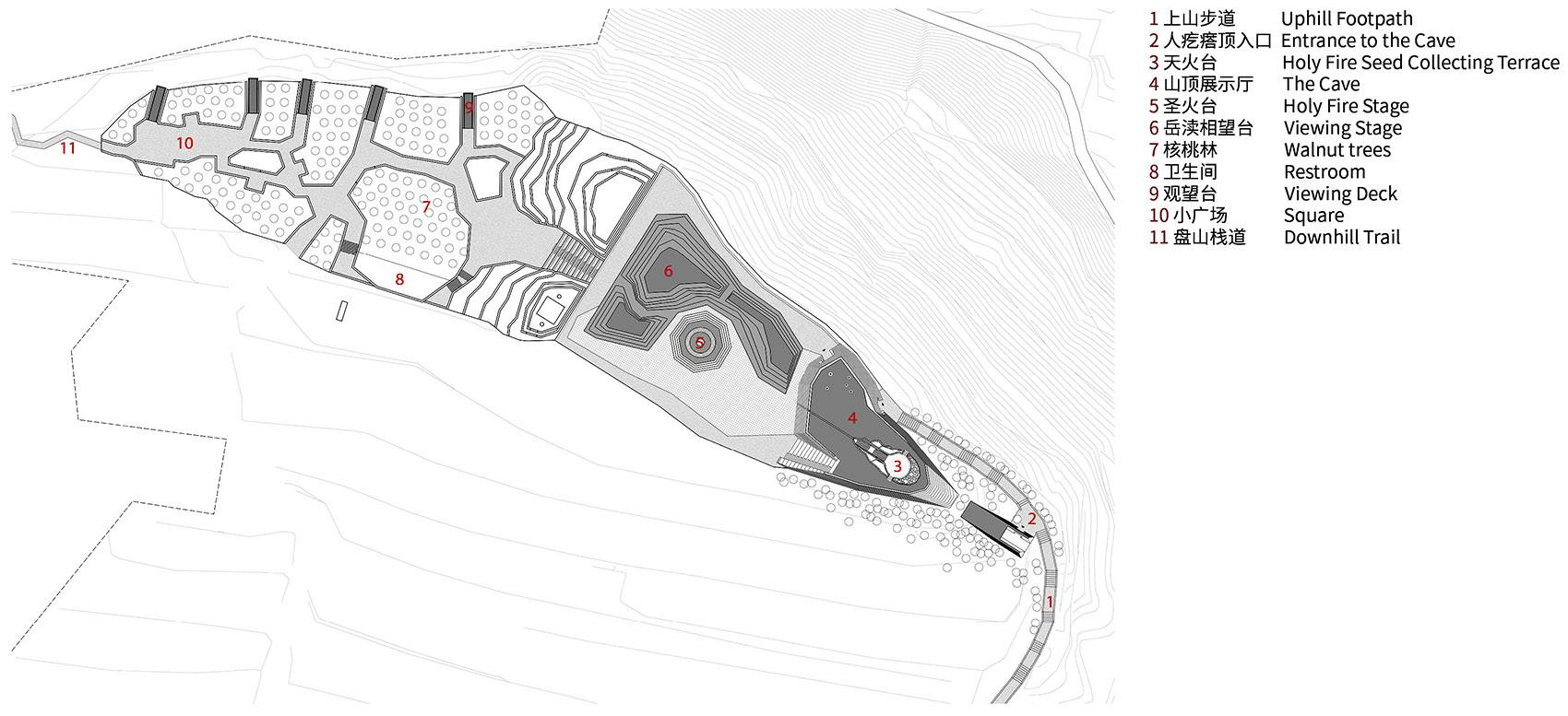 2019年山西省承辦第二屆全國青年運(yùn)動(dòng)會(huì),并要求通過改造西侯度“人疙瘩嶺”上已有的圣火廣場(chǎng)以舉辦“二青會(huì)”圣火采集儀式。設(shè)計(jì)挑戰(zhàn)是不能拆除現(xiàn)有的取火臺(tái)、點(diǎn)火臺(tái)及廣場(chǎng)等設(shè)施。解決方案是用大地景觀的手法把圣火廣場(chǎng)和周邊環(huán)境整合為一體,形成一個(gè)神奇的、靈性的、哲理的場(chǎng)所,用當(dāng)代設(shè)計(jì)在這個(gè)獨(dú)特地段上重新解釋天人合一。