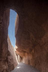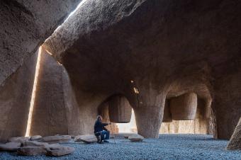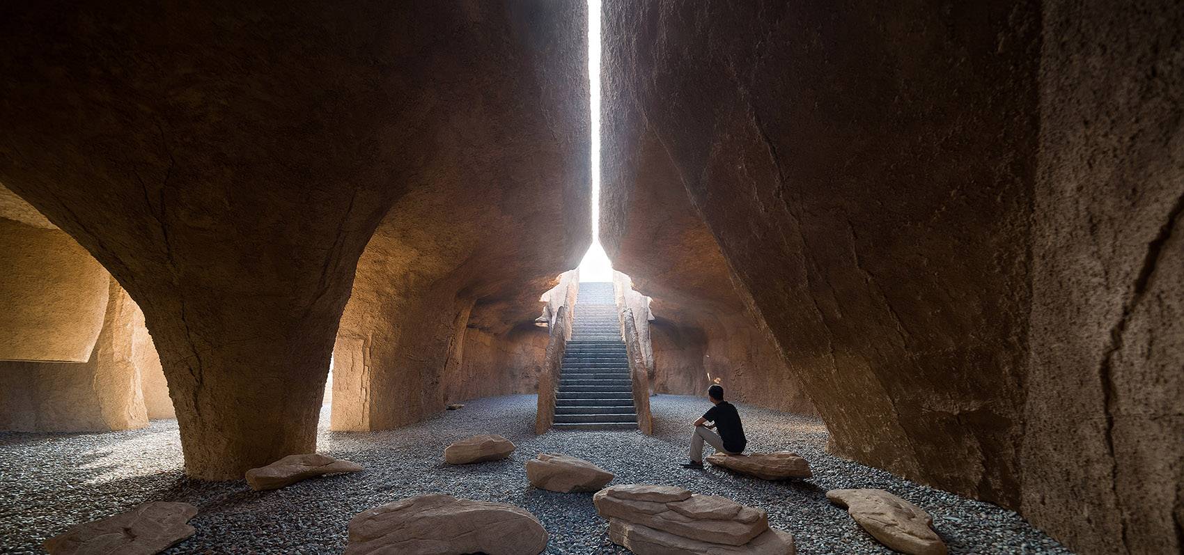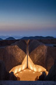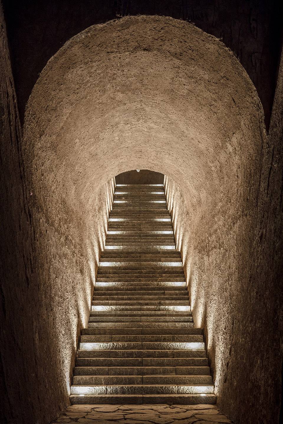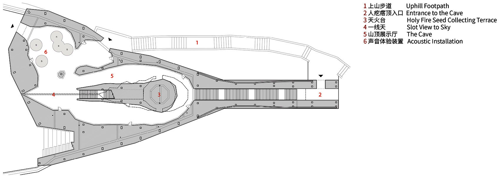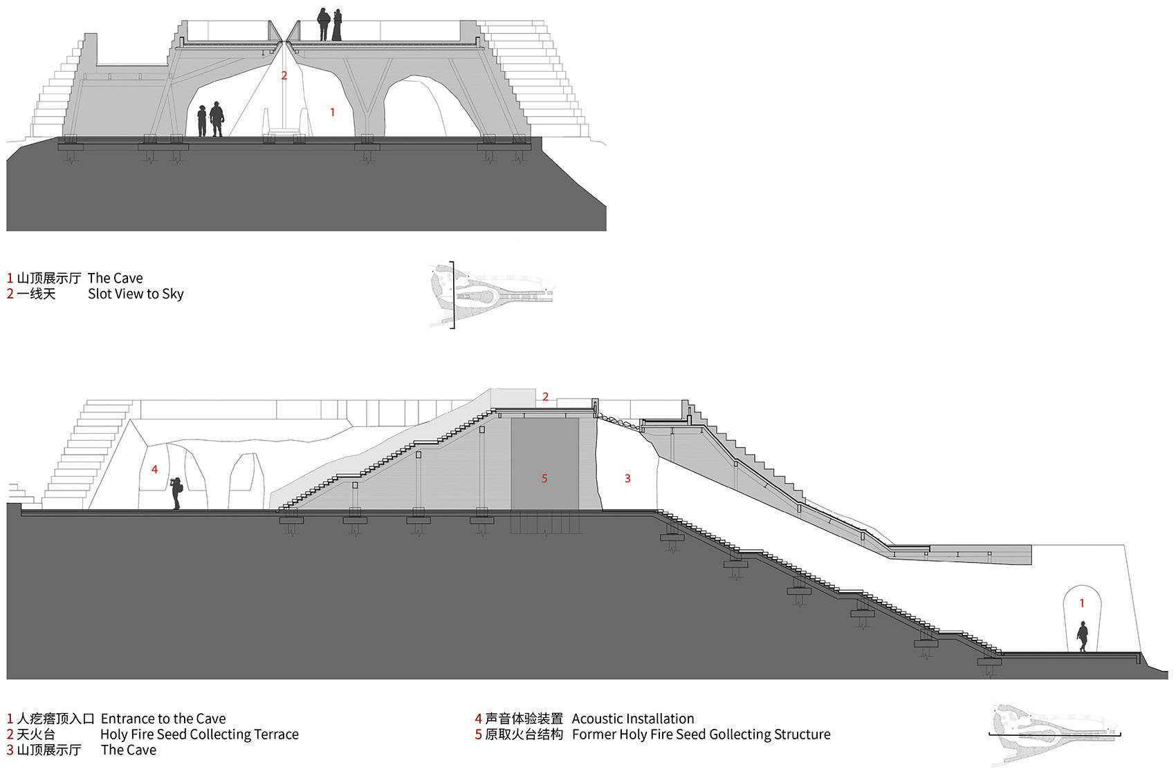 參觀從原文物陳列館開始,拾級(jí)來到半山腰的山頂體驗(yàn)展示廳,通過深長(zhǎng)的山洞將觀眾從現(xiàn)代場(chǎng)景中脫離出來,帶入到原始質(zhì)樸的境界。原取火臺(tái)結(jié)構(gòu)保留,外觀重新設(shè)計(jì),并被包裹在山洞中,用光營造出洞里神秘的氛圍。