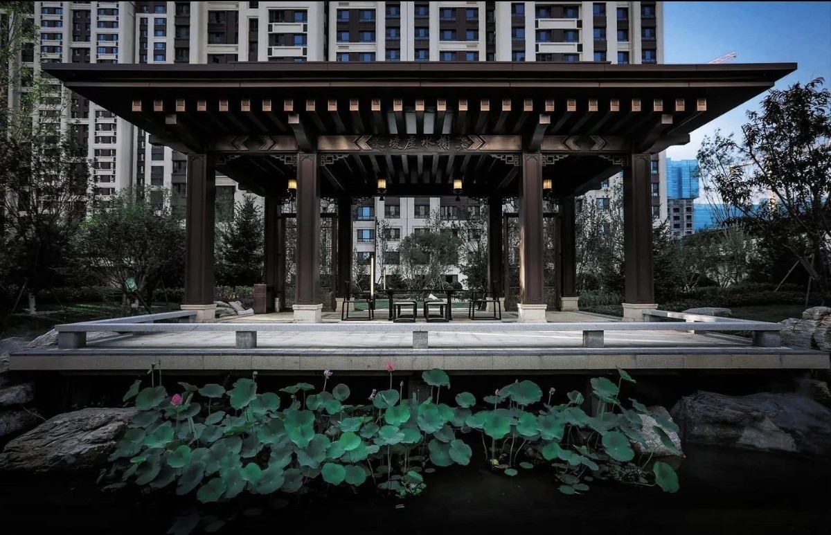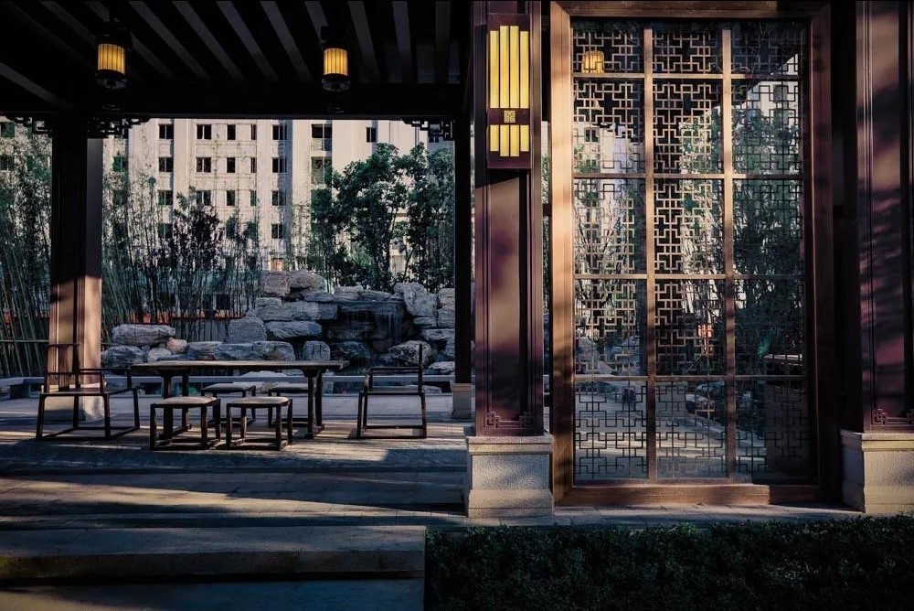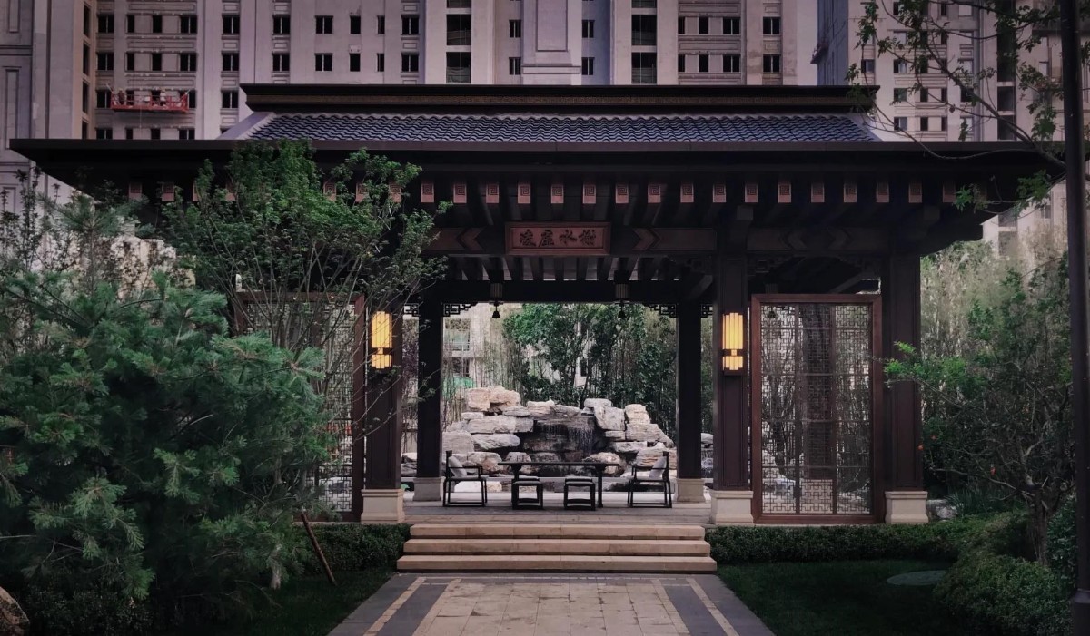通過分析建筑、北京文化、恭王府建筑形態(tài)等多重元素,設計師去繁求簡,布局遵循禮制,提取中式符號融入景觀,將恭王府花園嚴格貫穿的軸線布局、多逬四合院落(五進式院落空間)的組合方式結合現代人們的居住習慣設計成本案的空間構成形式,于一方寧靜再現帝王盛世之繁華,打造京派府邸中式景觀風格。
