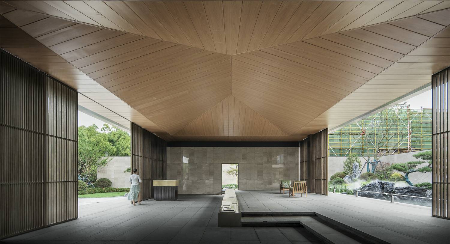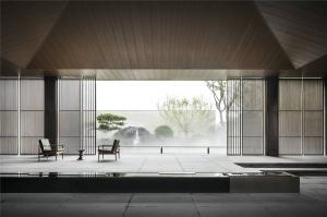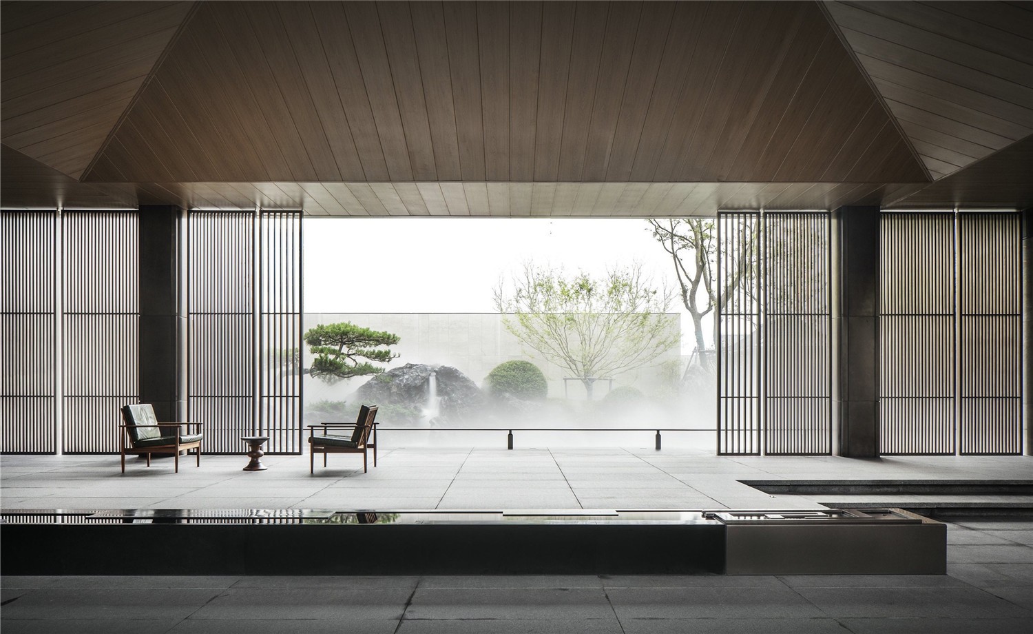 歇山頂下的接待花廳,由壓低的檐口和格柵框景出縱深的視線牽引。室內(nèi)排除了過多的結構冗余,形成無阻隔的軒敞空間,木紋鋁合金扣板吊頂帶來溫暖優(yōu)雅的感受。室內(nèi)外30厘米的標高,以及位于花廳中央的“曲水流觴”水軸裝置,將這154㎡的空間分隔成停留和通過兩部分。