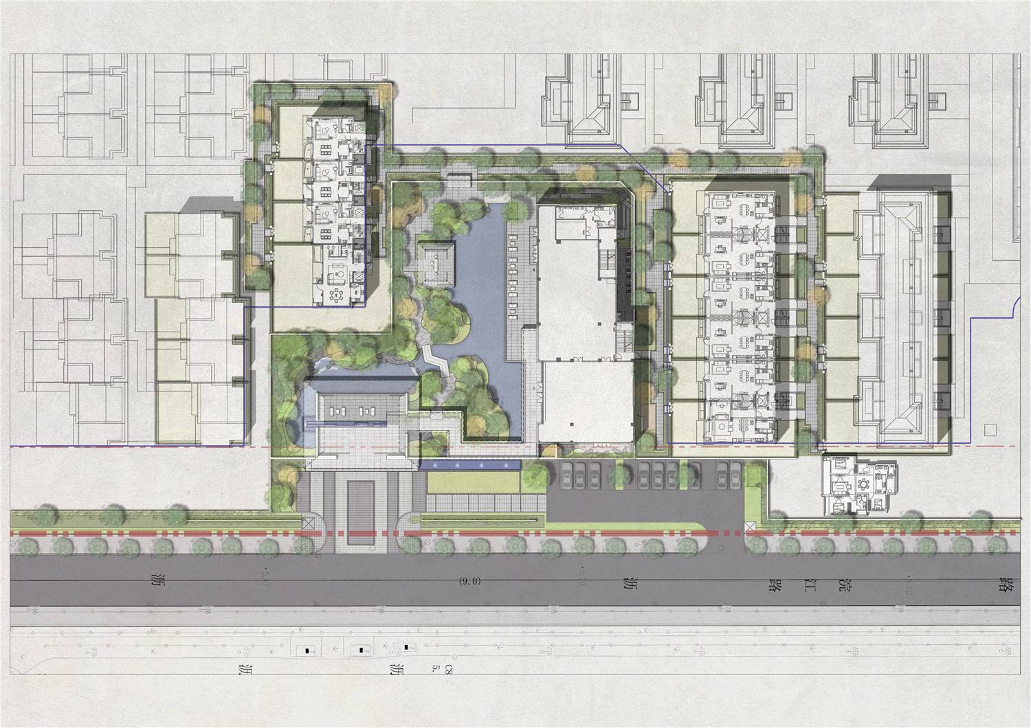 滿園整體占地201.4畝,容積率1.15,產(chǎn)品分為聯(lián)排合院、疊墅和洋房三種類型。從項目最早期,景觀團隊即參與到規(guī)劃和空間優(yōu)化工作中,意欲形成建筑景觀一體化的效果,融合于會稽山的自然文化氛圍之中。