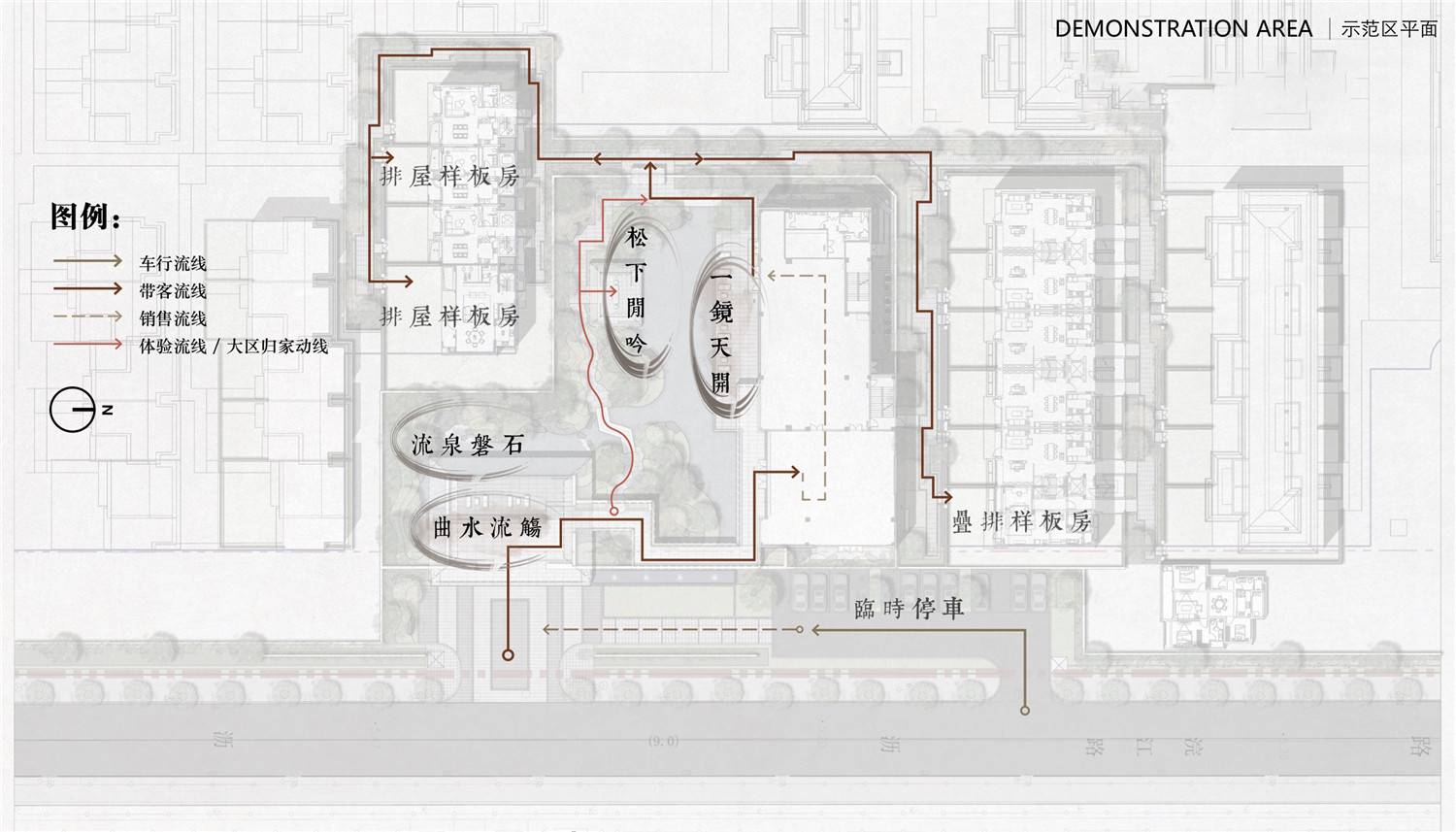 本次呈現(xiàn)的示范區(qū)位于“L”型景觀主軸的東部起始處,是整個項目的主入口園林,屬于“外園”,將來會被所有業(yè)主和外來消費的人群所共享。北側的二層建筑暫時用作銷售場地,在交付后將作為經(jīng)營空間為本區(qū)域提供生活服務。由于近遠期不同的使用模式,場地天然形成兩條動線需求,在銷售期兩條動線相聯(lián)成為一條體驗和游園環(huán)線,在交付后則分為業(yè)主歸家和經(jīng)營空間兩條內(nèi)外動線。