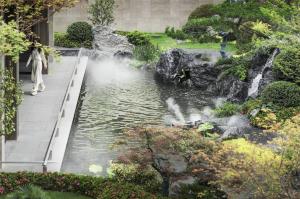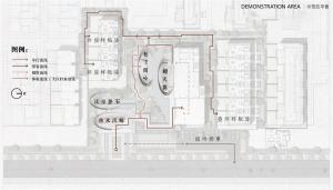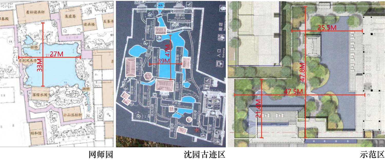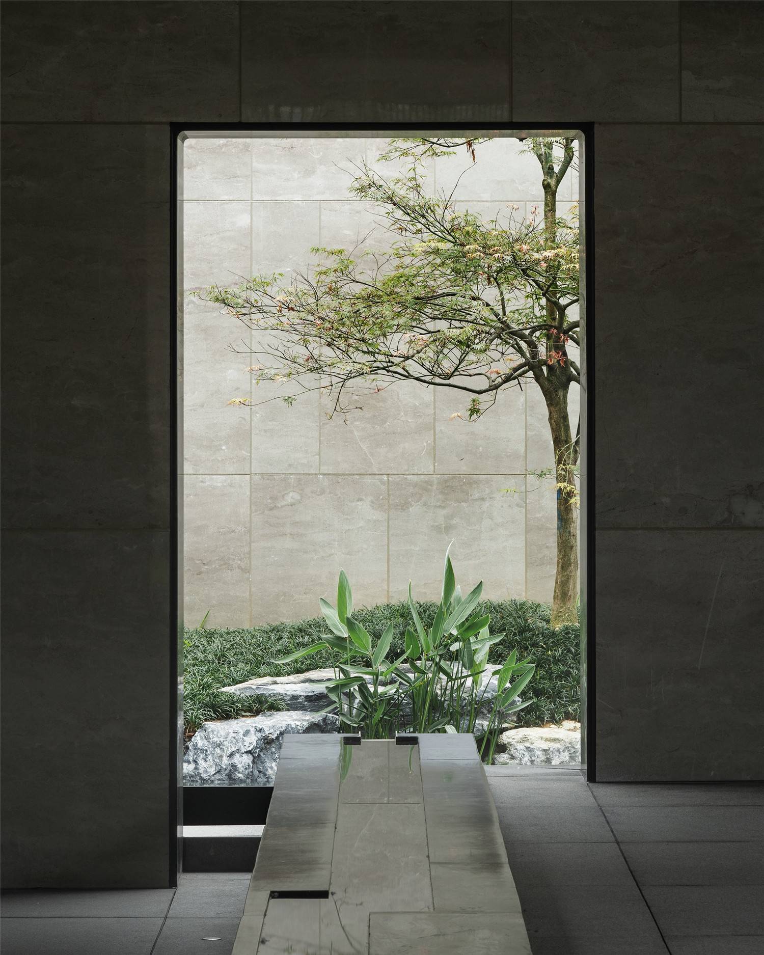 主庭園寬48米深25米,借鑒了紹興著名宋代園林——沈園的古跡核心區(qū)和蘇州網(wǎng)師園比例,期望創(chuàng)造以小見大的效果。