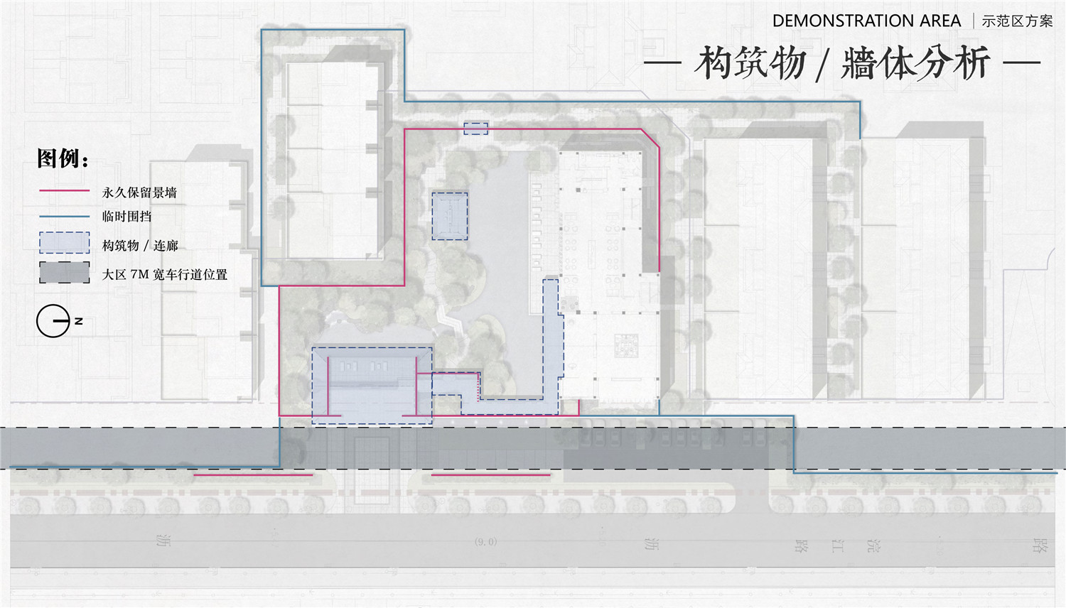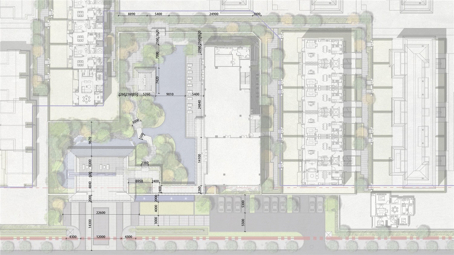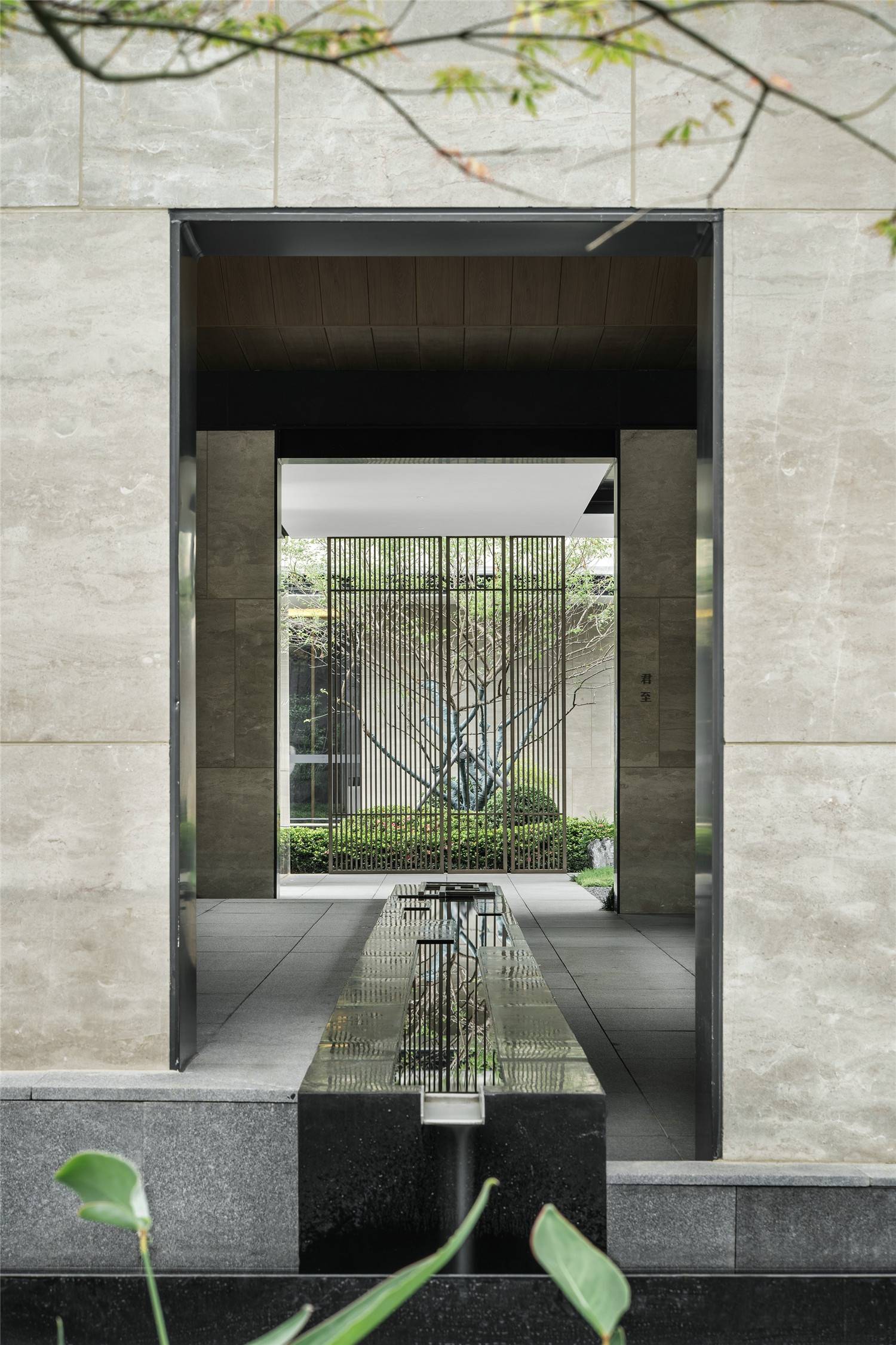 在最早的建筑總圖中,示范區(qū)是一個矩形,北側是二層的社區(qū)經(jīng)營性建筑,整個項目的主入口構筑物位于矩形用地南側的中間位置,并外凸于圍墻之外,是一個非常建筑感的形體,進入之后開門見山,一眼可見水面為主體的庭園。幾經(jīng)推敲之后,我們對總圖進行了優(yōu)化調(diào)整,將主入口南移并后退,取消了南側兩棟聯(lián)排住宅,在矩形主庭園之外增加了一進空間,同時將展示圍墻南北雙向延長,從原來的67米增加到85米。