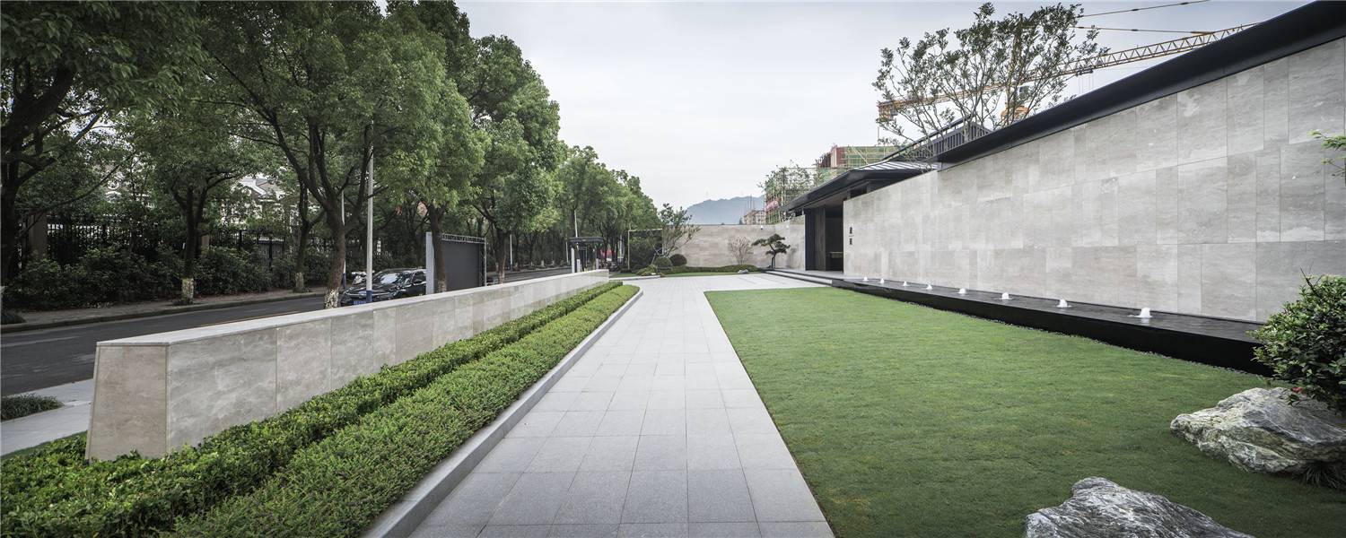 前場借會稽山為遠景,在原有紅線的基礎上,將入口花廳和景墻進行了謙虛的留白退讓,形成敞開式迎賓空間,東側浣江路的香樟行道樹自然形成前景。將停車區(qū)設置于前場的北側,引導來訪者沿著路徑望向視線盡頭的會稽山。以宋代歇山頂為原型的入口花廳,高7.34m,檐口長18.4m,寬12m,與端景處的灌木球和迎客黑松,在水平延展的圍墻前,構成一幅不施繁飾、自然典雅的中式畫卷。