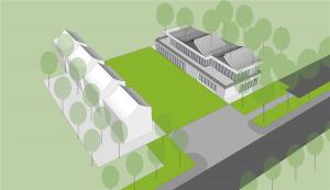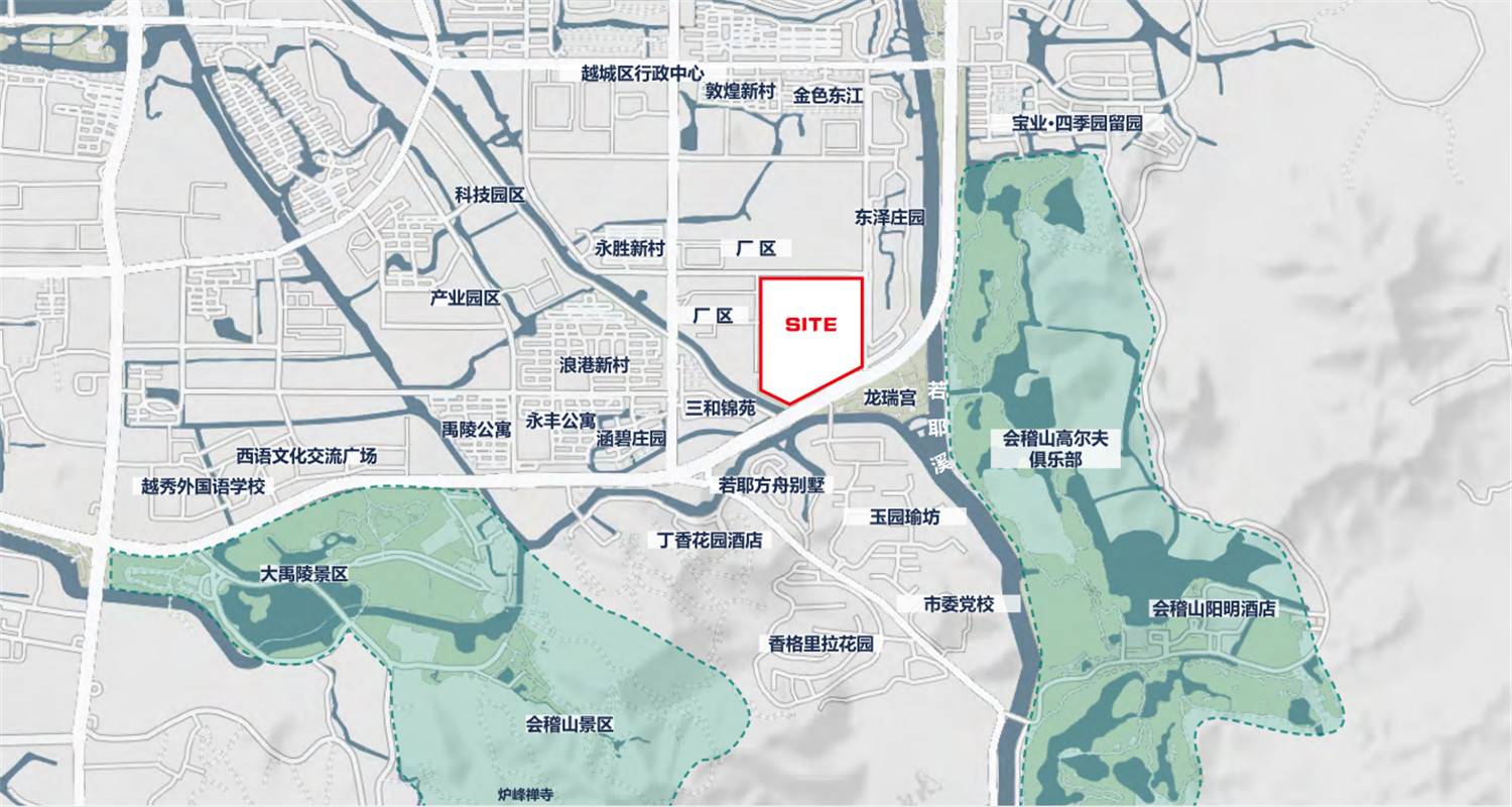 第一次來勘地,離基地還有幾公里,已經(jīng)能看見蔥蘢的會稽山和其上矗立的大禹像。這個區(qū)域由于景區(qū)的視線控制因素,有嚴格的建筑高度限制,周圍的建成區(qū)域均是掩映在綠蔭之中,與會稽山古老而寧靜的姿態(tài)并存?;貣|臨浣江路,北至嵊山路,南側與紹興二環(huán)路留有米寬的綠帶。東側、北側道路都有種植時間久、姿態(tài)茂盛的雙側香樟行道樹,給予基地優(yōu)良的微觀現(xiàn)狀環(huán)境。