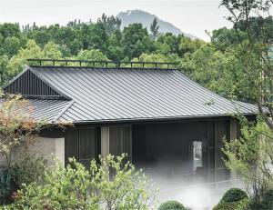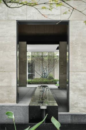 滿園在意境和形制上對傳統(tǒng)園林和建筑進行借鑒,在材料和工藝上,則采用了完全現(xiàn)代的建構語言。凱撒灰石材墻面和深色金屬瓦屋面筑定了整體沉著大氣的基調(diào),進一步用木紋金屬吊頂、金屬格柵和欄桿勾勒工藝細節(jié)。造園疊山則選用了黑山石,與整體氛圍更為融合。