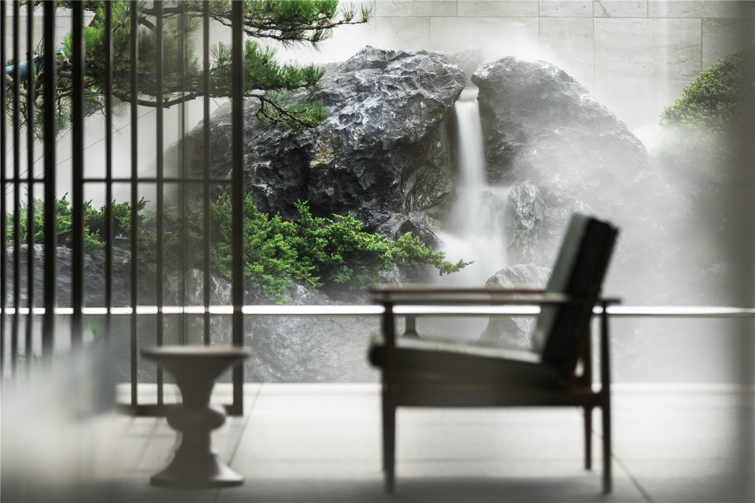 最早流傳于東晉文人士大夫歸隱山林后的“曲水流觴”雅集,成為了二進空間的索引。我們通過在磐石裝置上模擬出縱橫曲折的水道,相仿古人灑脫飄逸的飲酒作詩之意。來水無影的水軸被視為整個項目的起始水源,引伸至門洞外,串聯(lián)起高下動靜相化的山泉瀑布意景。山澗自上流下,伴奏出一曲“松間問泉”的疊水清音。