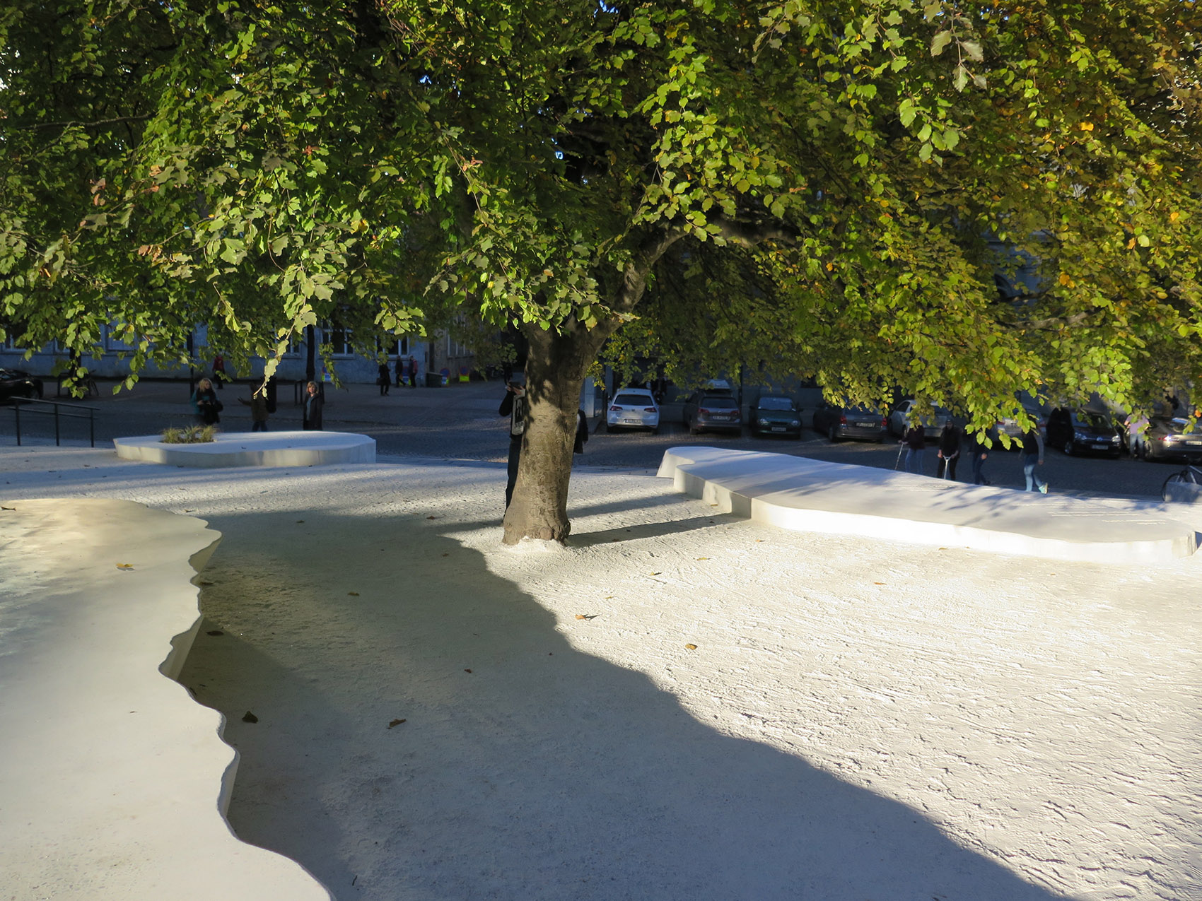 約2000平方米的紀(jì)念廣場(chǎng)呈現(xiàn)出水平微地形,由挪威本土的白色礫石鋪就,上面設(shè)置了七個(gè)現(xiàn)場(chǎng)澆注白色混凝土“島嶼”,并刻有一些紀(jì)念性文字。其中一個(gè)“島嶼”被用作舉辦公共活動(dòng)的開(kāi)放舞臺(tái)。 場(chǎng)地內(nèi)栽植了在春,夏,秋三季可以開(kāi)白色花朵的植物。設(shè)計(jì)師還在混凝土表面上設(shè)置了一個(gè)帶有77個(gè)電光源的黑色淺水池--以紀(jì)念在2011年7月22日在襲擊事件中的77名喪生者。水池的入水口處會(huì)在表面泛起漣漪,并在寒冷的冬季,升起水霧。
