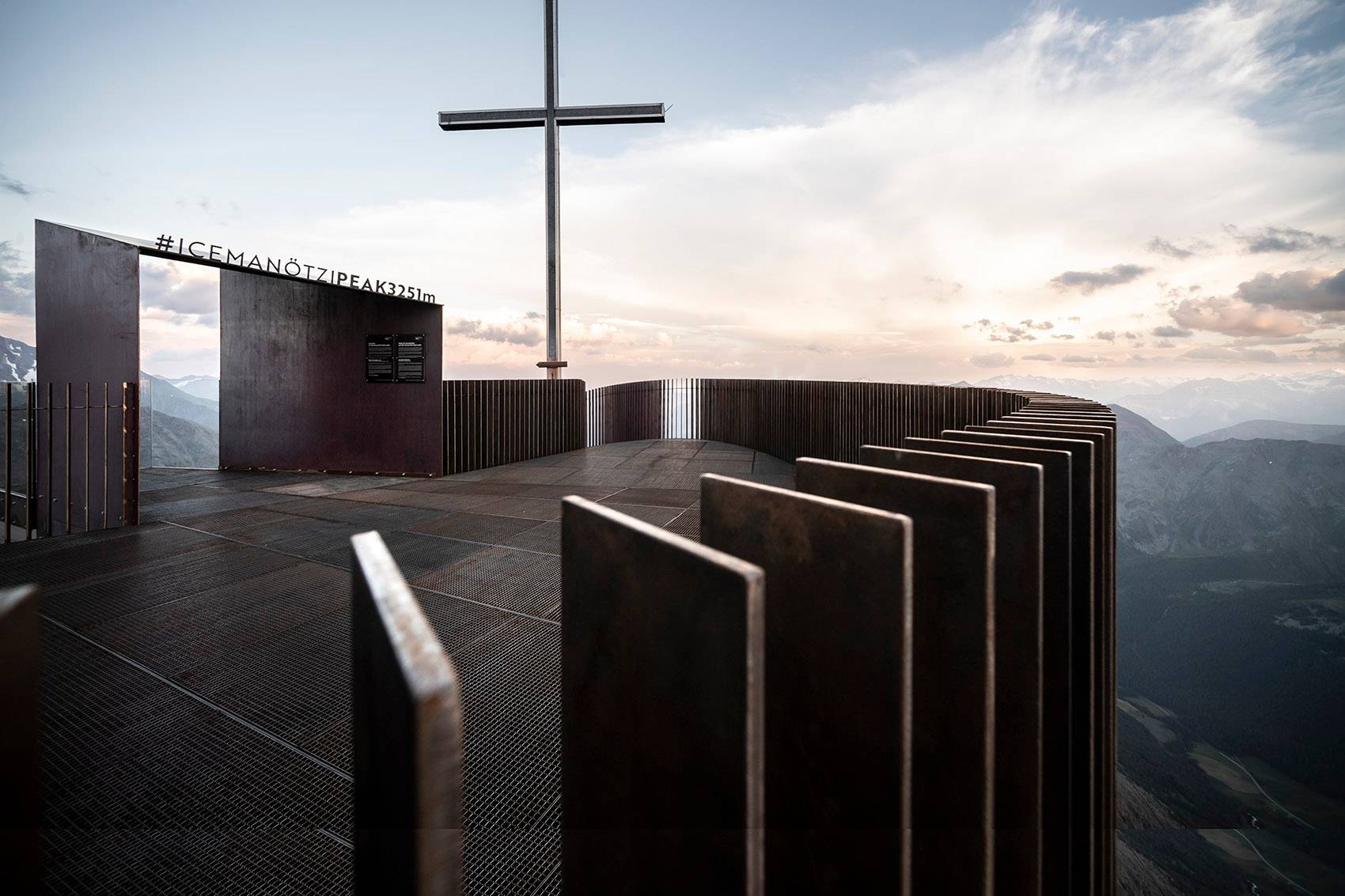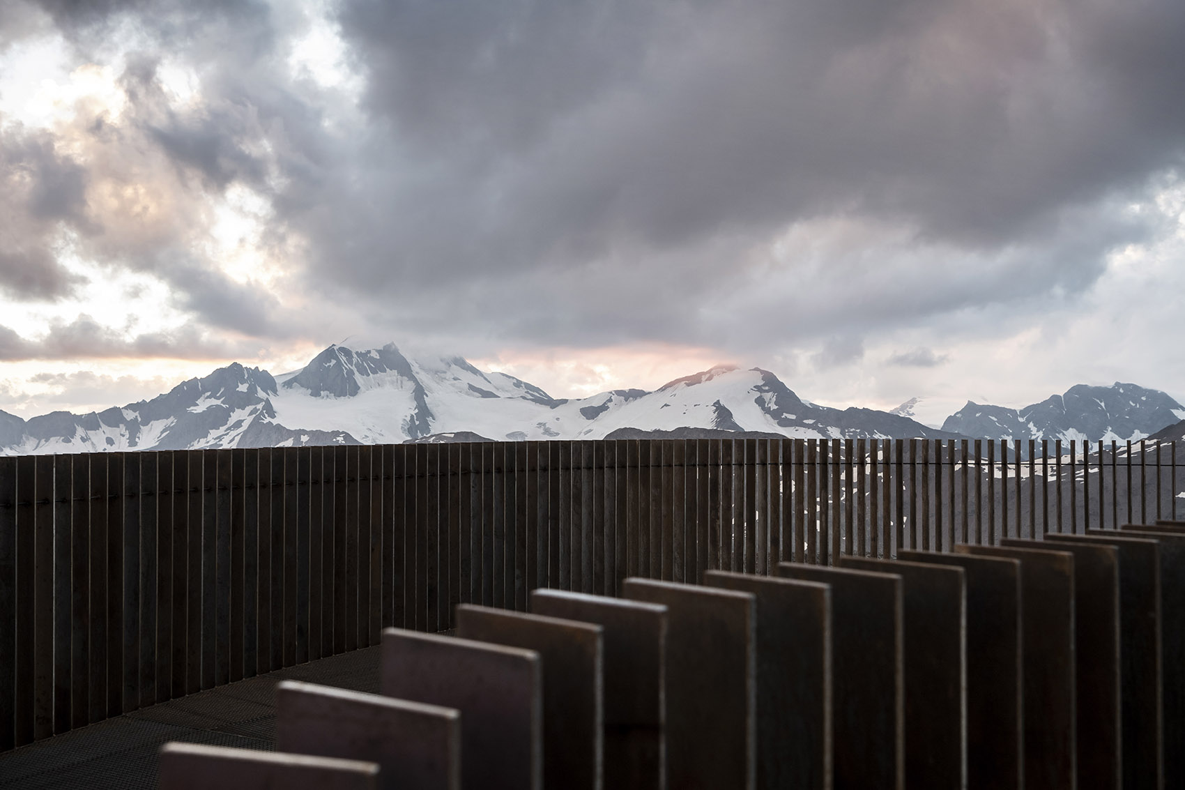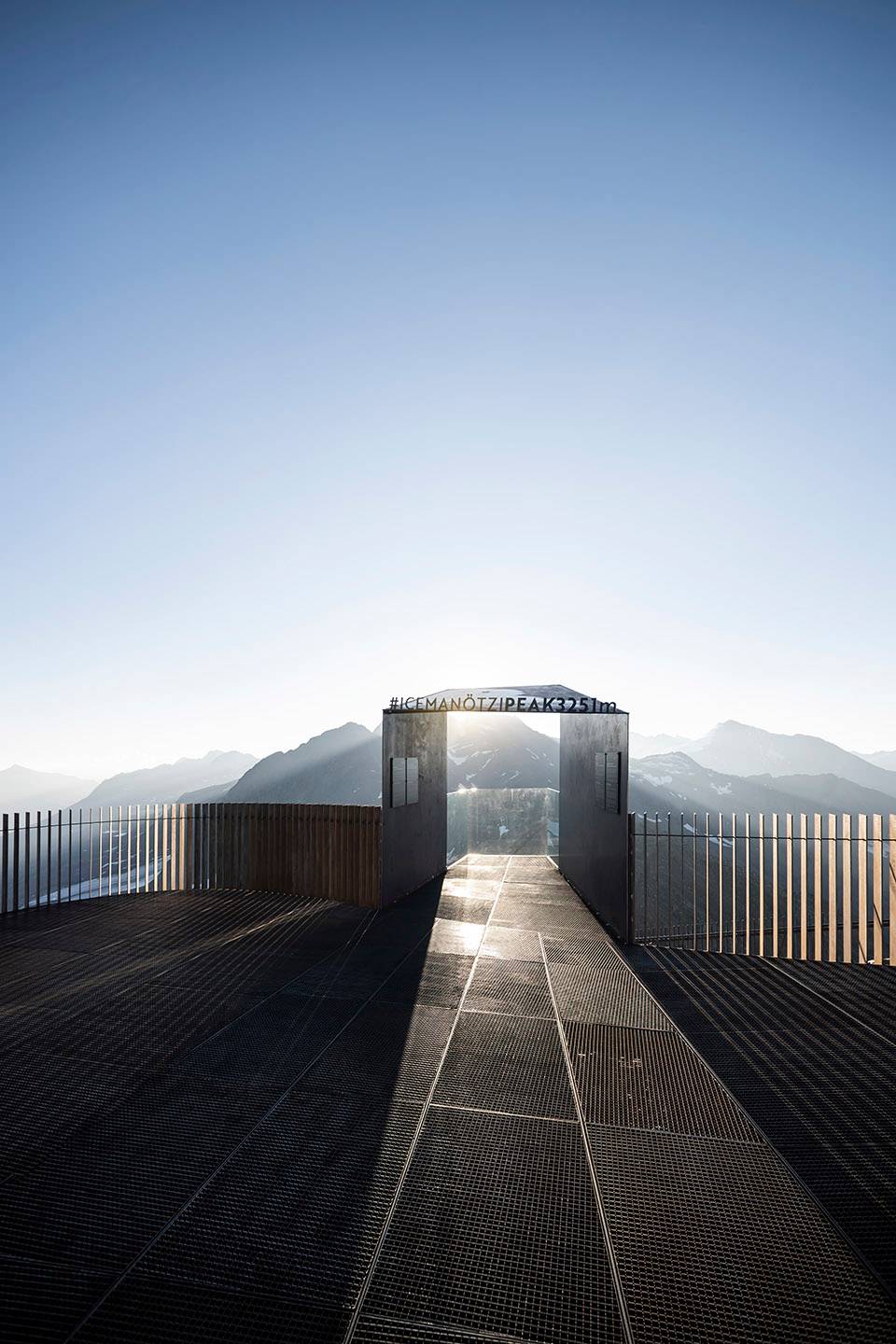Speaking of time, a geometric funnel was cut into the undulating viewing platform to direct viewers eyes towards something timeless – the place where ?tzi was found. Only a few meters from the Austrian border, the angle of the viewing funnel takes the visitor on a carefully crafted, intellectual journey to the Iceman. The viewing funnel was designed with Corten steel, and like the slats on the railing, the steel turns dark brown, grey and black as it yields to the elements and becomes one with its surroundings.