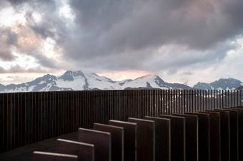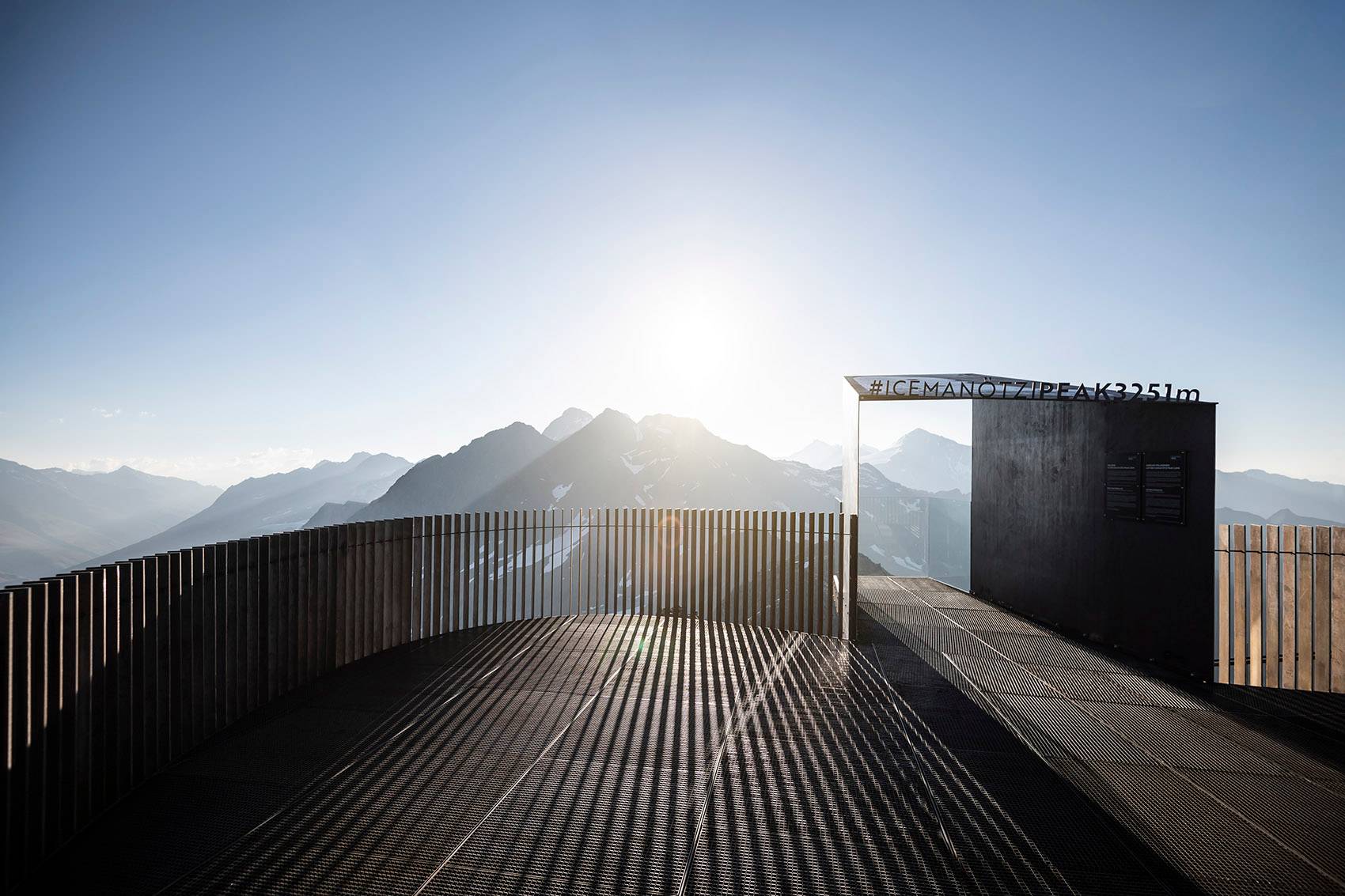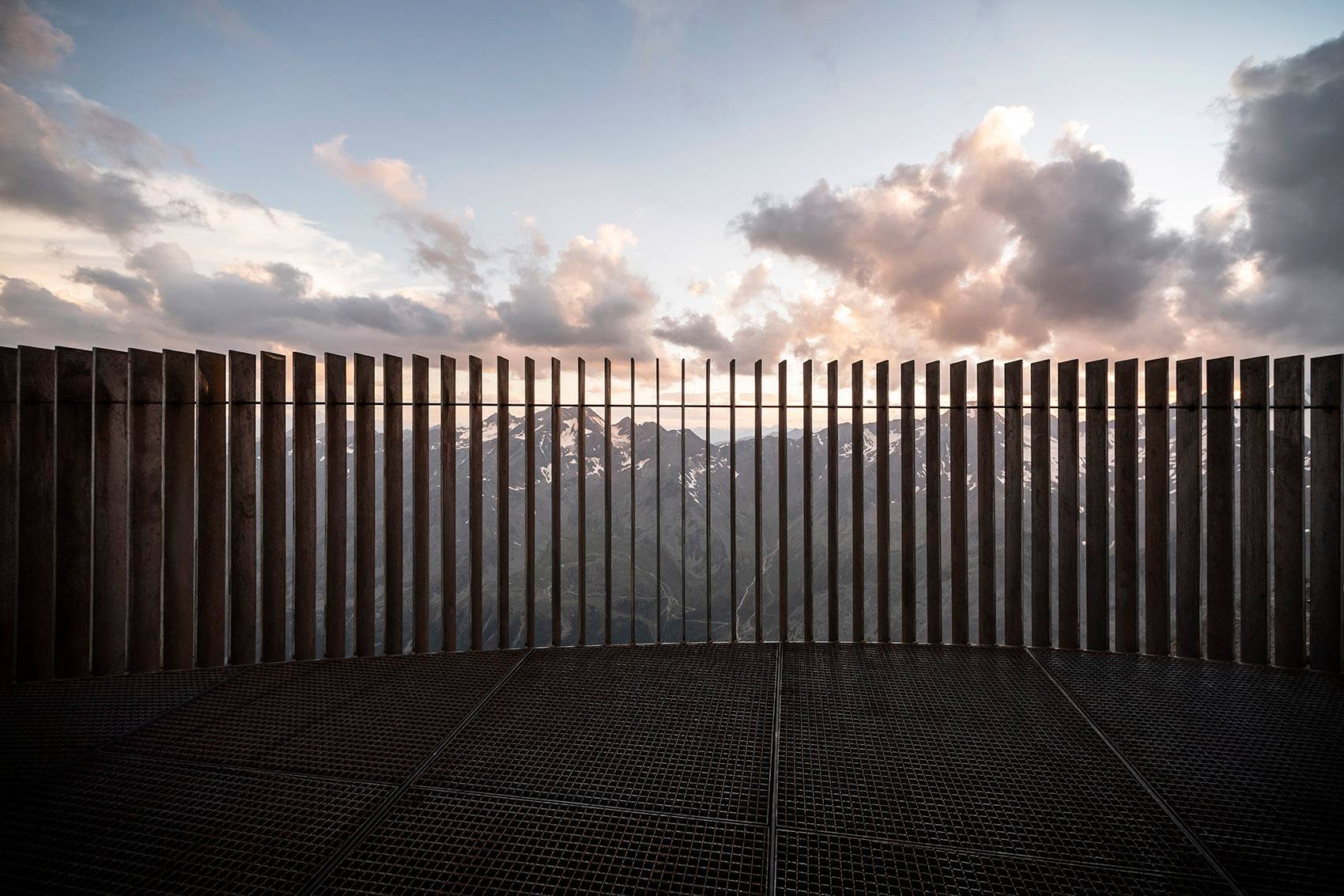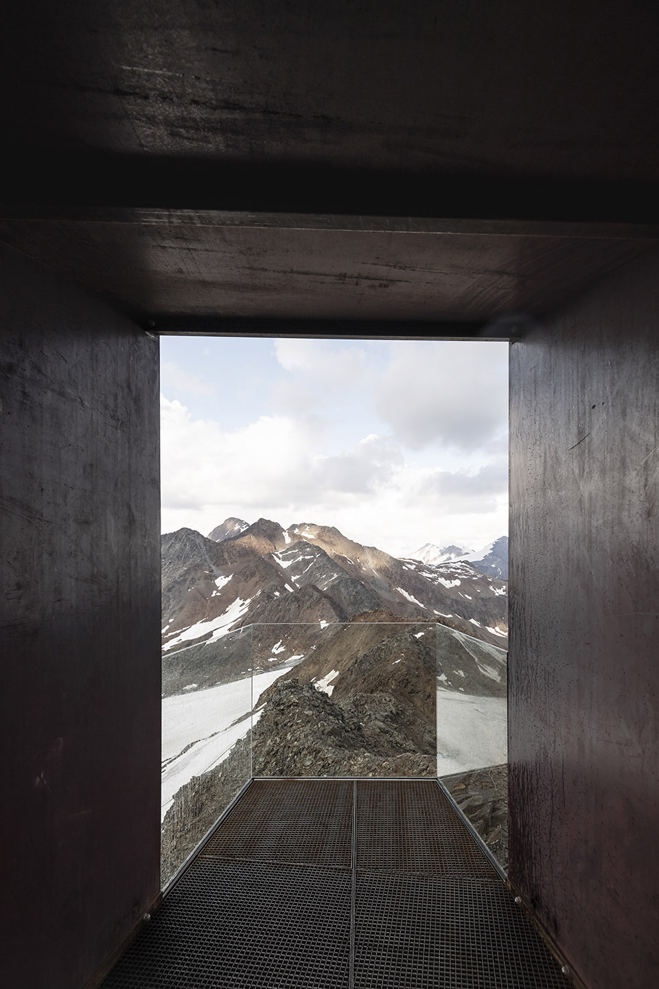 Speaking of time, a geometric funnel was cut into the undulating viewing platform to direct viewers eyes towards something timeless – the place where ?tzi was found. Only a few meters from the Austrian border, the angle of the viewing funnel takes the visitor on a carefully crafted, intellectual journey to the Iceman. The viewing funnel was designed with Corten steel, and like the slats on the railing, the steel turns dark brown, grey and black as it yields to the elements and becomes one with its surroundings.