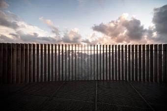 景觀臺細長的橫梁依地形而設(shè),上面鋪設(shè)了網(wǎng)格平臺,整體由垂直的耐候鋼板圍合。垂直的圍護欄桿排列出柔和的曲線,創(chuàng)造出神奇的視覺效果。