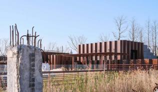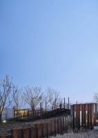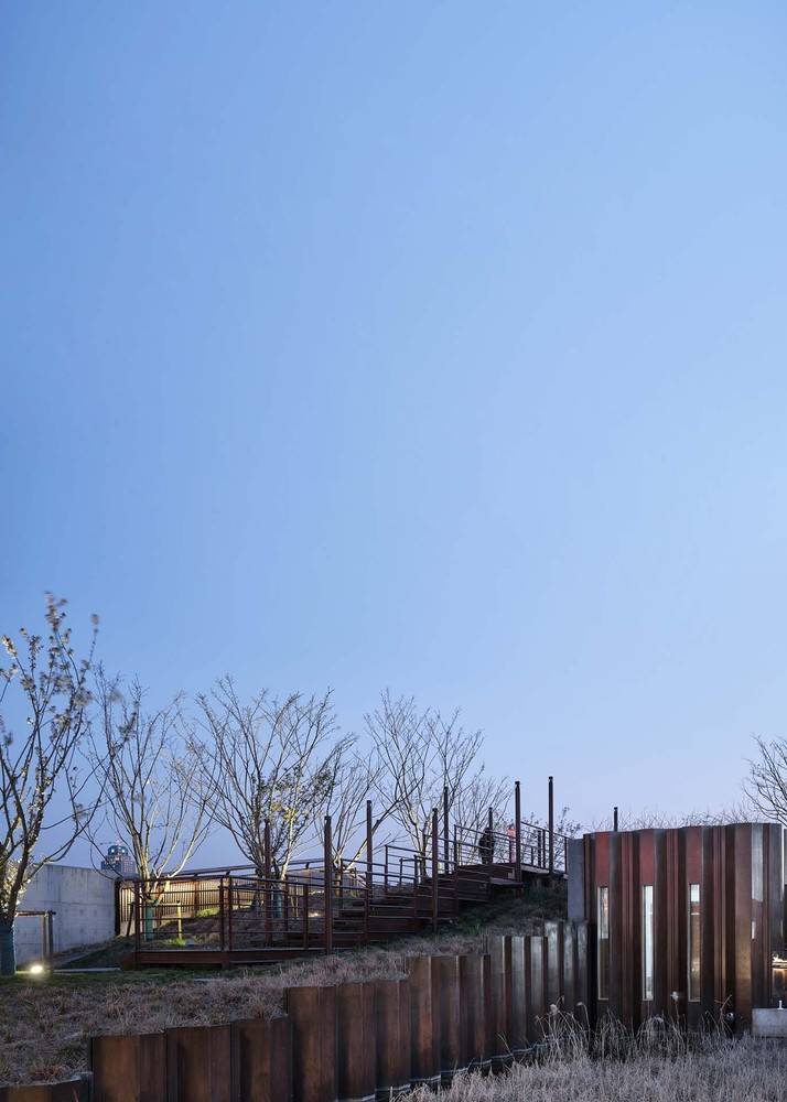 土坡下,以維護池塘基坑的蝕銹鋼板作為外部模板,現(xiàn)澆設(shè)備間與廁所,與池塘的建筑語言相統(tǒng)一。將從別處拆卸下來的三個煤斗正立,置于其中一方池塘之上,作為雕塑形成視覺焦點。保留江岸上的傳送帶,將其中半圓形的橡皮履帶更換為焊接的半圓形鋼板,其上覆土,種植花草。