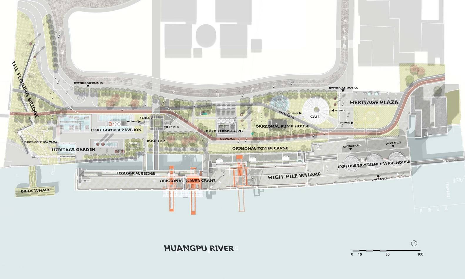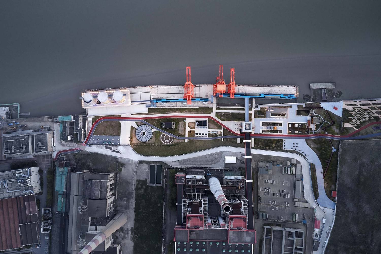 電廠段的工業(yè)遺構(gòu)整飭始于兩個錨點。一方面,公共空間的營造在理解原先工藝流程的基礎(chǔ)上展開:高105米的煙囪,江岸上的鶴嘴吊、輸煤棧橋、傳送帶、清水池、濕灰儲灰罐、干灰儲灰罐等作業(yè)設(shè)施有著特殊的空間體量和形式,這些場地遺存為我們提供了塑造場所精神的出發(fā)點。