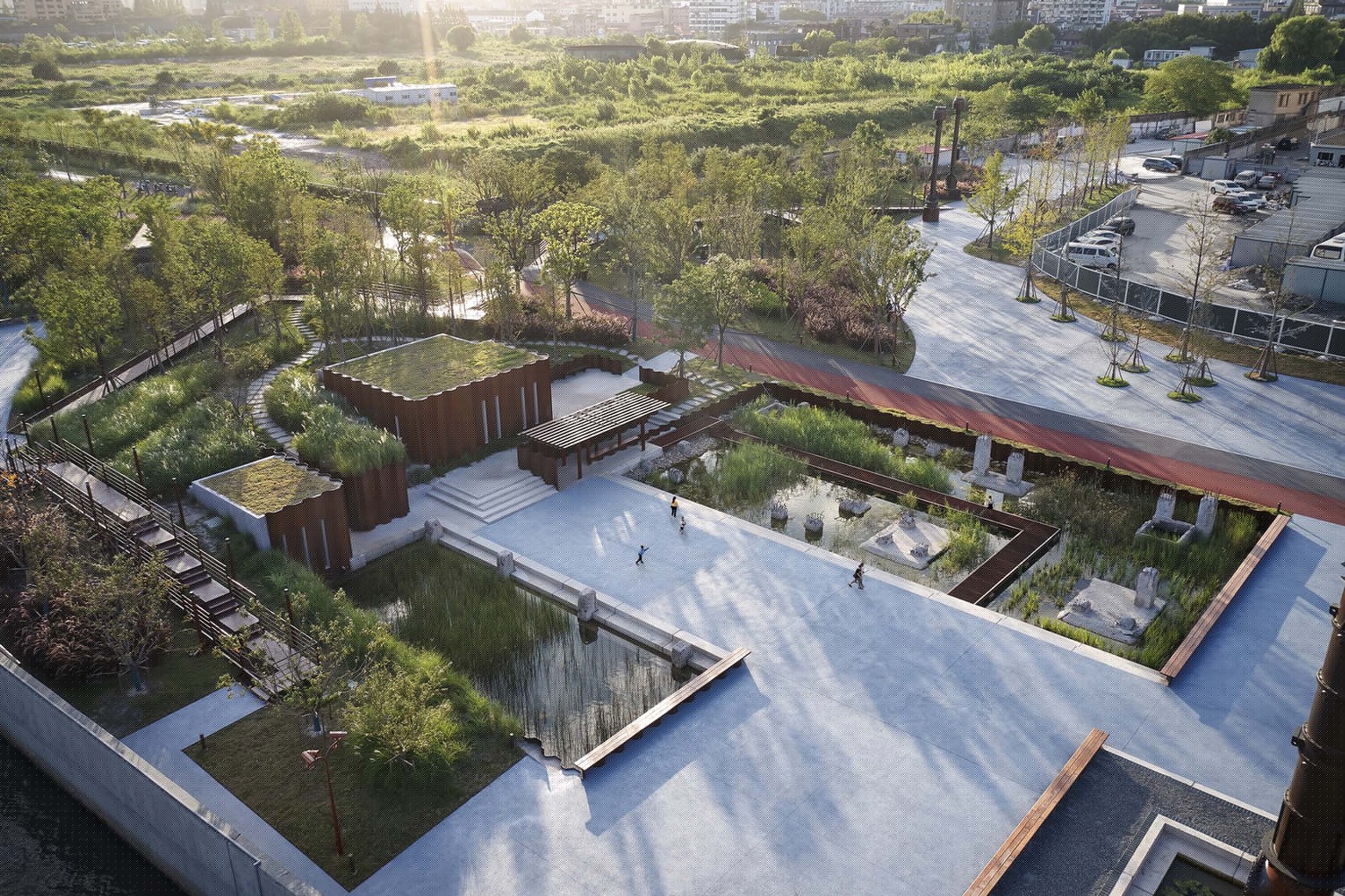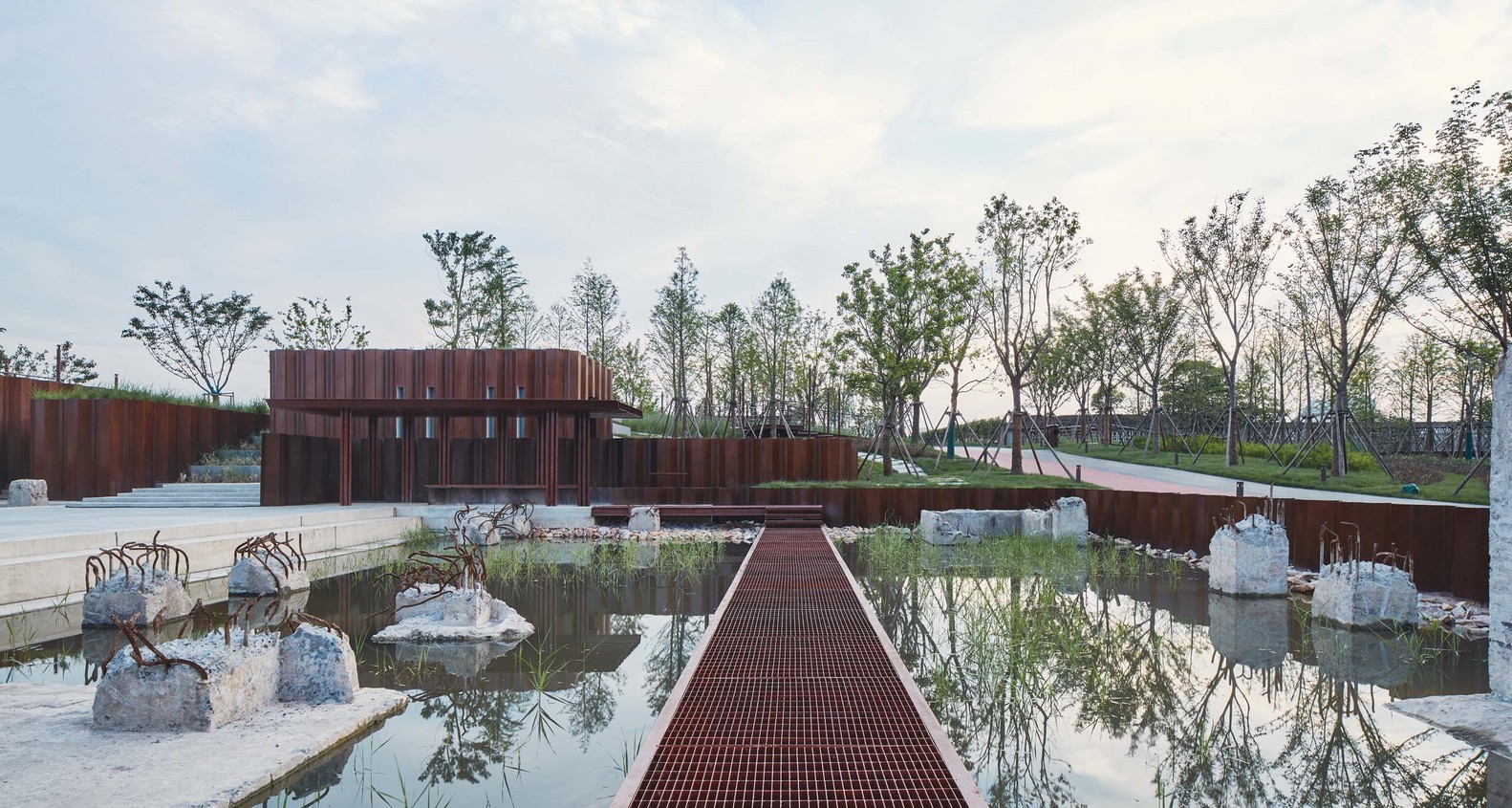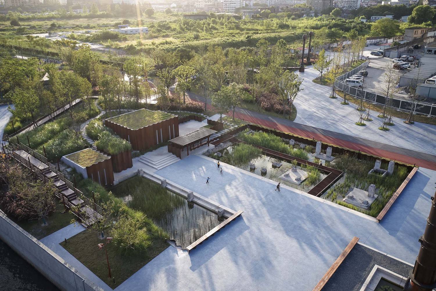 另一方面,采用有限介入、低沖擊開發(fā)的策略,在尊重原有廠區(qū)空間基礎(chǔ)和原生形態(tài)的基礎(chǔ)上進行生態(tài)修復改造。保留了原本的地貌狀態(tài),形成可以匯集雨水的低洼濕地。植物配植以原生草本植物和耐水喬木池杉為主,同時配以輕介入的鋼結(jié)構(gòu)景觀構(gòu)筑物,形成別具原生野趣和工業(yè)特色的景觀環(huán)境。