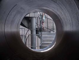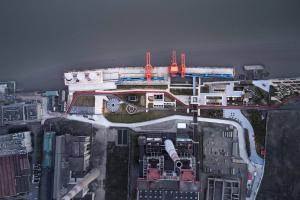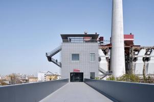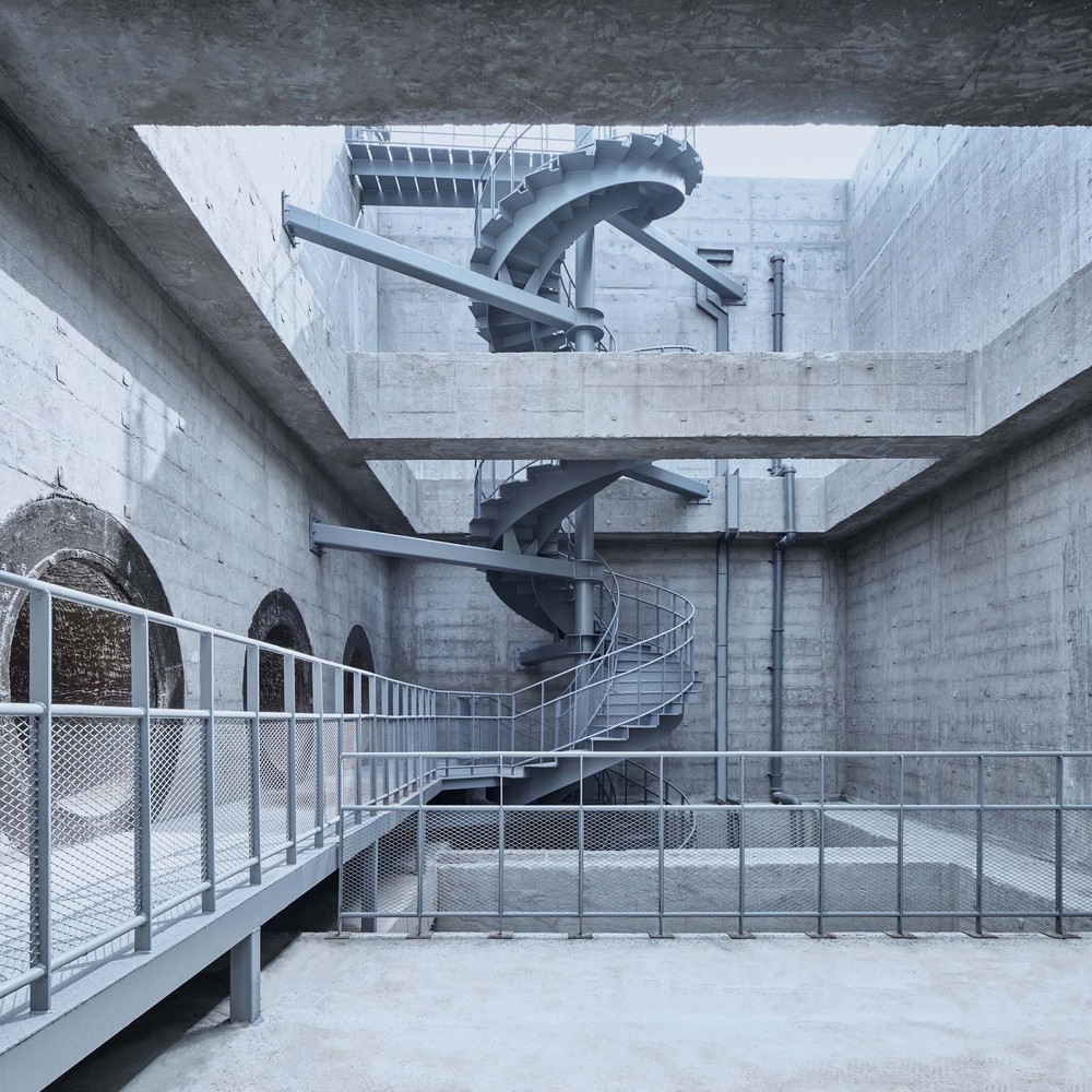 灰倉藝術(shù)空間本是電廠臨江的三個干灰儲灰罐,通過增設(shè)兩塊景觀平臺,將原先獨立的三個灰罐連接成一個統(tǒng)一的整體。并通過采用朦朧界面的處理手法,將原先15米通高的封閉灰倉進行改造。整個空間的使用模式被想象成為一組完全公共的漫游路徑,從底部的混凝土框架一直盤繞至灰倉頂部。在形成這樣一個漫游的海洋后,以一種類似plug-in(插入城市)的模式將6個功能未確定的空間連同一組折跑樓梯一同插入。而在藝術(shù)品介入后最終形成了藝術(shù)討論和公共漫游緊密咬合的空間觸動模式。