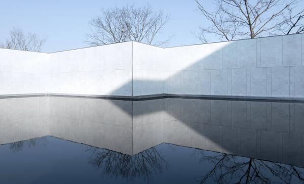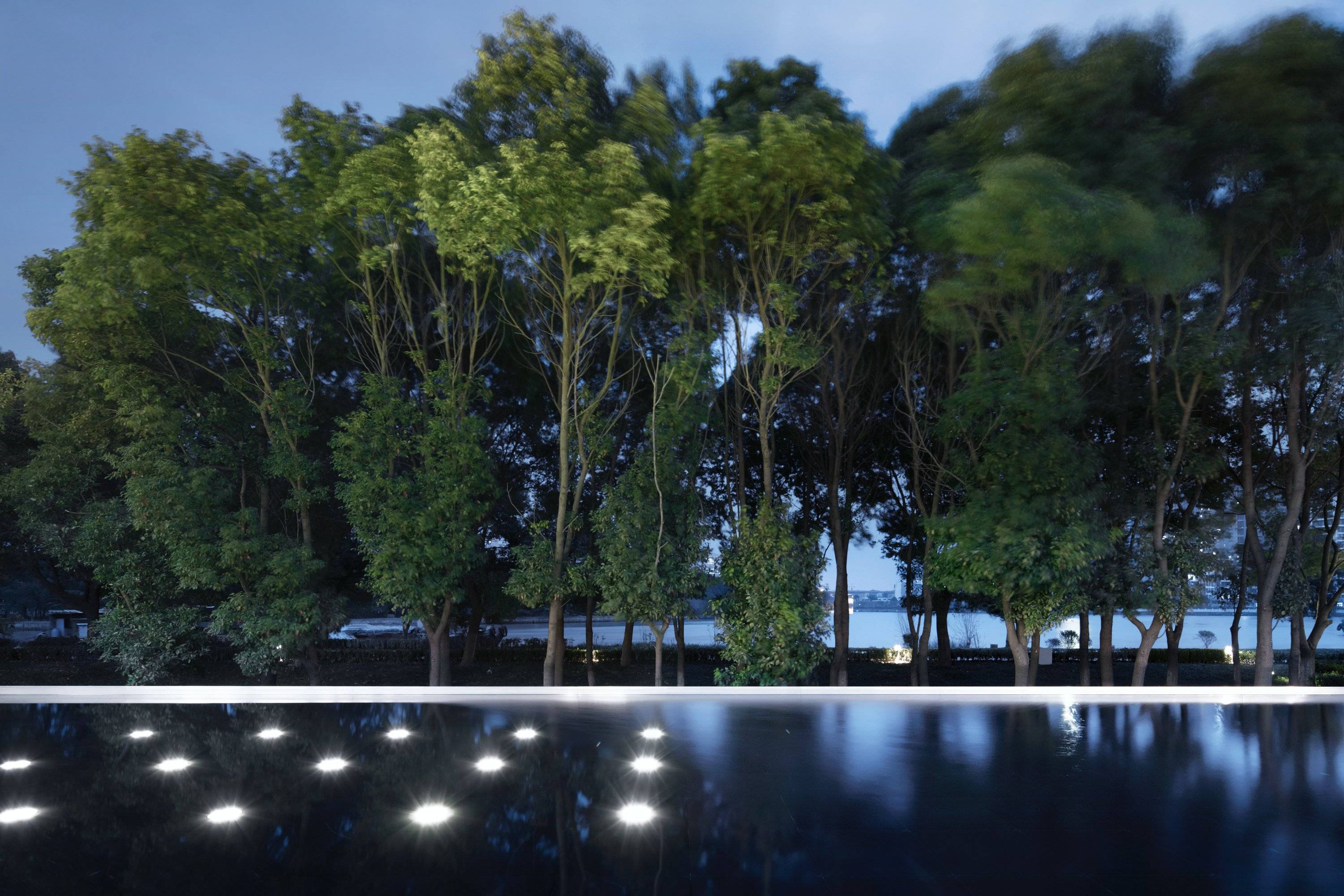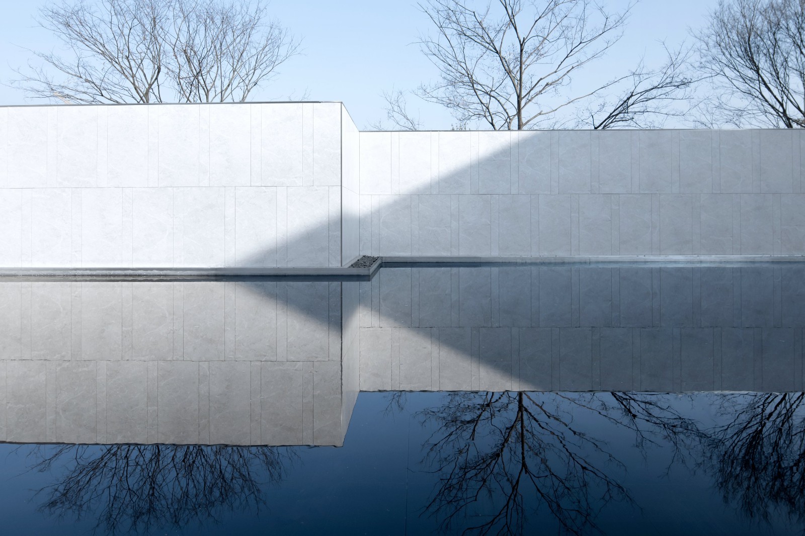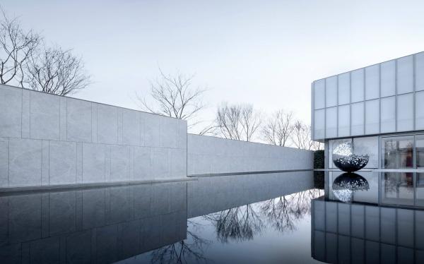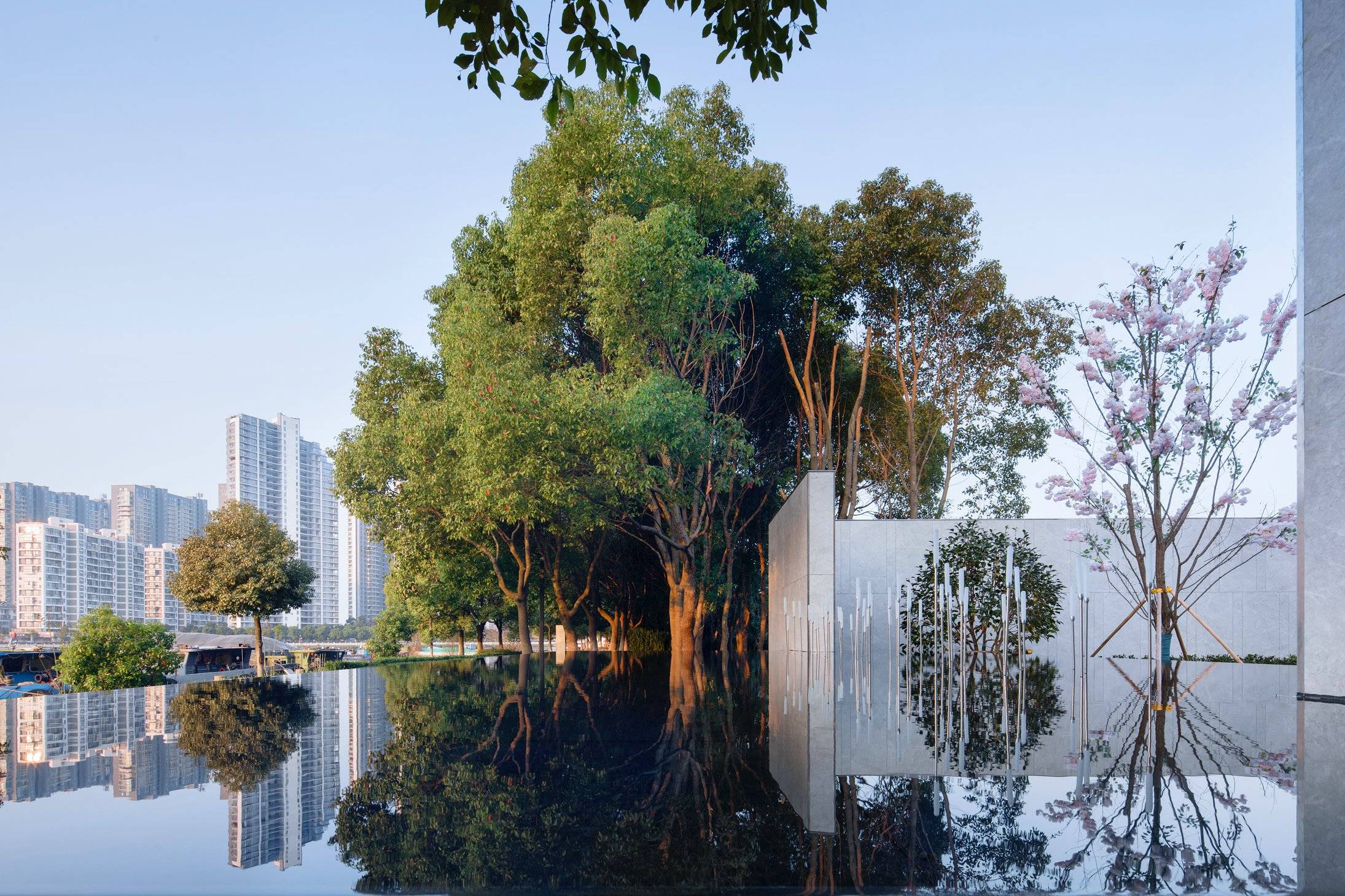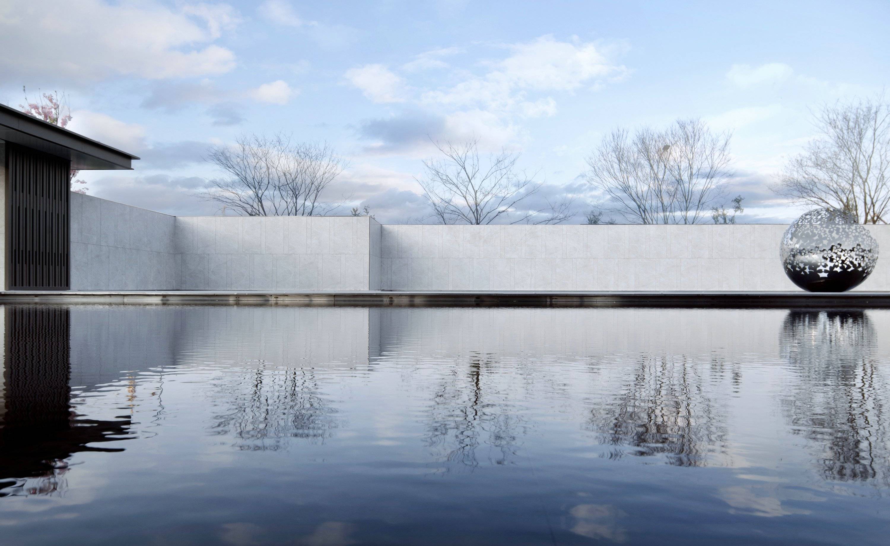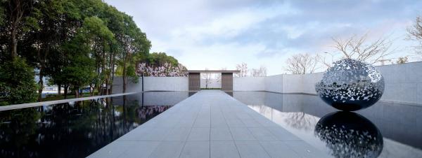 入口的禮儀空間,在還未進(jìn)入時便可觀望到遠(yuǎn)處的景色。設(shè)計(jì)希望能引入外部的河面景色,使之成為場地景觀的一部分。由于場地標(biāo)高與河面標(biāo)高具有一定高差,我們反復(fù)推敲了入口處的標(biāo)高和禮儀空間端景的水景高度,現(xiàn)場搭模,反復(fù)調(diào)整,最終完成了無邊水景效果。