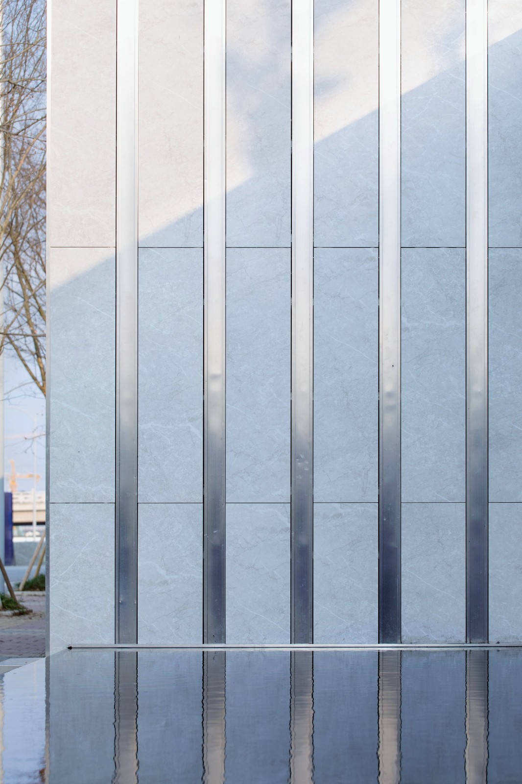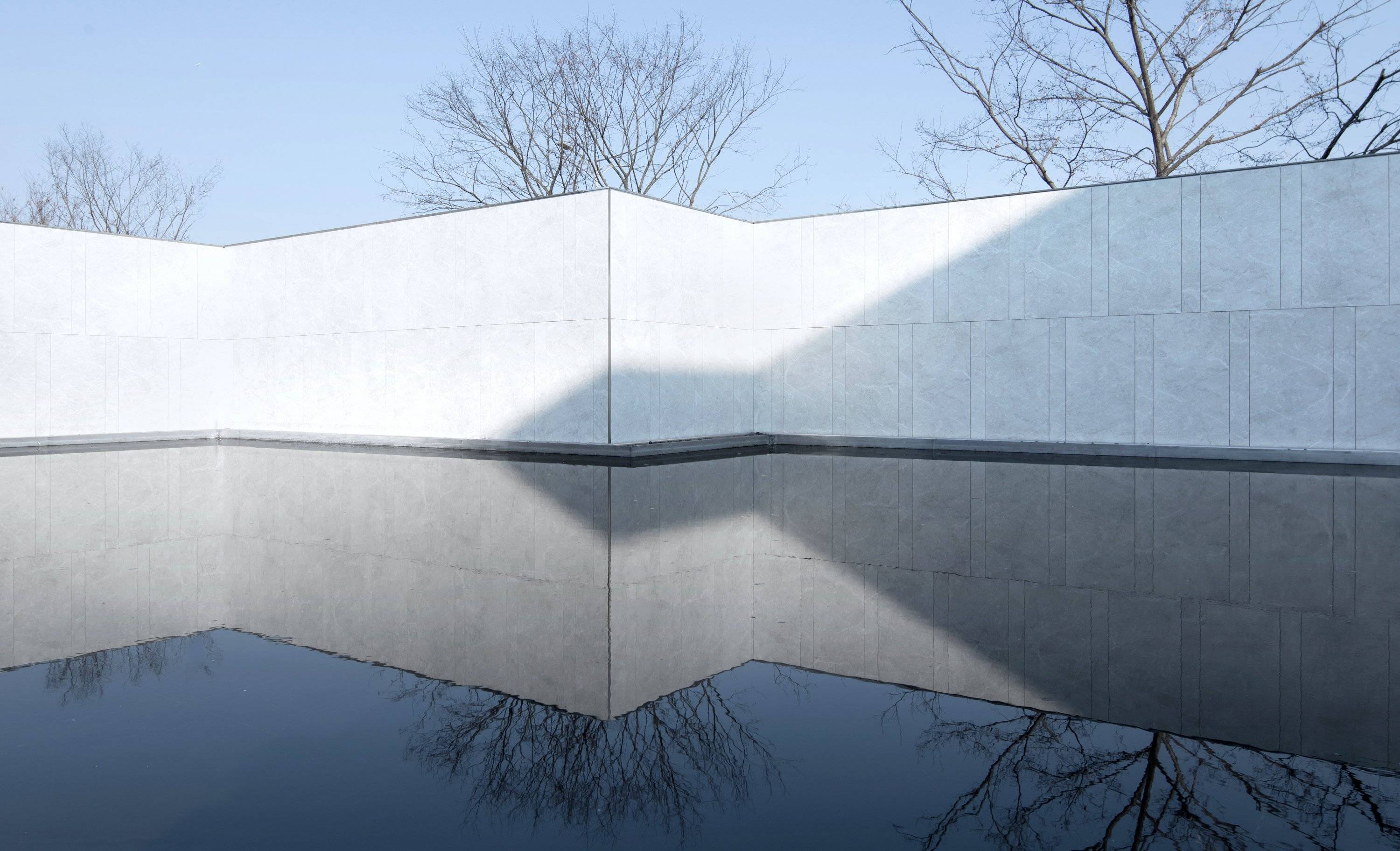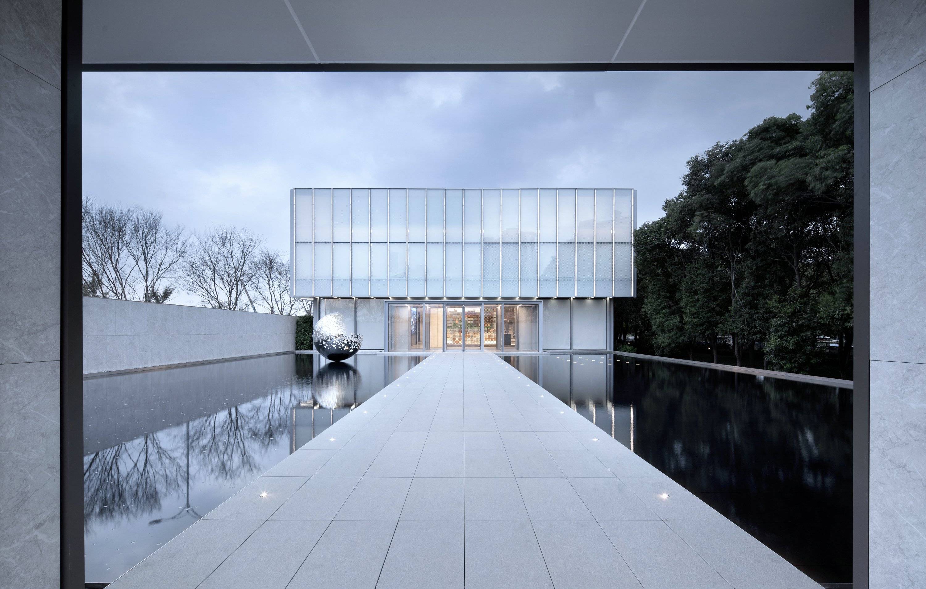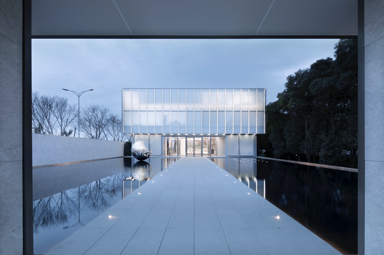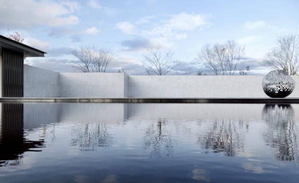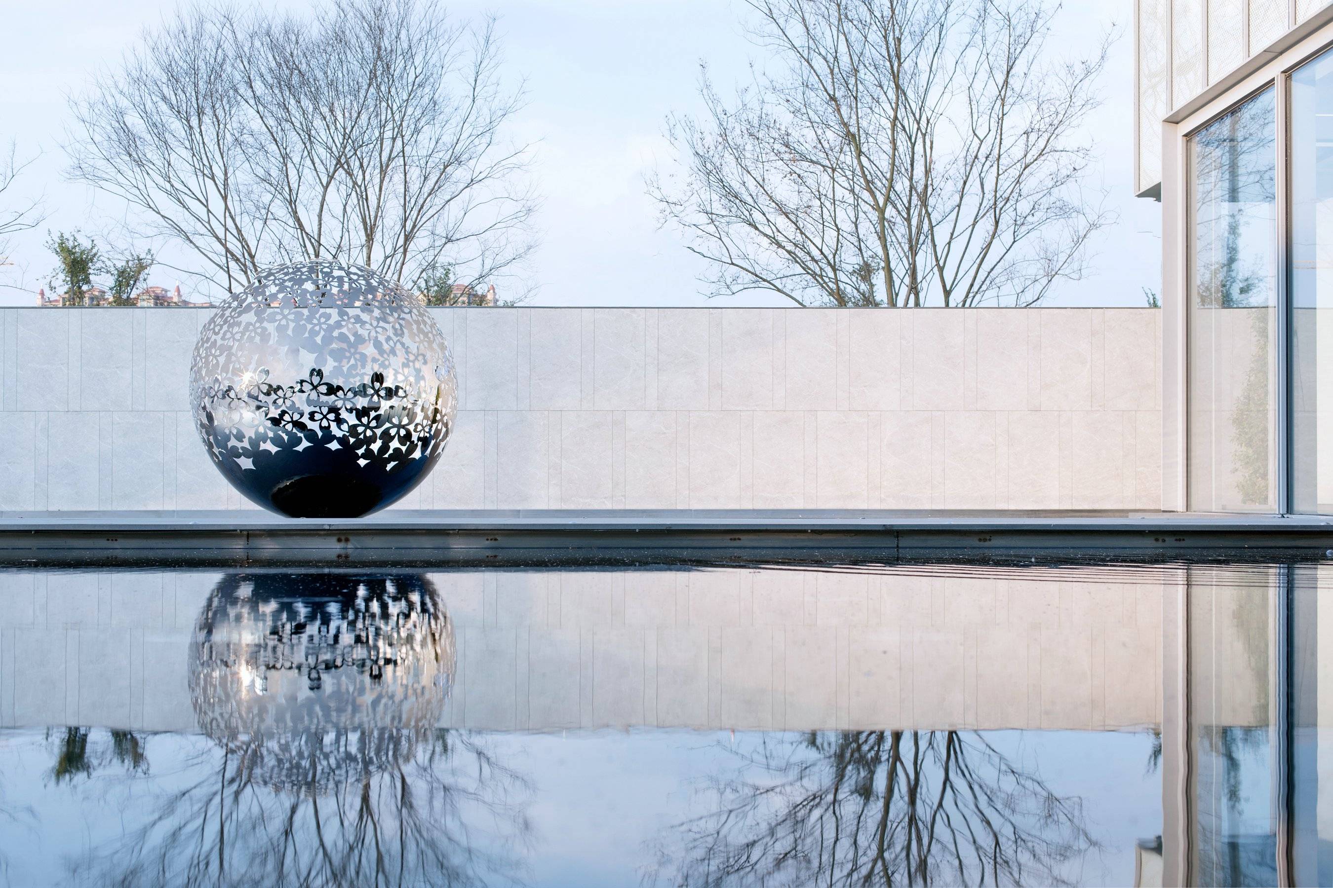 入口的禮儀空間,在還未進(jìn)入時便可觀望到遠(yuǎn)處的景色。設(shè)計(jì)希望能引入外部的河面景色,使之成為場地景觀的一部分。由于場地標(biāo)高與河面標(biāo)高具有一定高差,我們反復(fù)推敲了入口處的標(biāo)高和禮儀空間端景的水景高度,現(xiàn)場搭模,反復(fù)調(diào)整,最終完成了無邊水景效果。