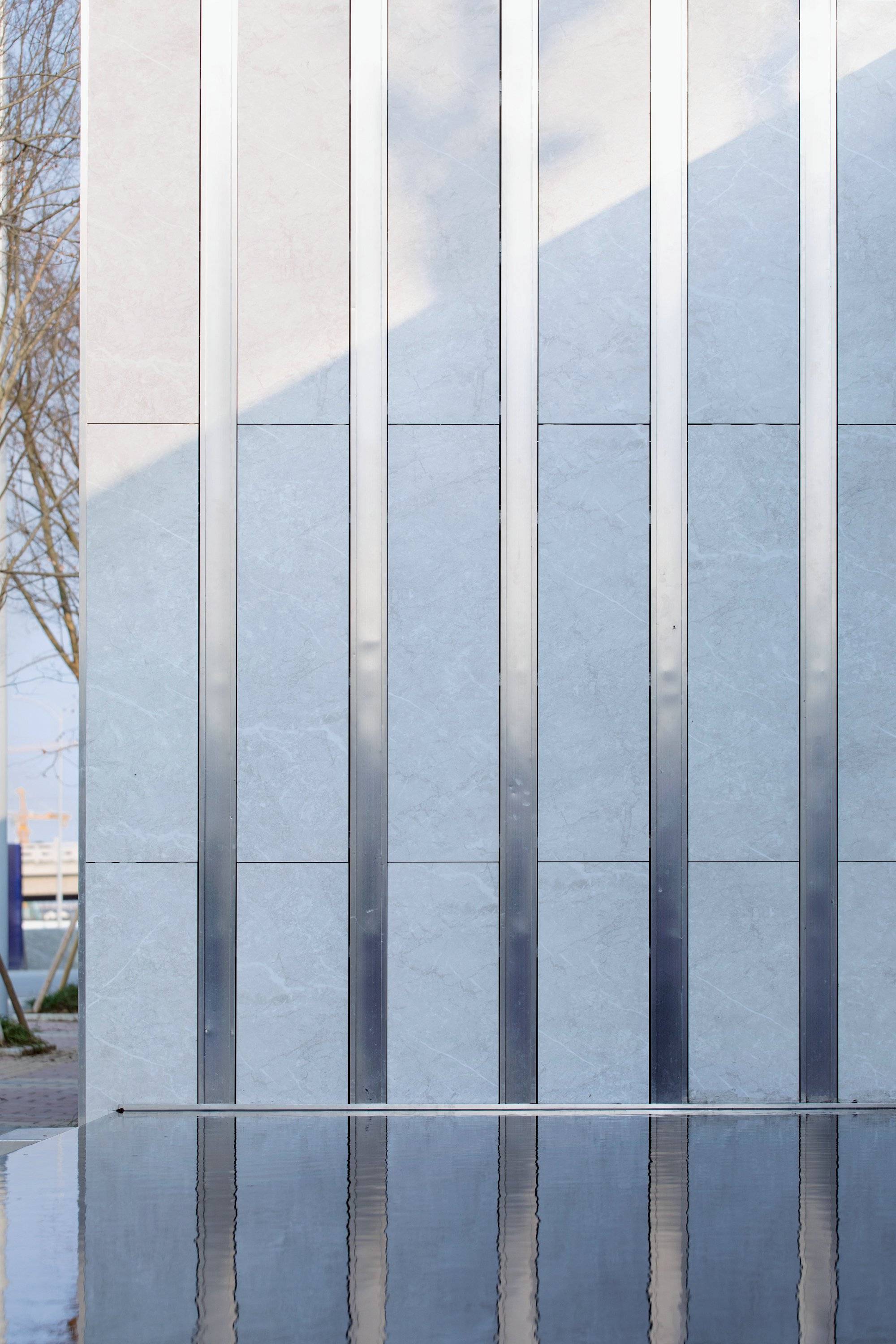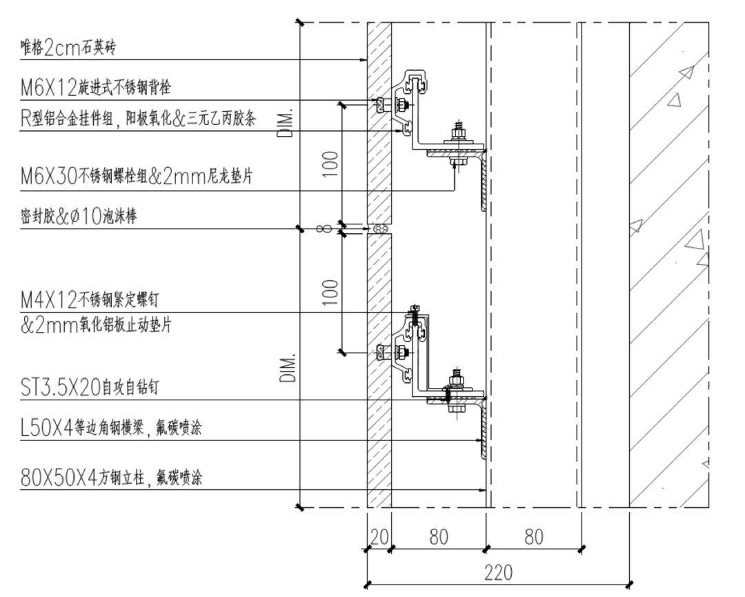 ■ 面層材料:考慮石材材料在二次使用的破損率,從材料的選擇上選用硬度較高的石英磚,仿石石英磚在硬度符合干掛性能要求同時兼顧較好的仿石效果。