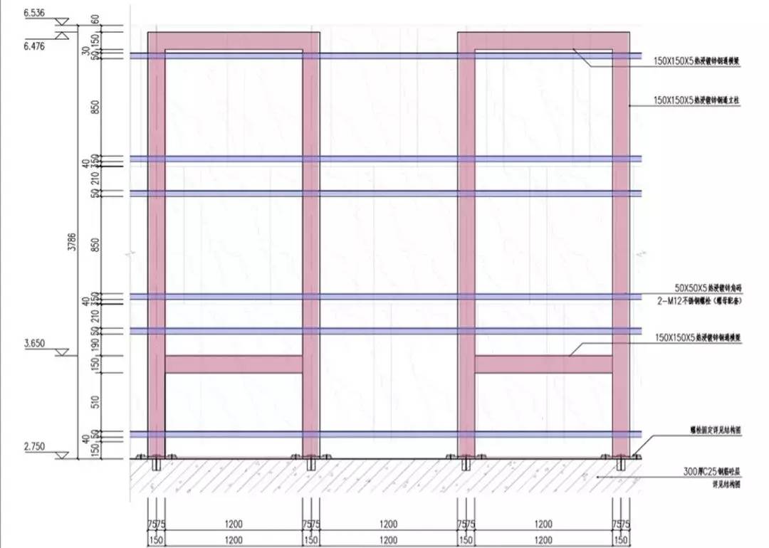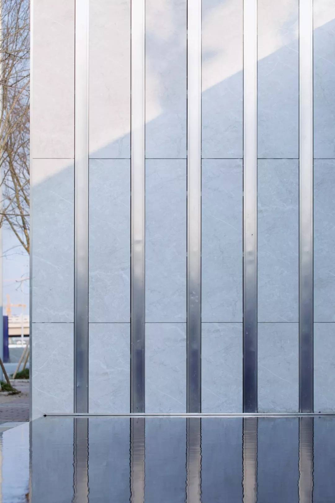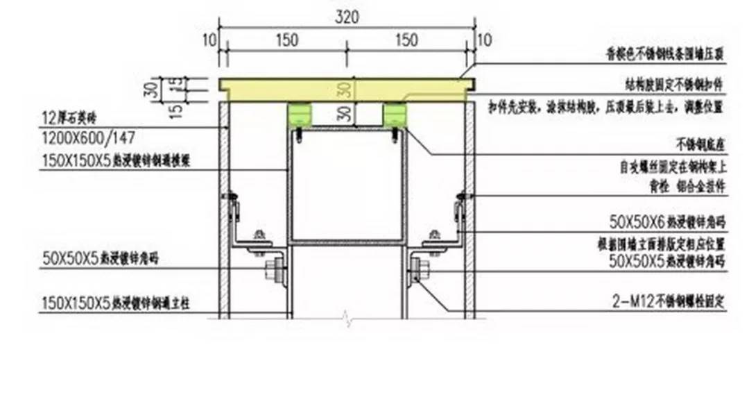 景墻主體結(jié)構(gòu)采用鋼結(jié)構(gòu)、立面石材采用石英磚背栓式固定、石英磚側(cè)面及頂部收口采用不銹鋼鑲嵌。